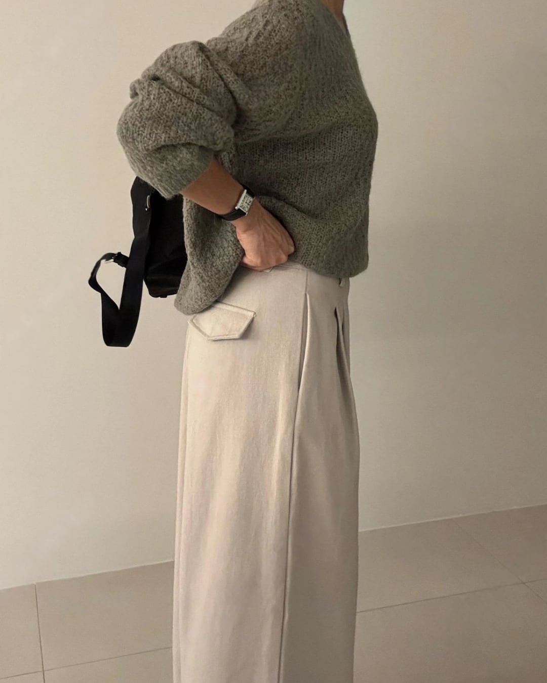 フロントタック入りで腰まわりはすっきりと、脚のラインを自然にカバーしてくれます。