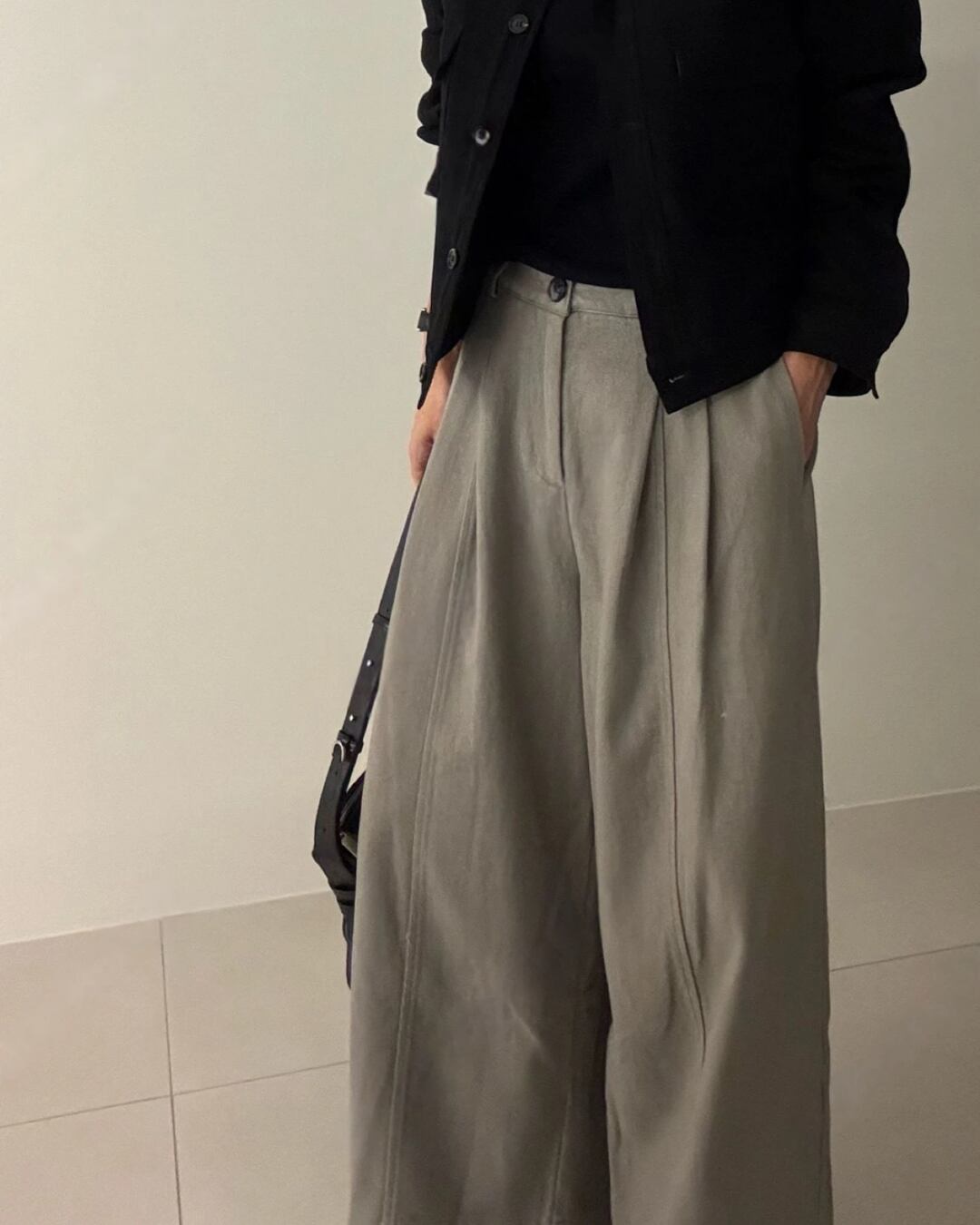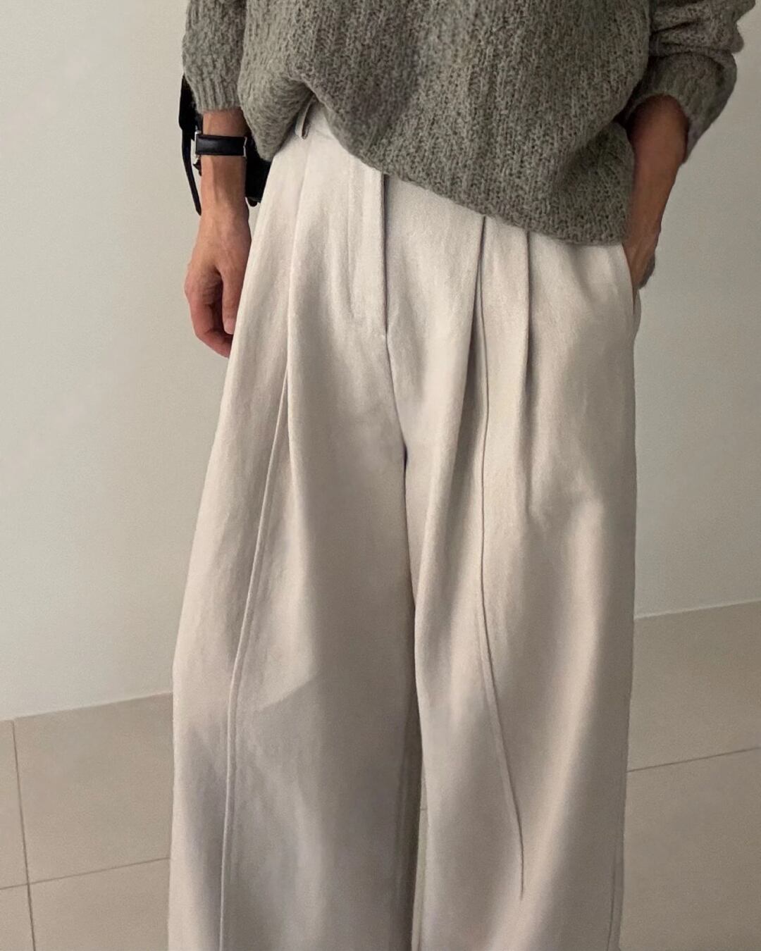 落ち感のある素材と程よいワイドシルエットが魅力のフレンドパンツ。