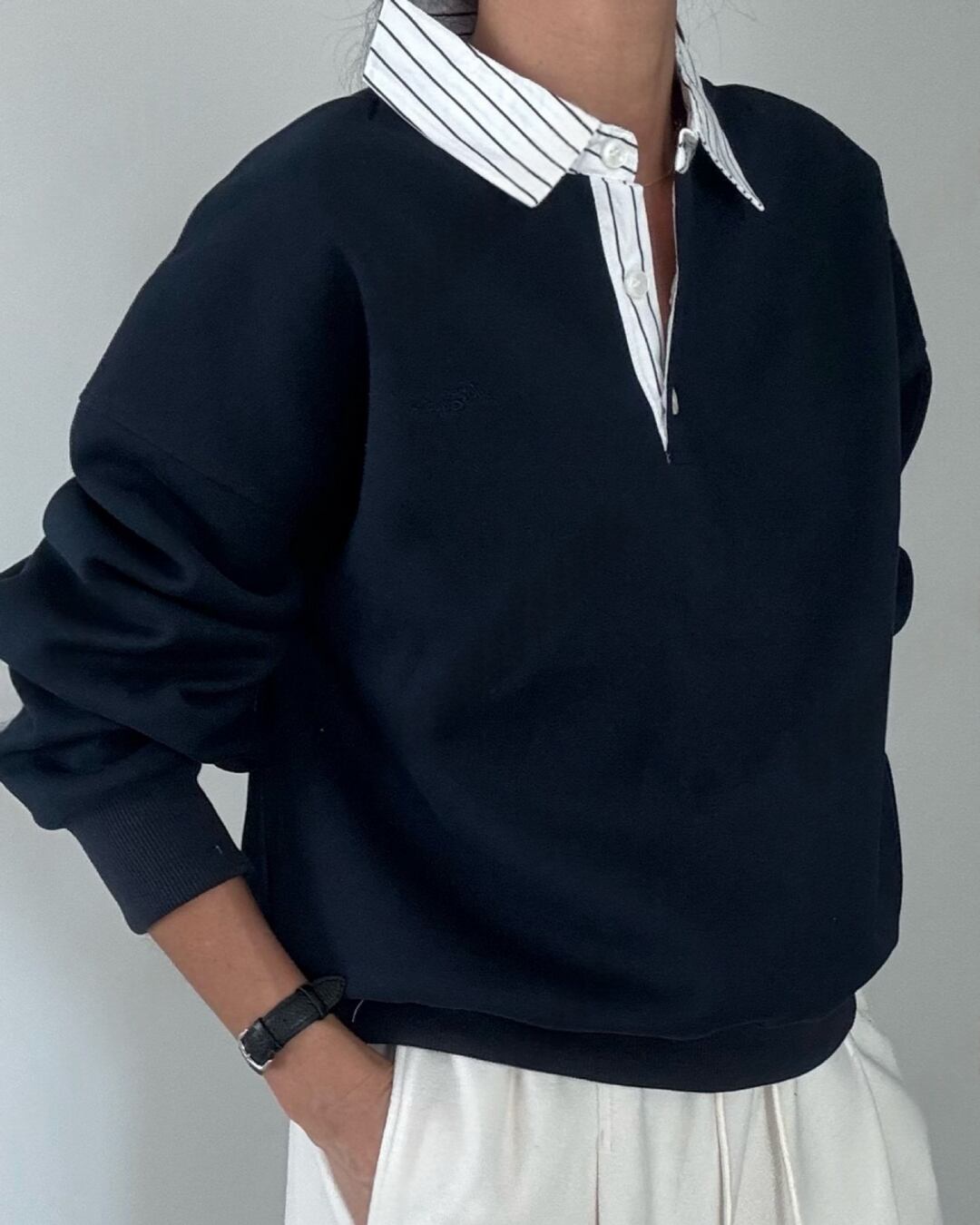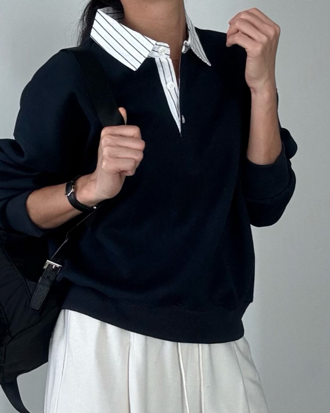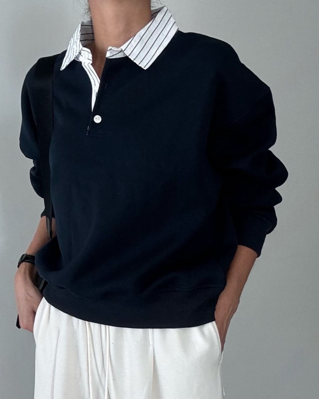 ストライプ柄の襟元とボタンディテールが、カジュアルなスウェットにきちんと感をプラスします。程よくゆとりのあるシルエットで、パンツにもスカートにも合わせやすく、デイリーからきれいめカジュアルまで幅広く活躍。1枚でレイヤードスタイルが完成する、着回し力の高いアイテムです。