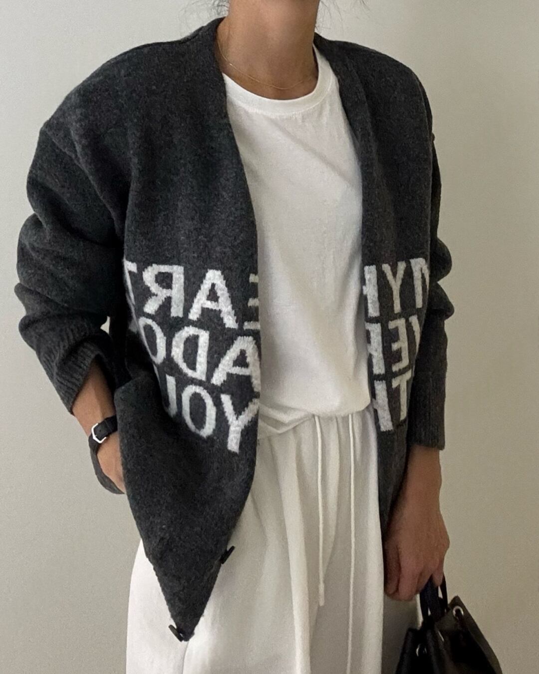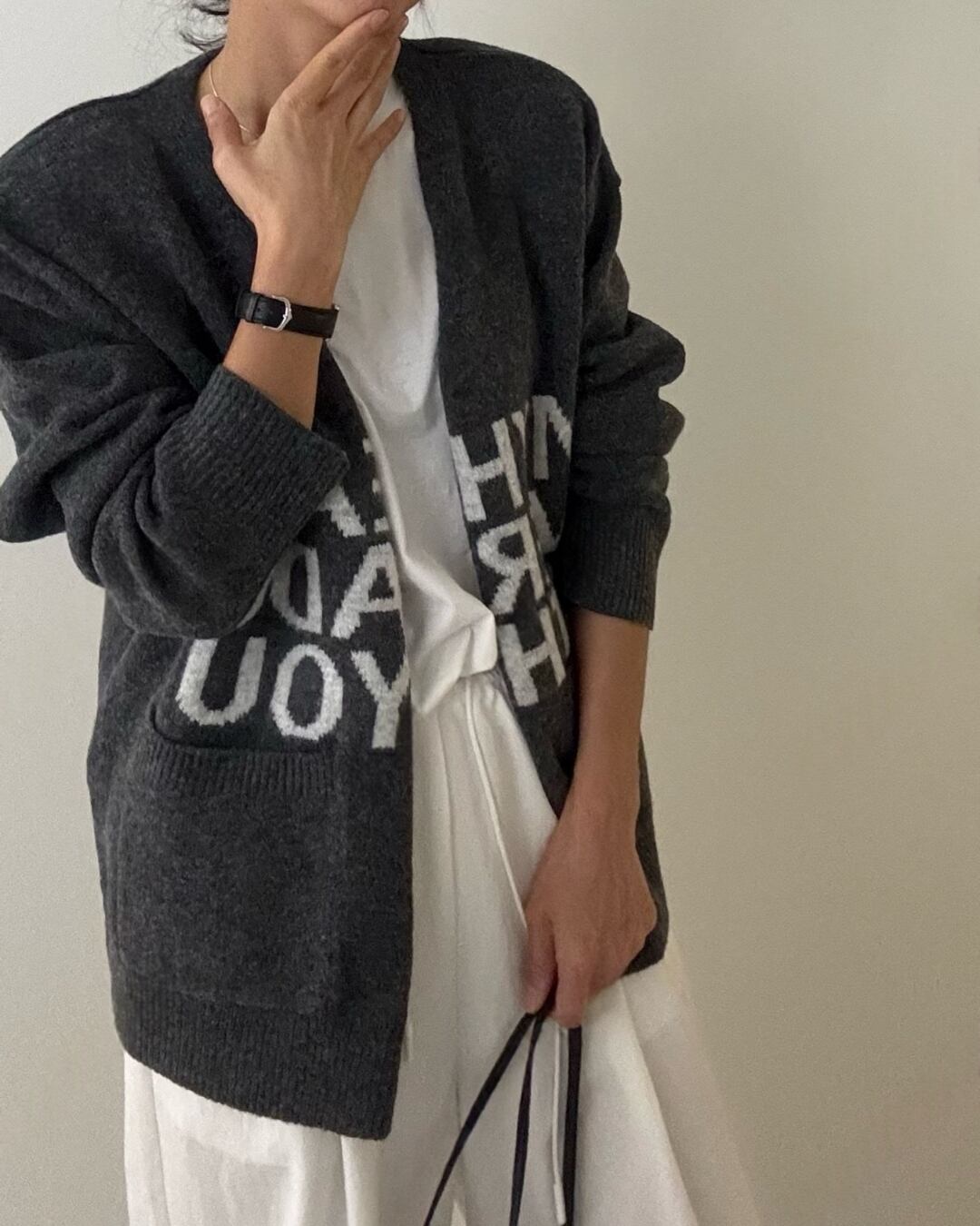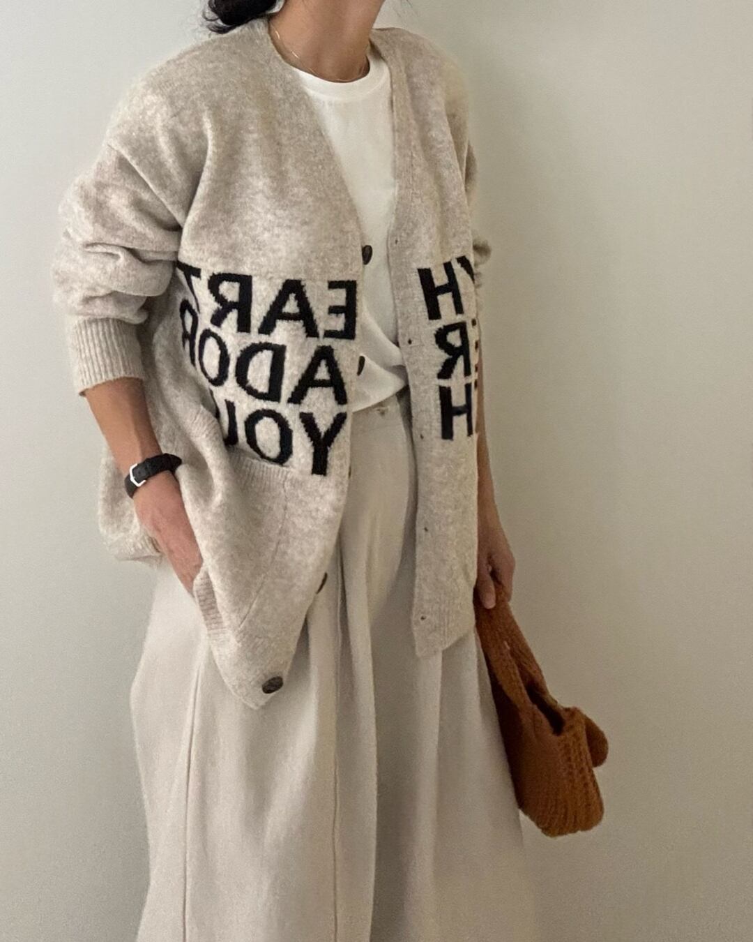 #カーディガン #レタリングデザイン #ニットアイテム #羽織りコーデ #大人カジュアル