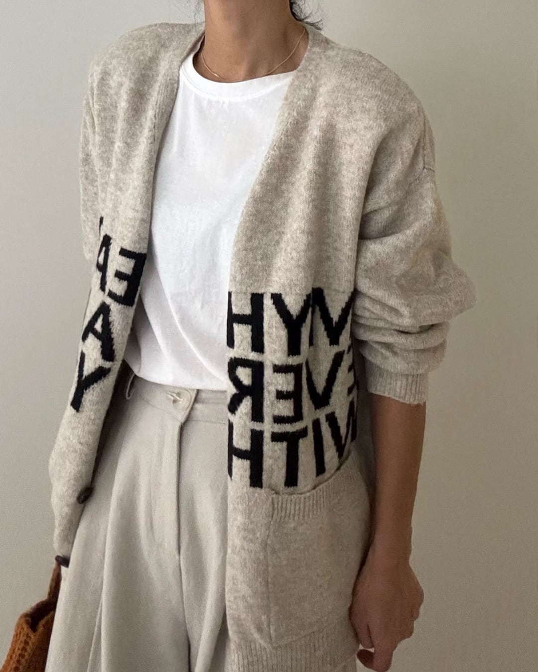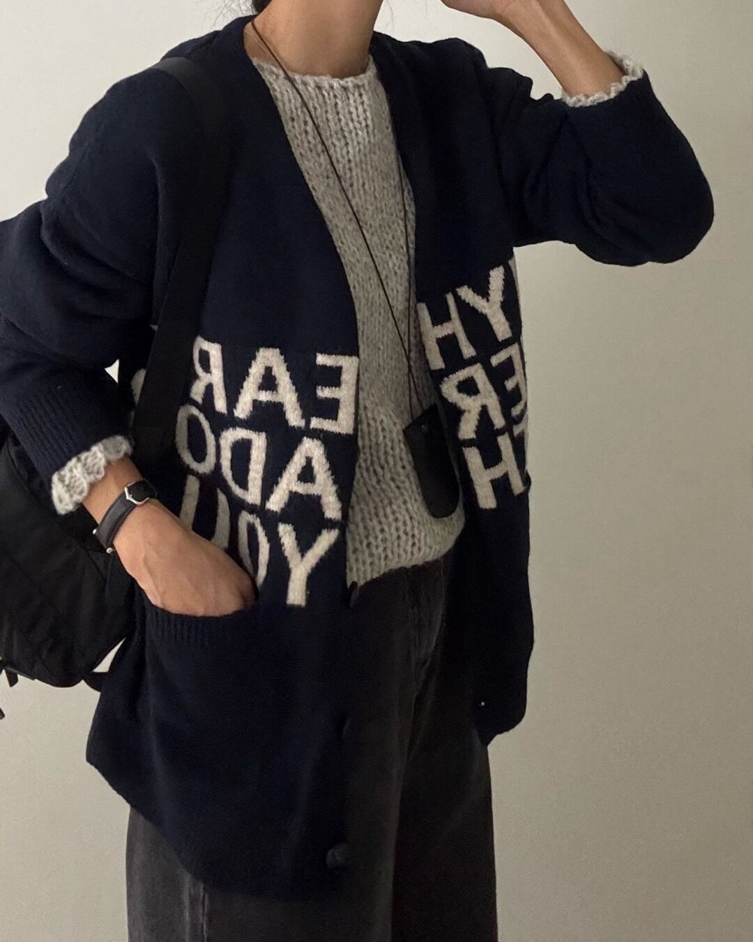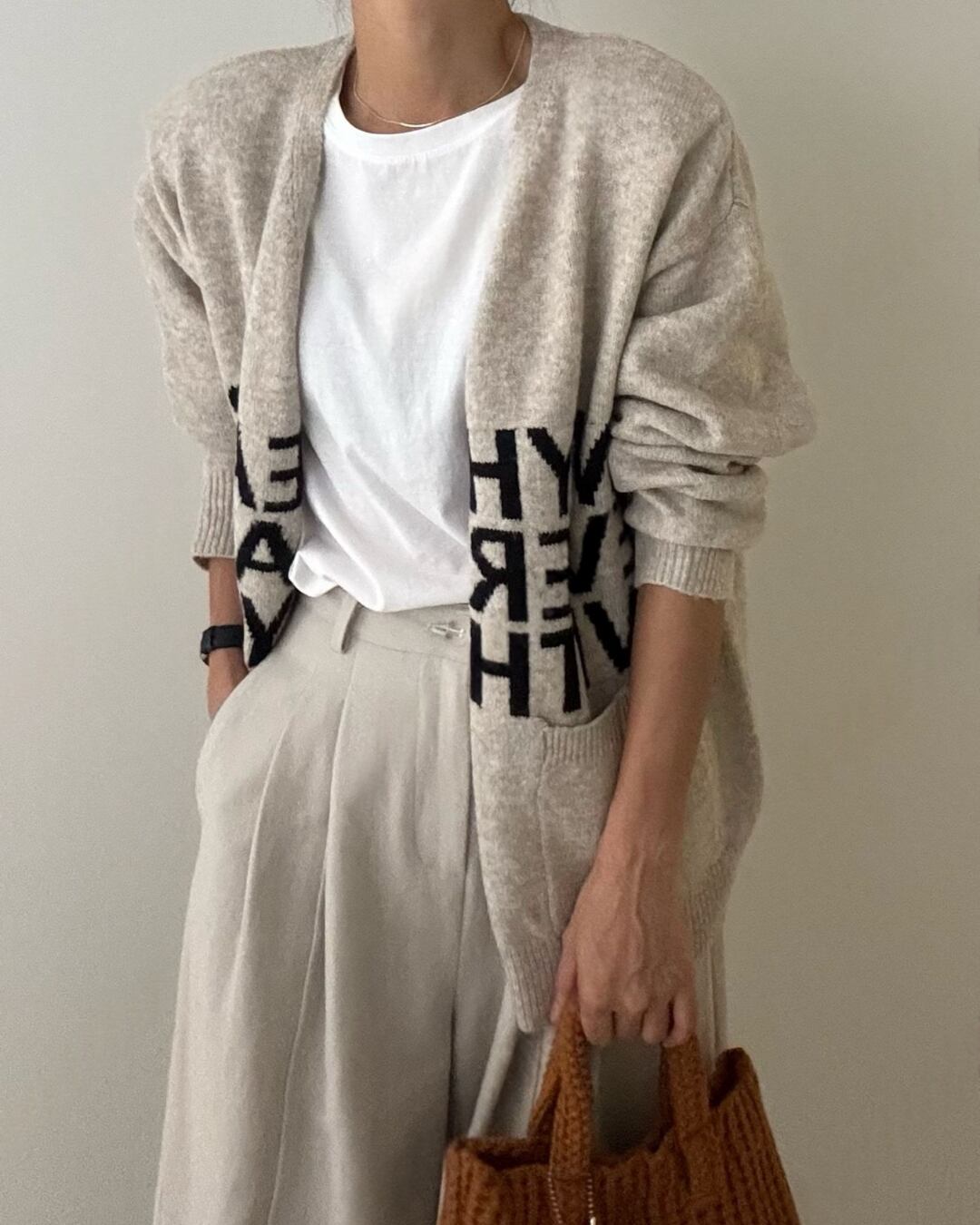 #カーディガン #レタリングデザイン #ニットアイテム #羽織りコーデ #大人カジュアル
