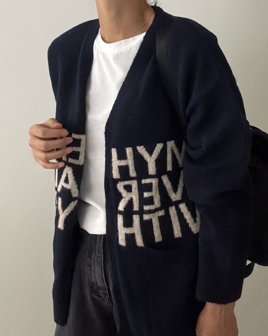 大胆なレタリングデザインが目を惹く、存在感のあるニットカーディガン。