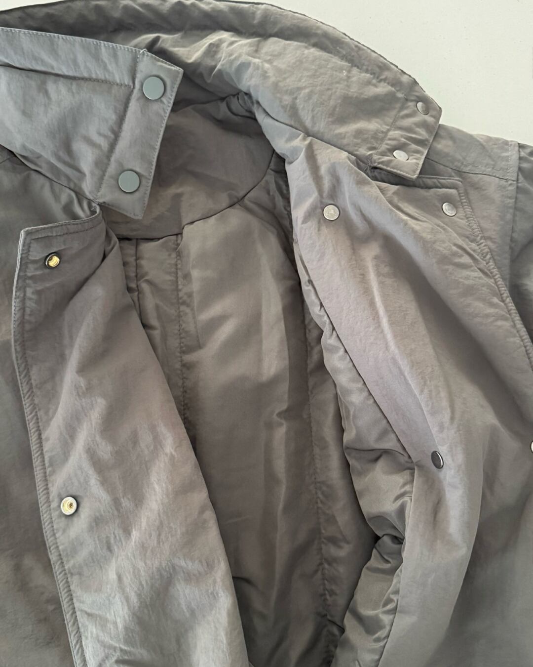 落ち着いたアッシュトーンが大人の雰囲気を演出するロングパディングコート。