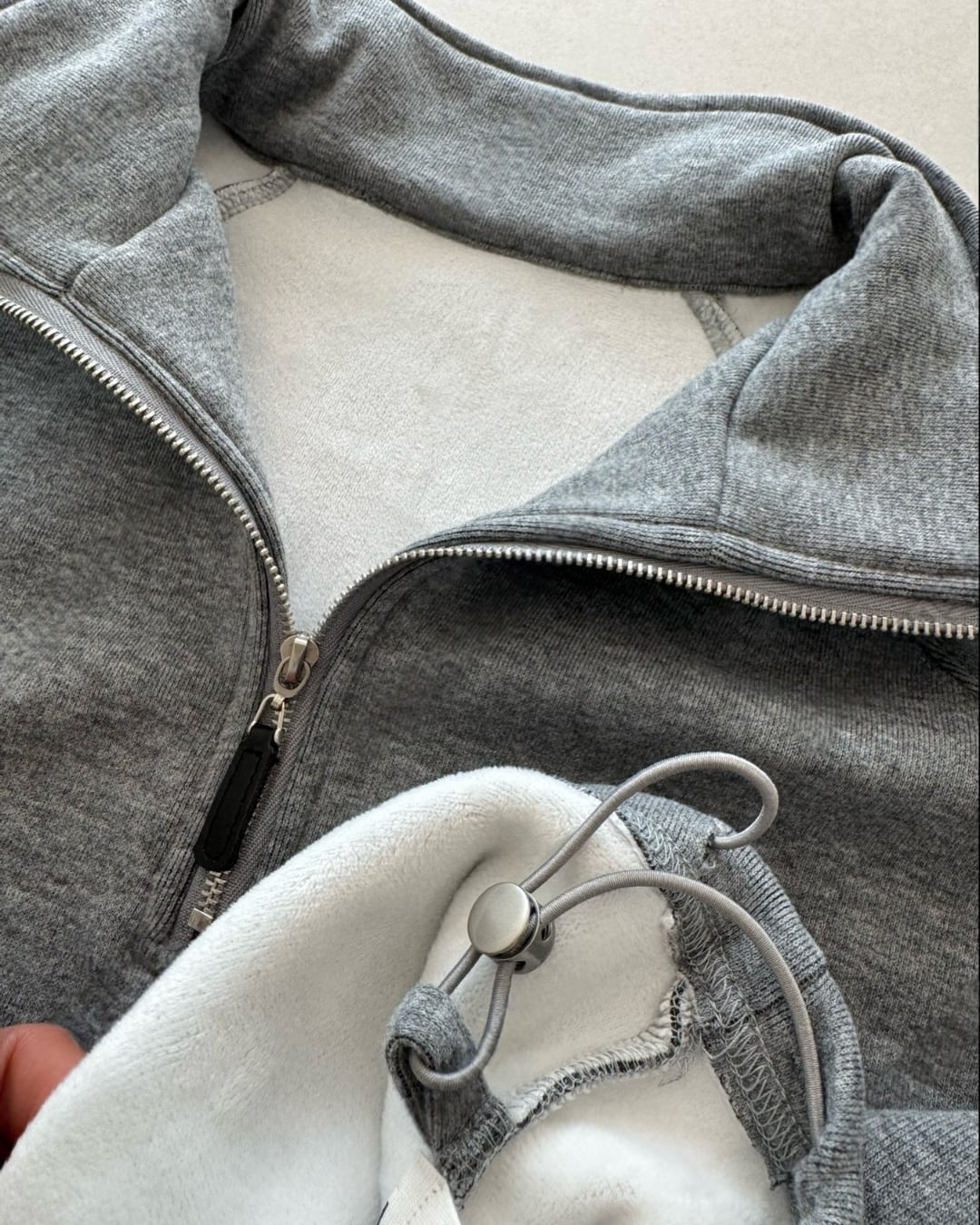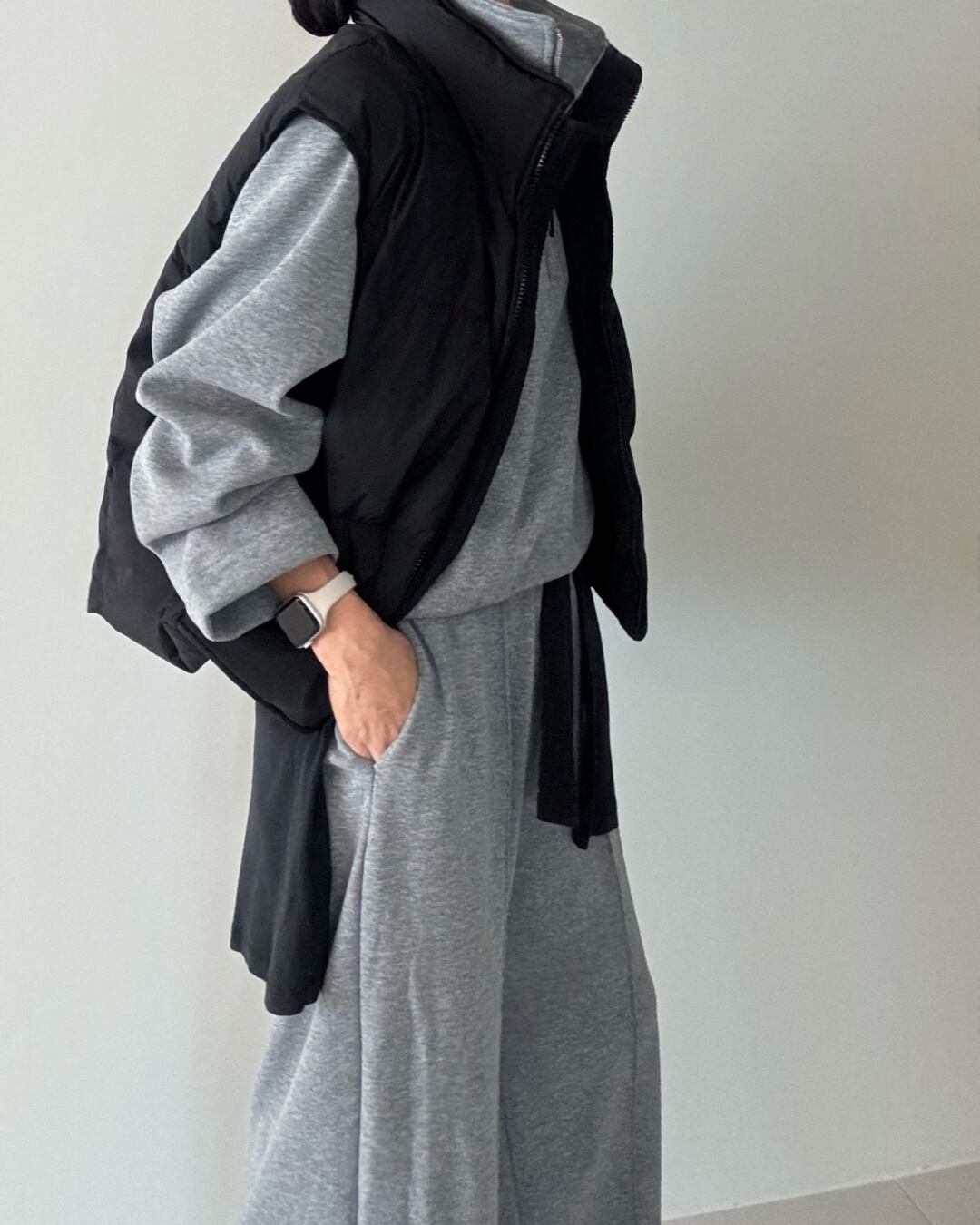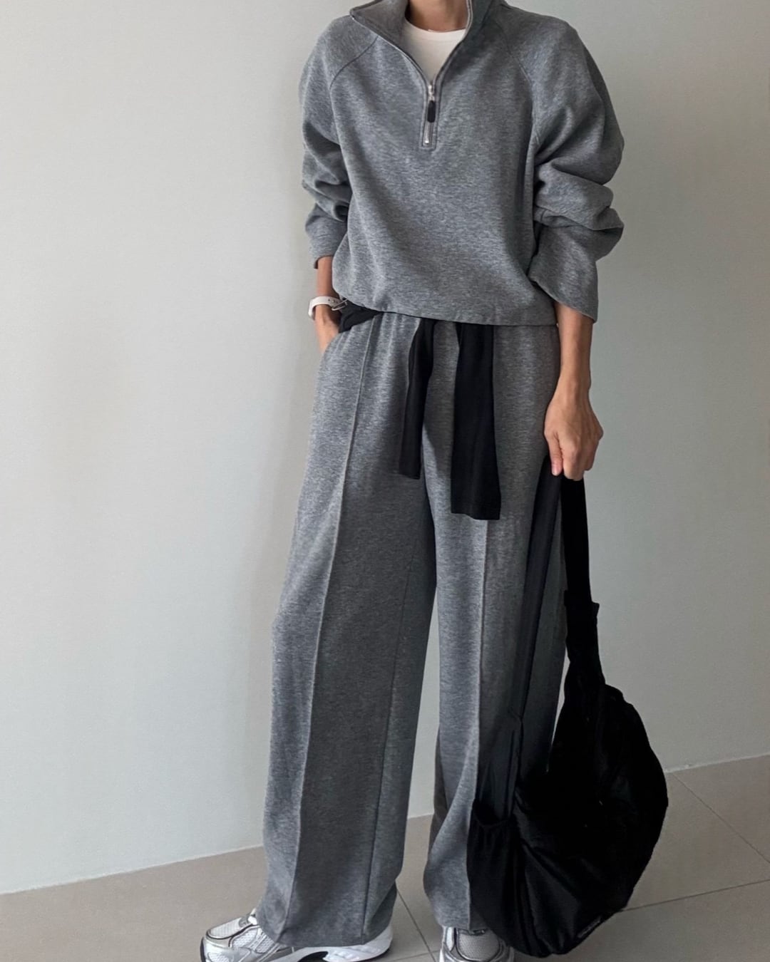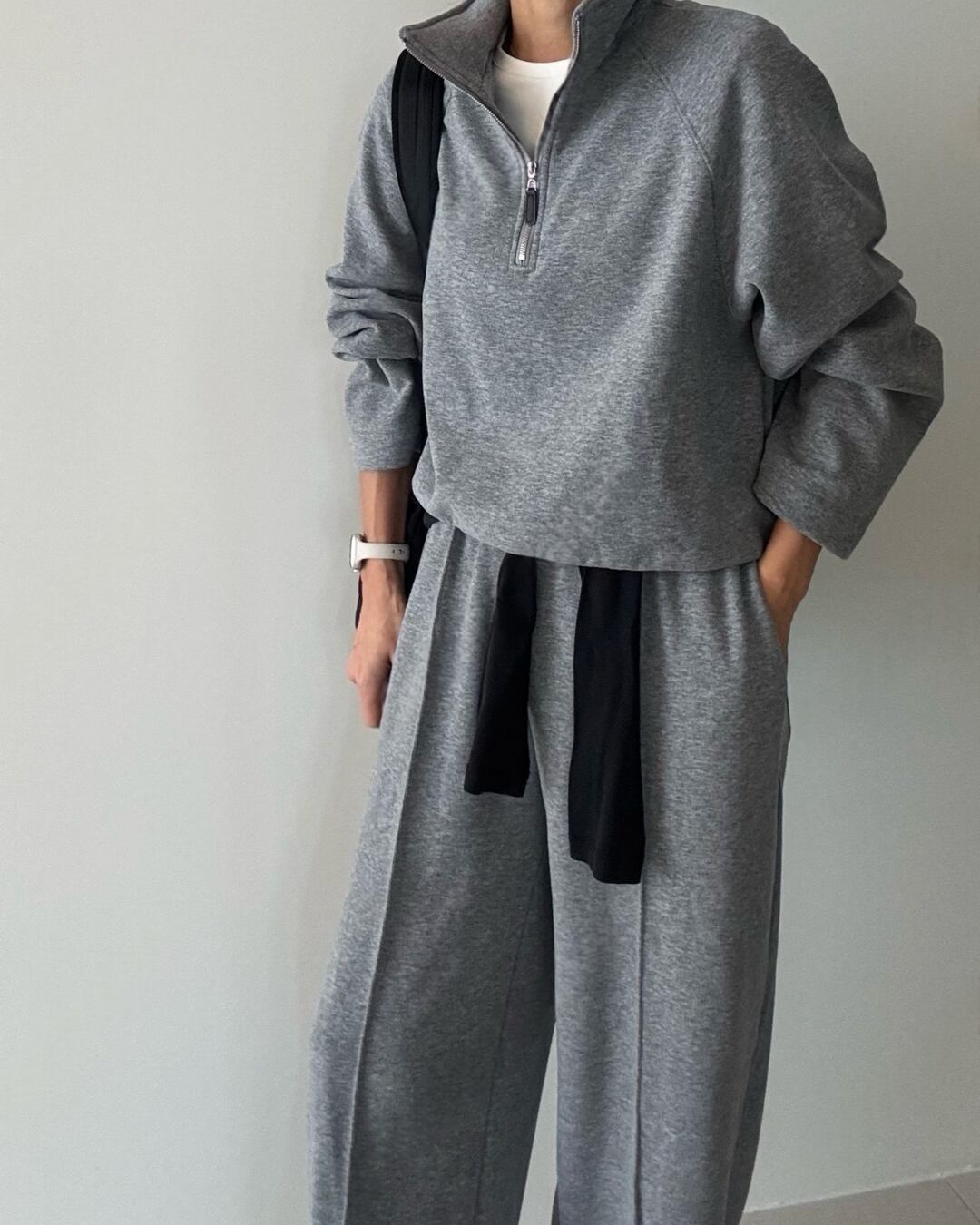 シンプルでリラックス感あるグレーのスウェットセットアップ。ワイドパンツと合わせてカジュアルに決まる一着。快適さとスタイルを兼ね備えたデイリーユースにぴったりなアイテムです。
