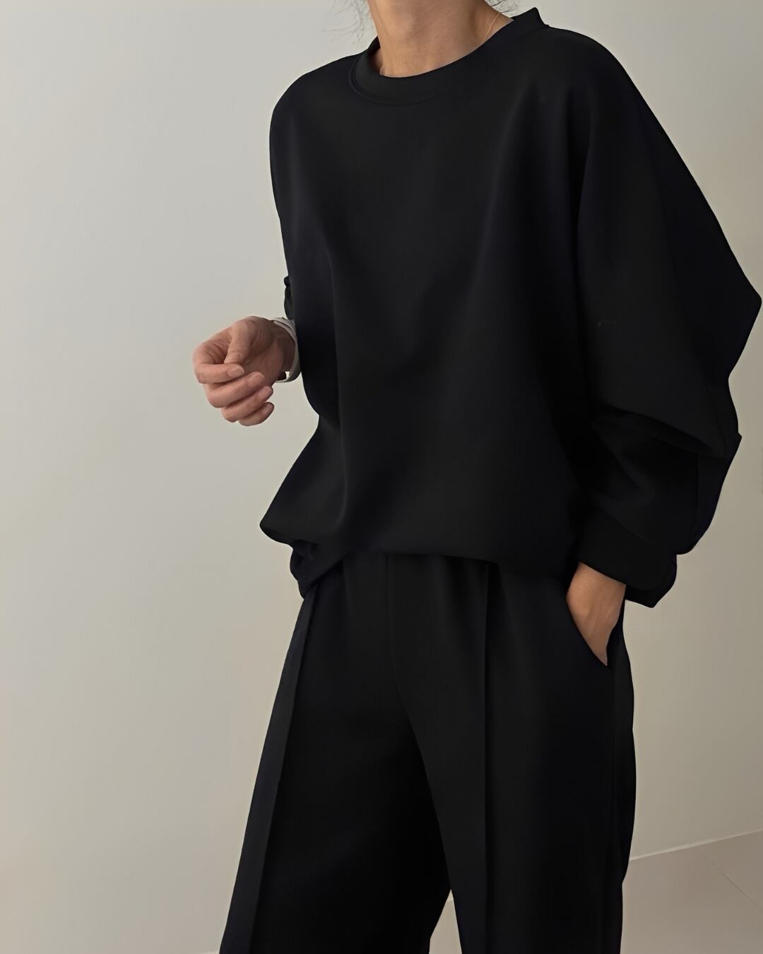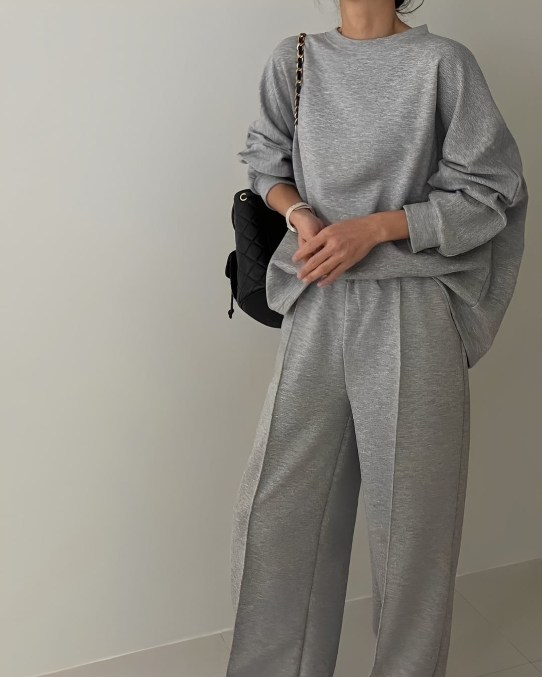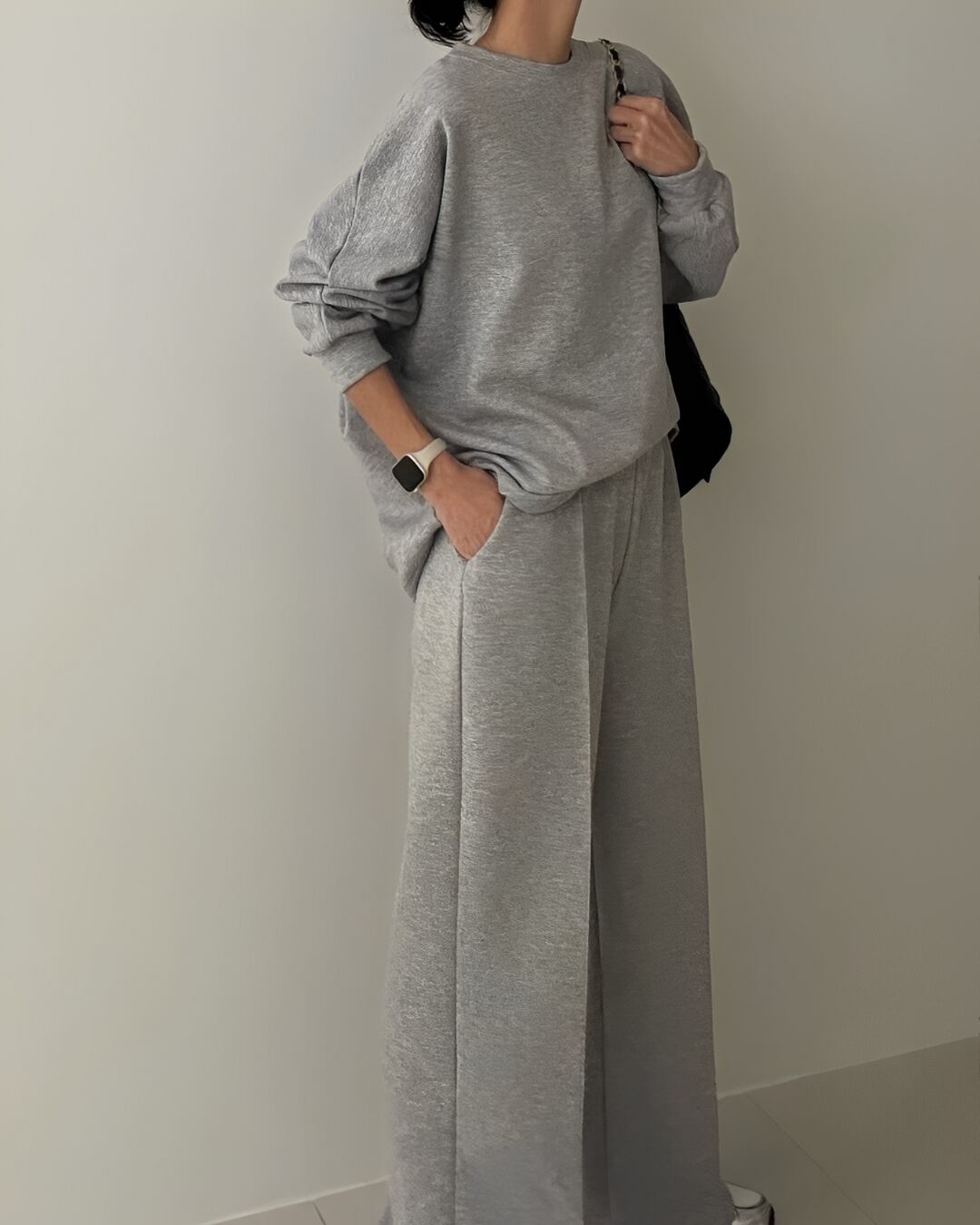 裏地が起毛になっていて肌触りが良く、リラックスした着心地のセットアップ。シンプルでありながら、リラックス感を大切にしたデザインが魅力的です。