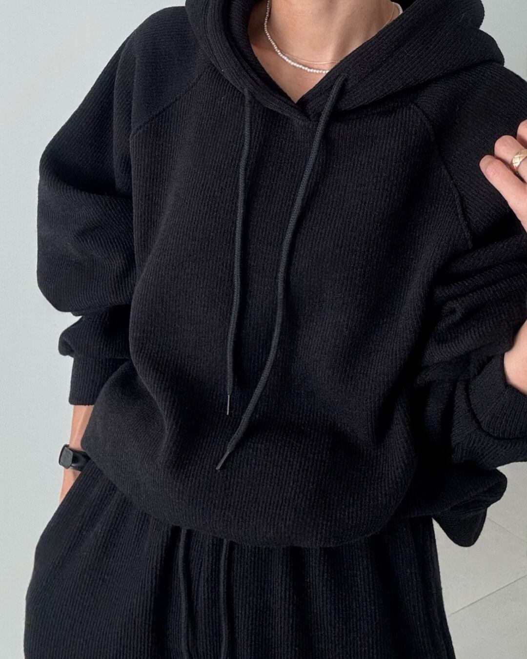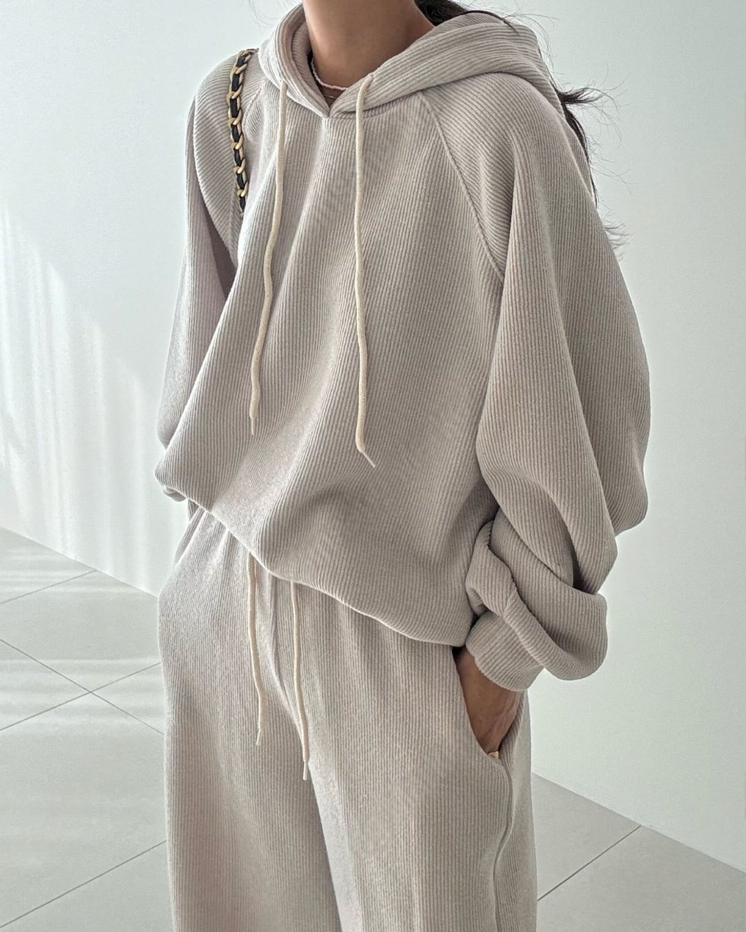 リブニット地で仕上げたフード付きの裏起毛セット。トップスとワイドパンツのセットで、暖かくリラックスしたコーディネートに最適です。カジュアルでありながら上品な印象。