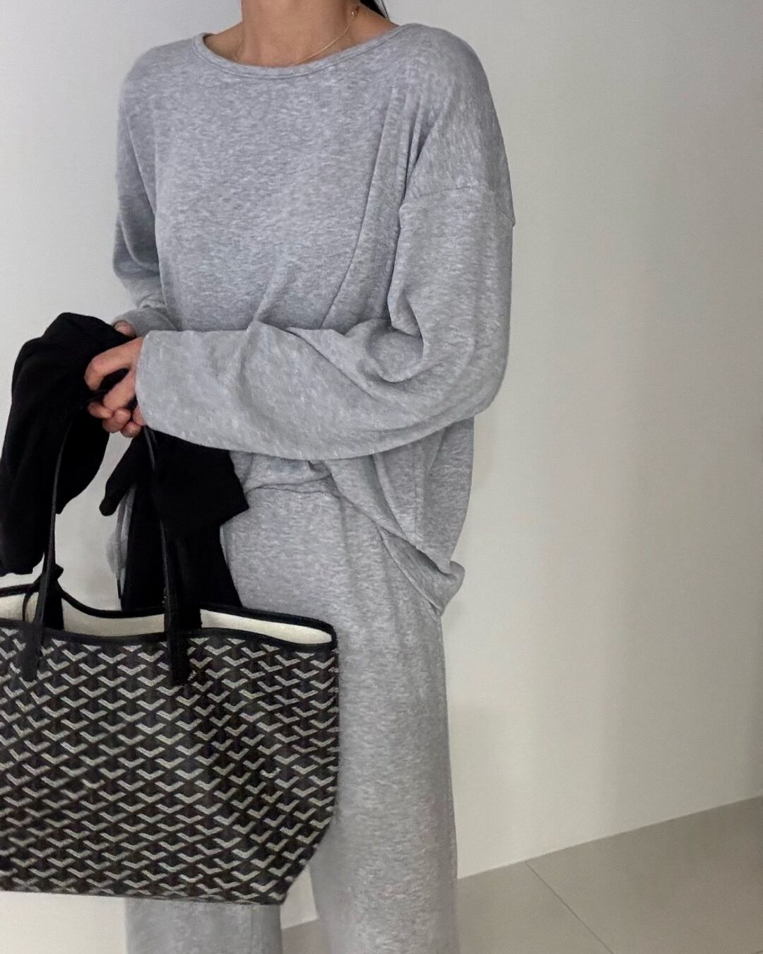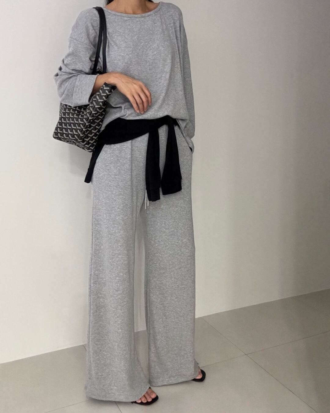 柔らかくストレッチ性のあるポリエステル混素材で仕立てたルーズフィットのセットアップ。ブラック、グレー、クリームの落ち着いた色展開で、リラックス感のあるデイリースタイルにぴったりです。