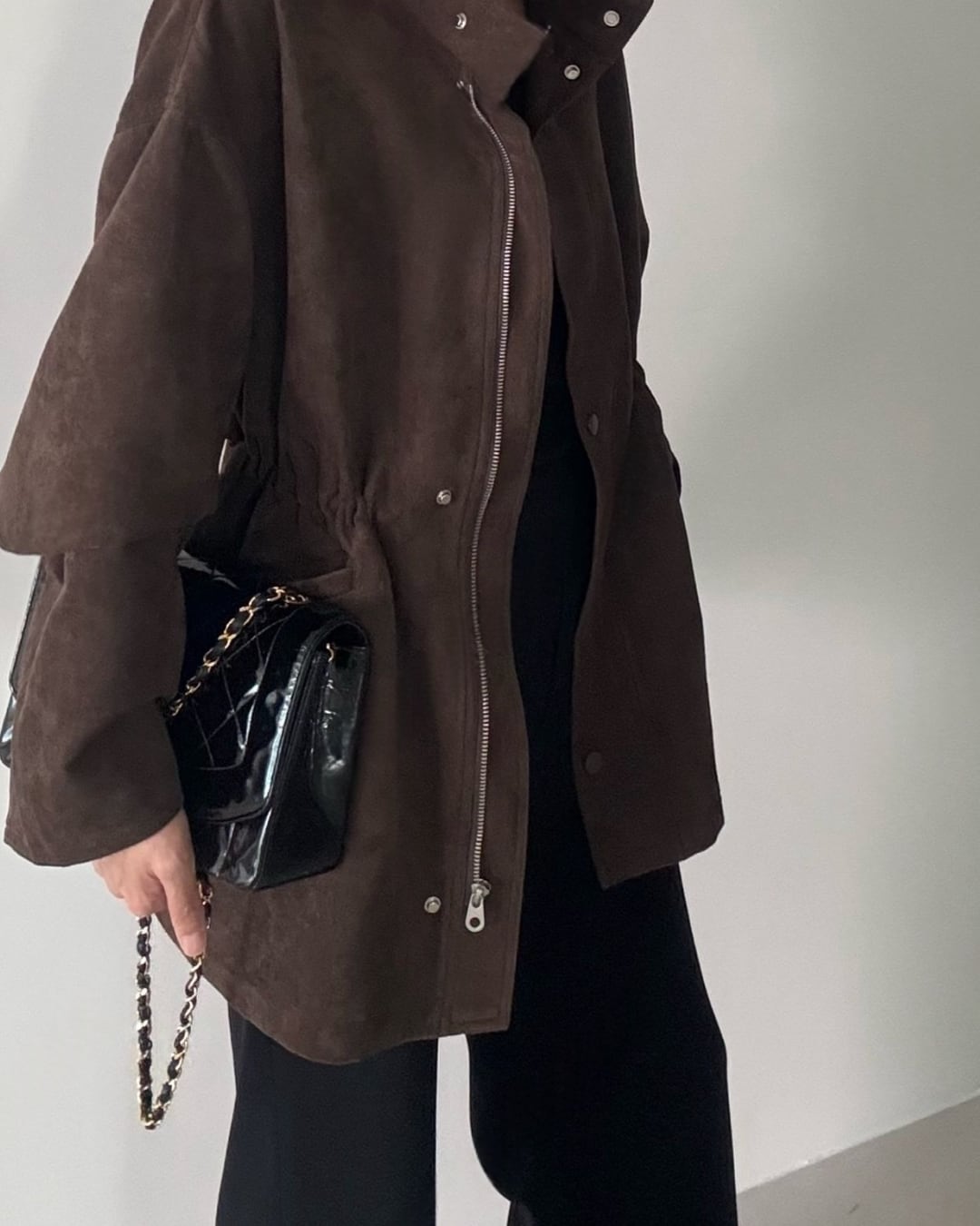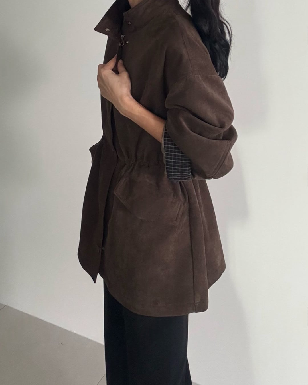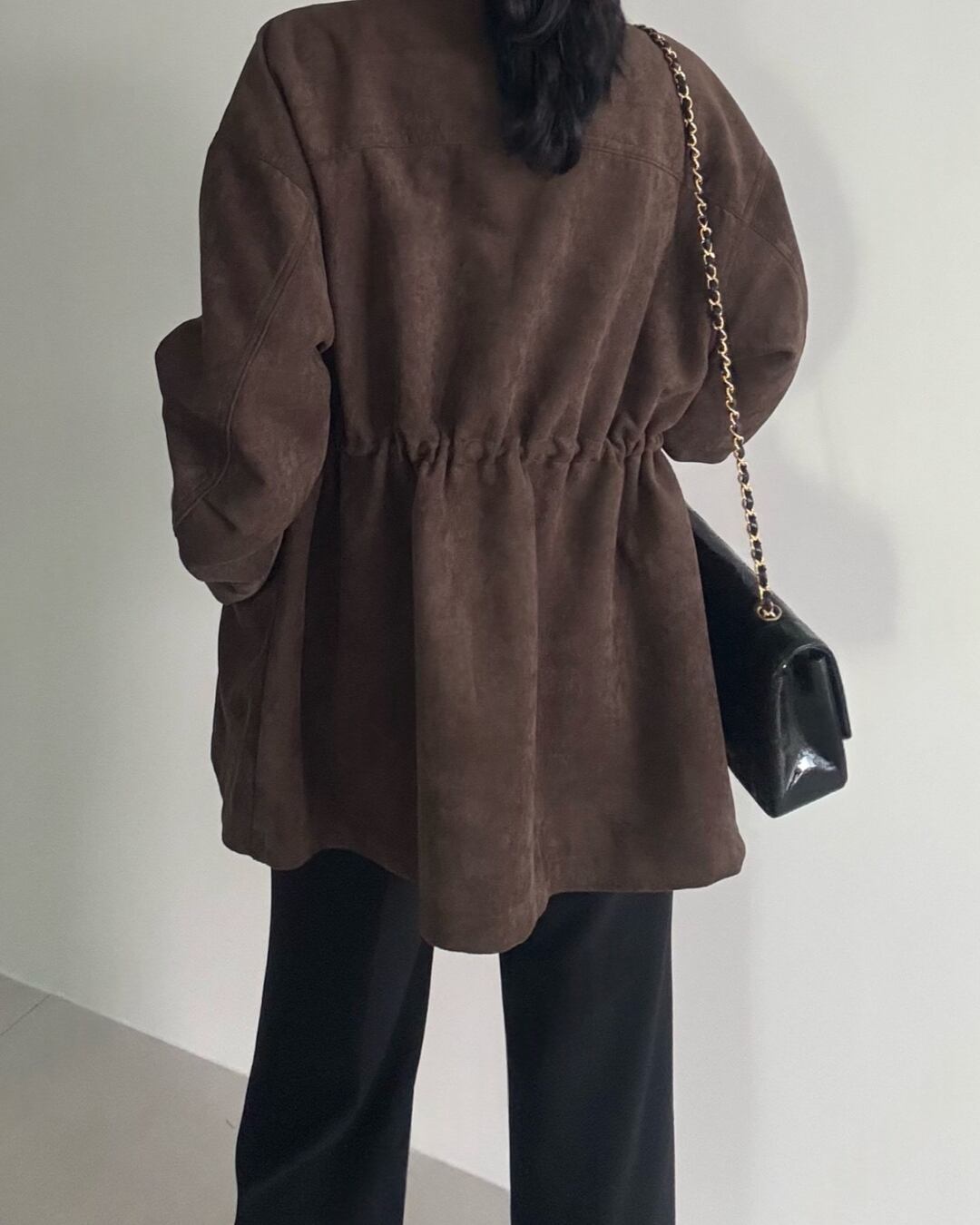 マットなスエード調素材を使用した、リラックスシルエットのショートブルゾン。フロントジップ&スナップボタン付きで着脱しやすく、ウエスト部分のドローストリングでシルエット調整も可能。ダークブラウン・ブラックのシックなカラー展開で、秋冬コーデのアクセントにぴったりの1枚です。