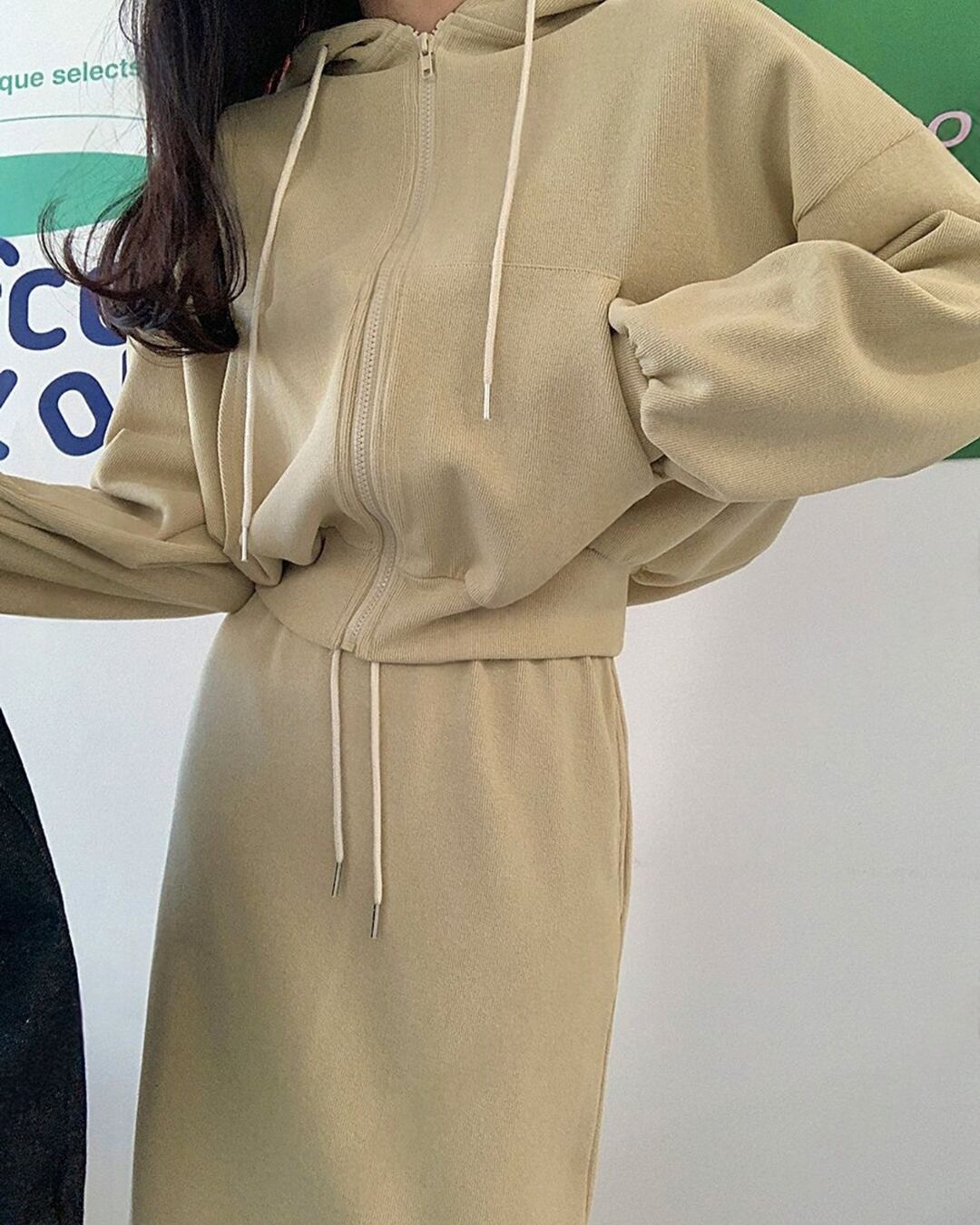 柔らかく伸縮性のあるコットン素材で仕立てた、リラックス感のあるロングスカートフードセット。ウエストはゴム&ドローストリング仕様で着脱しやすく、動きやすいデザイン。ベーシックカラーからアクセントカラーまで、幅広いスタイリングに対応可能です。