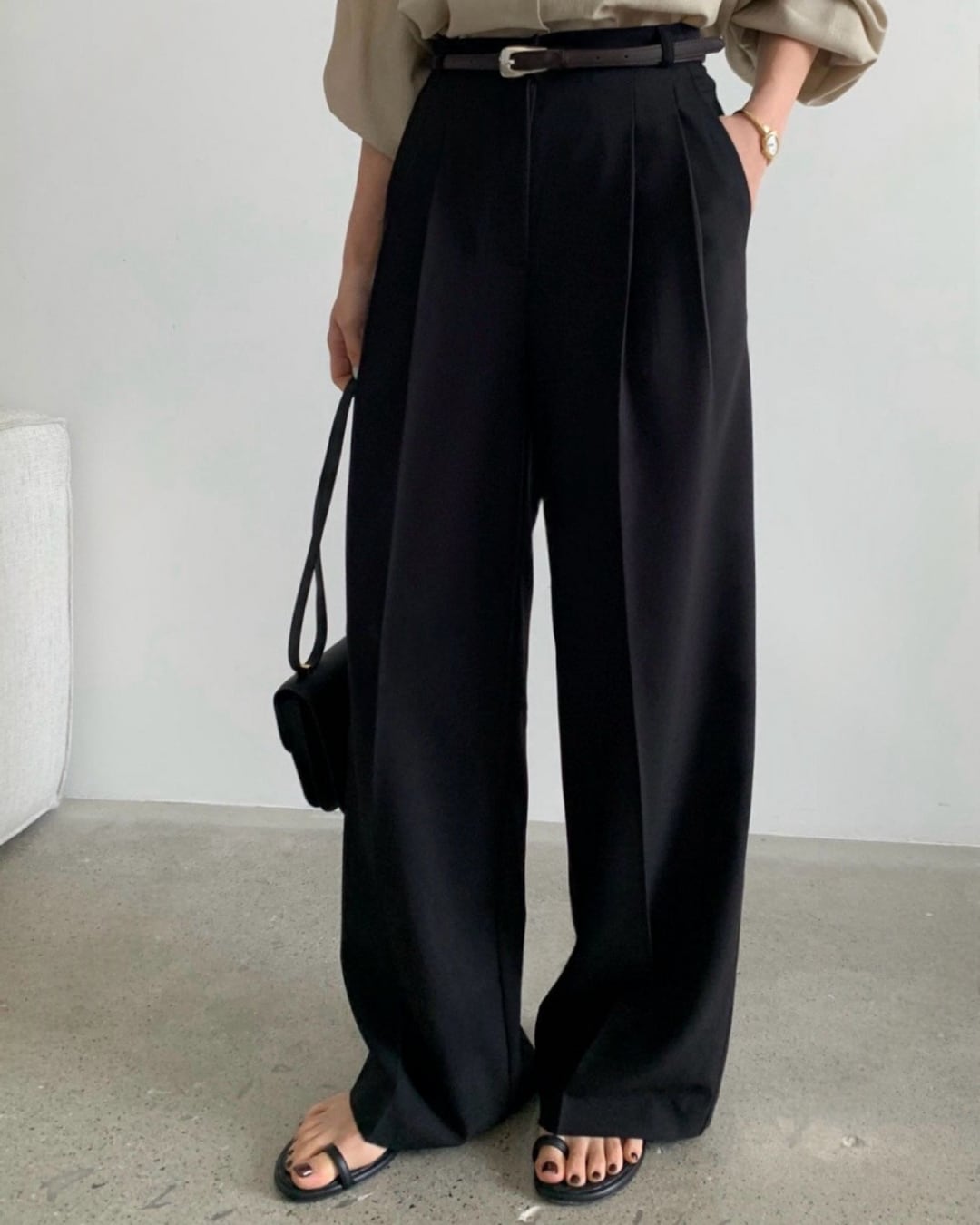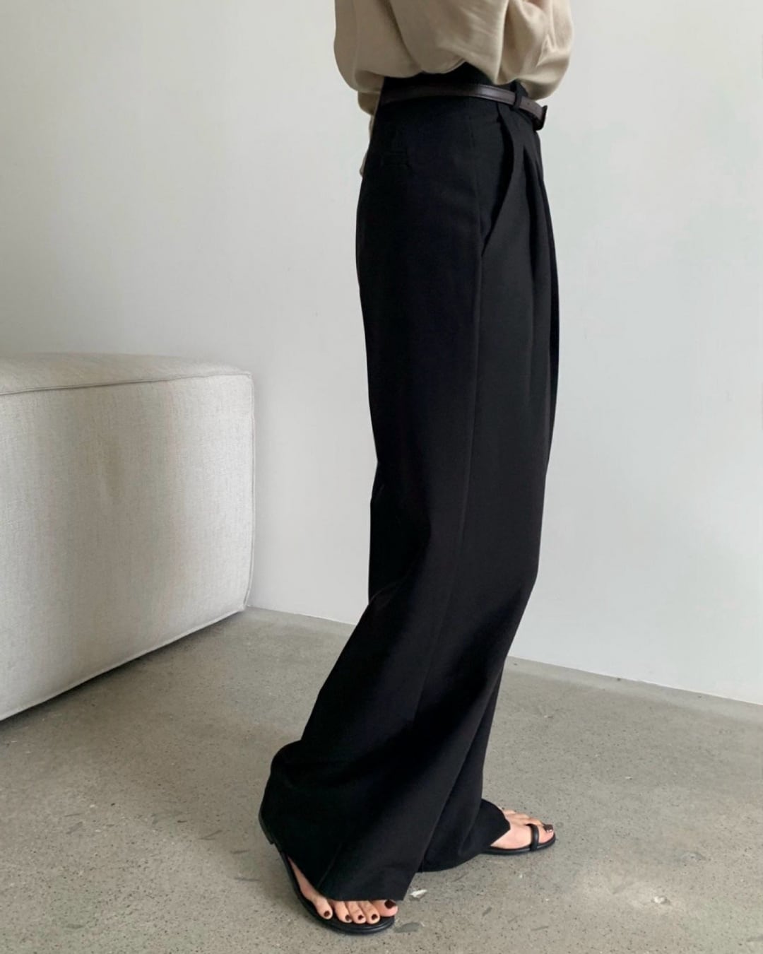 立体感のあるツープリーツデザインが美しいシルエットを演出するワイドスラックス。落ち感のある素材で脚のラインを拾いにくく、きれいめからカジュアルまで幅広く対応。オンオフ問わず活躍する、着回し力の高い一本です。