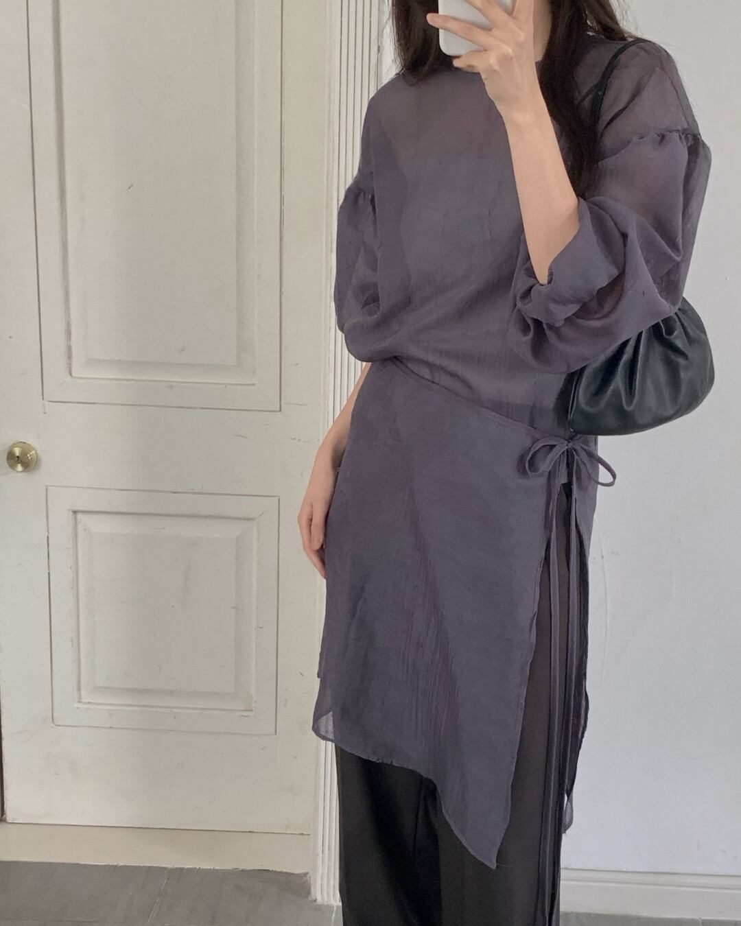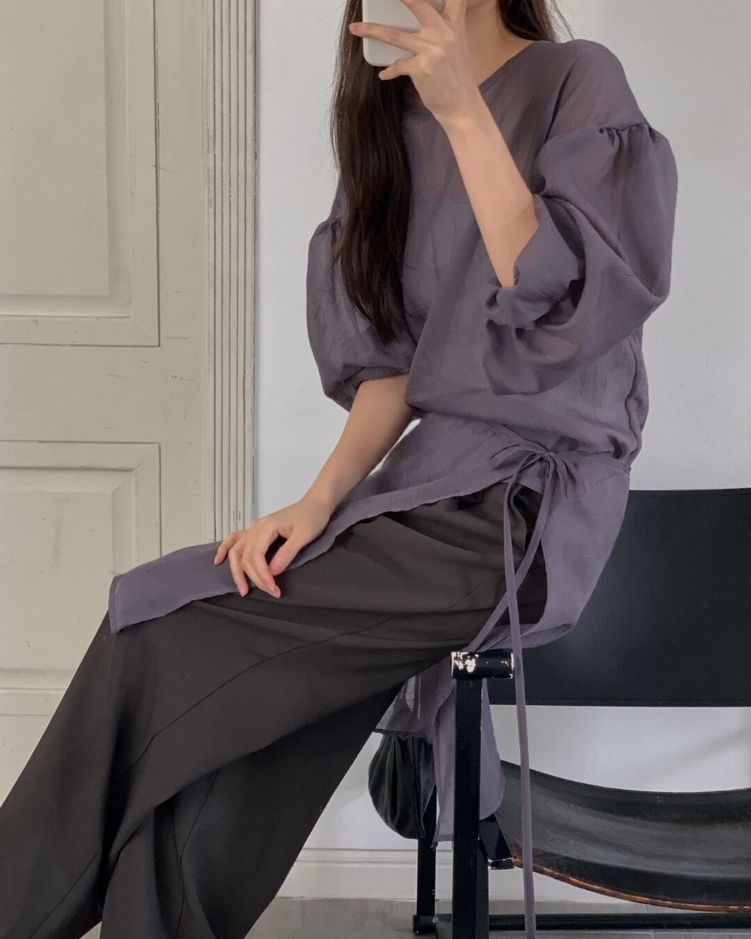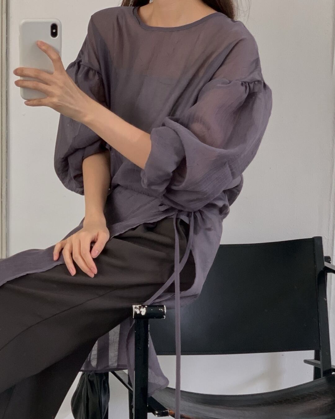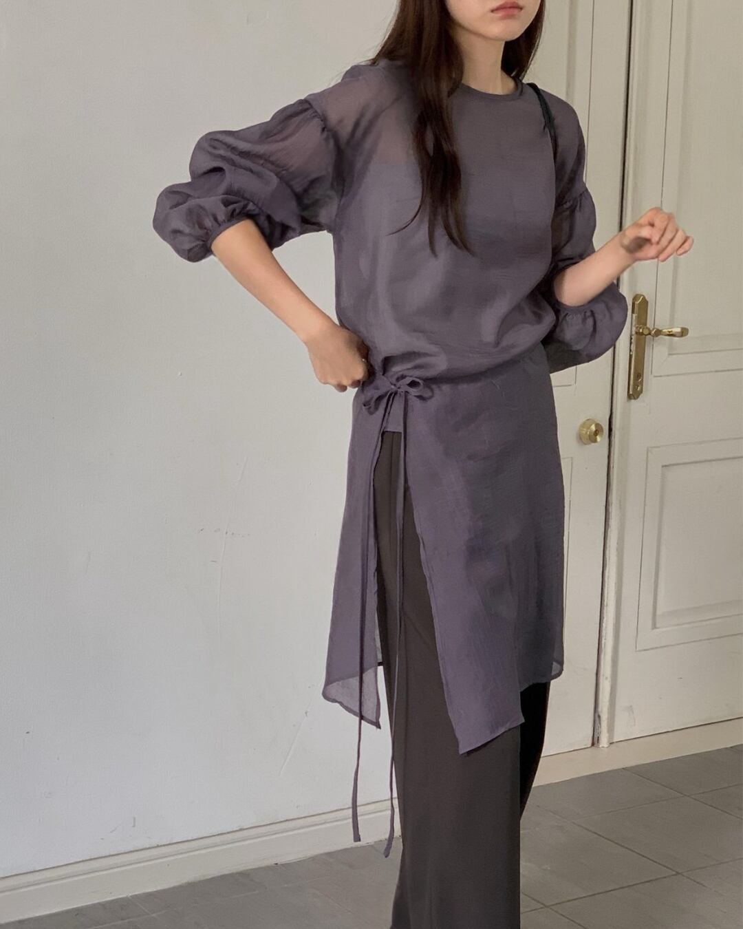 シアー素材のブラウスで、フェミニンで華やかな印象を与えます。ふんわりとしたボリュームスリーブが特徴的で、シンプルなパンツやスカートと合わせて大人のカジュアルスタイルを演出できます。透け感のある素材感で、春や秋にぴったりのアイテムです。
