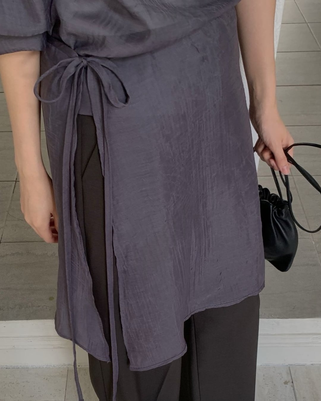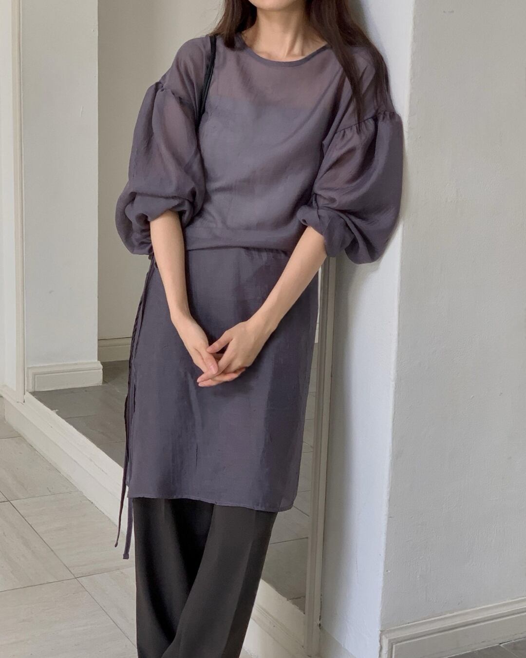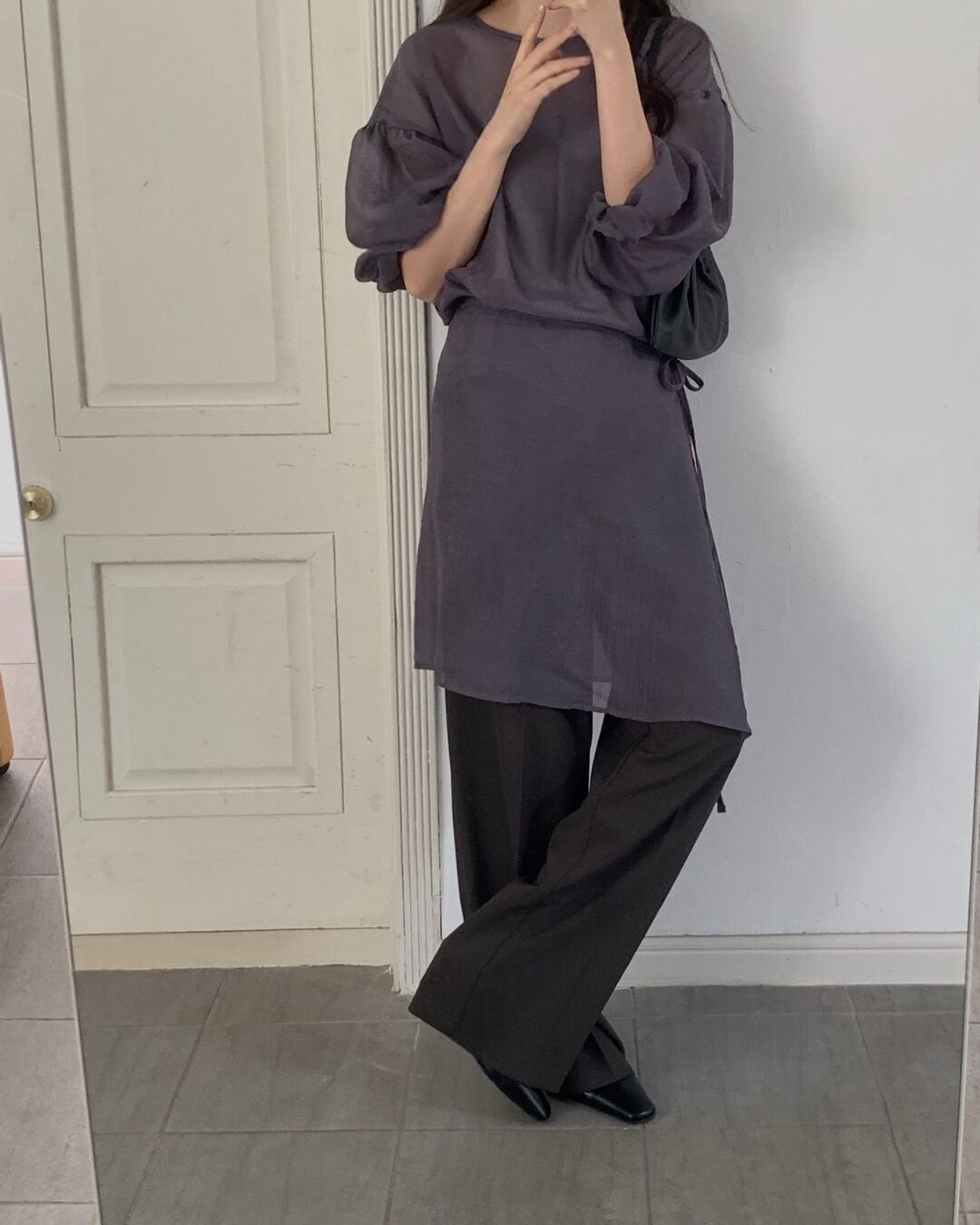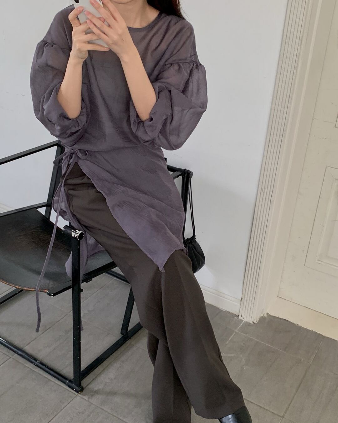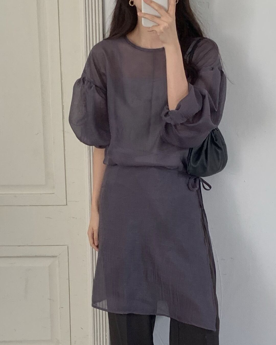 シアー素材のブラウスで、フェミニンで華やかな印象を与えます。ふんわりとしたボリュームスリーブが特徴的で、シンプルなパンツやスカートと合わせて大人のカジュアルスタイルを演出できます。透け感のある素材感で、春や秋にぴったりのアイテムです。