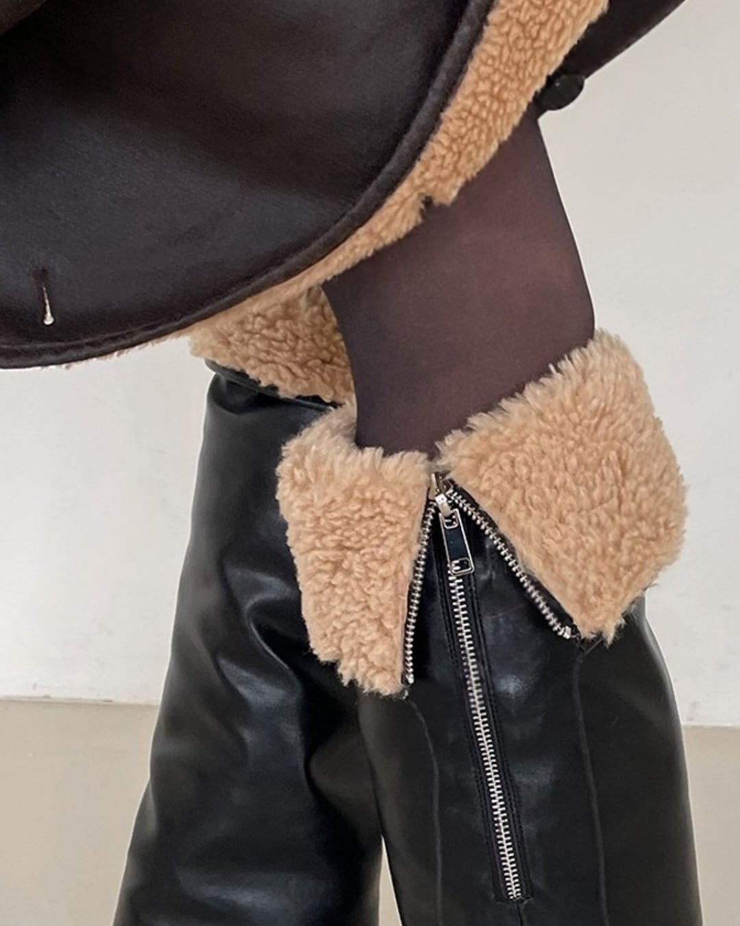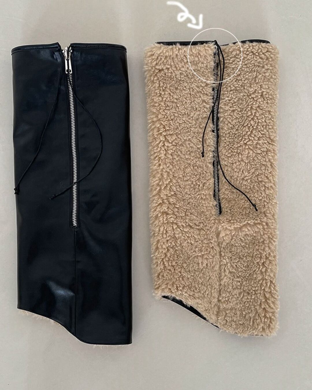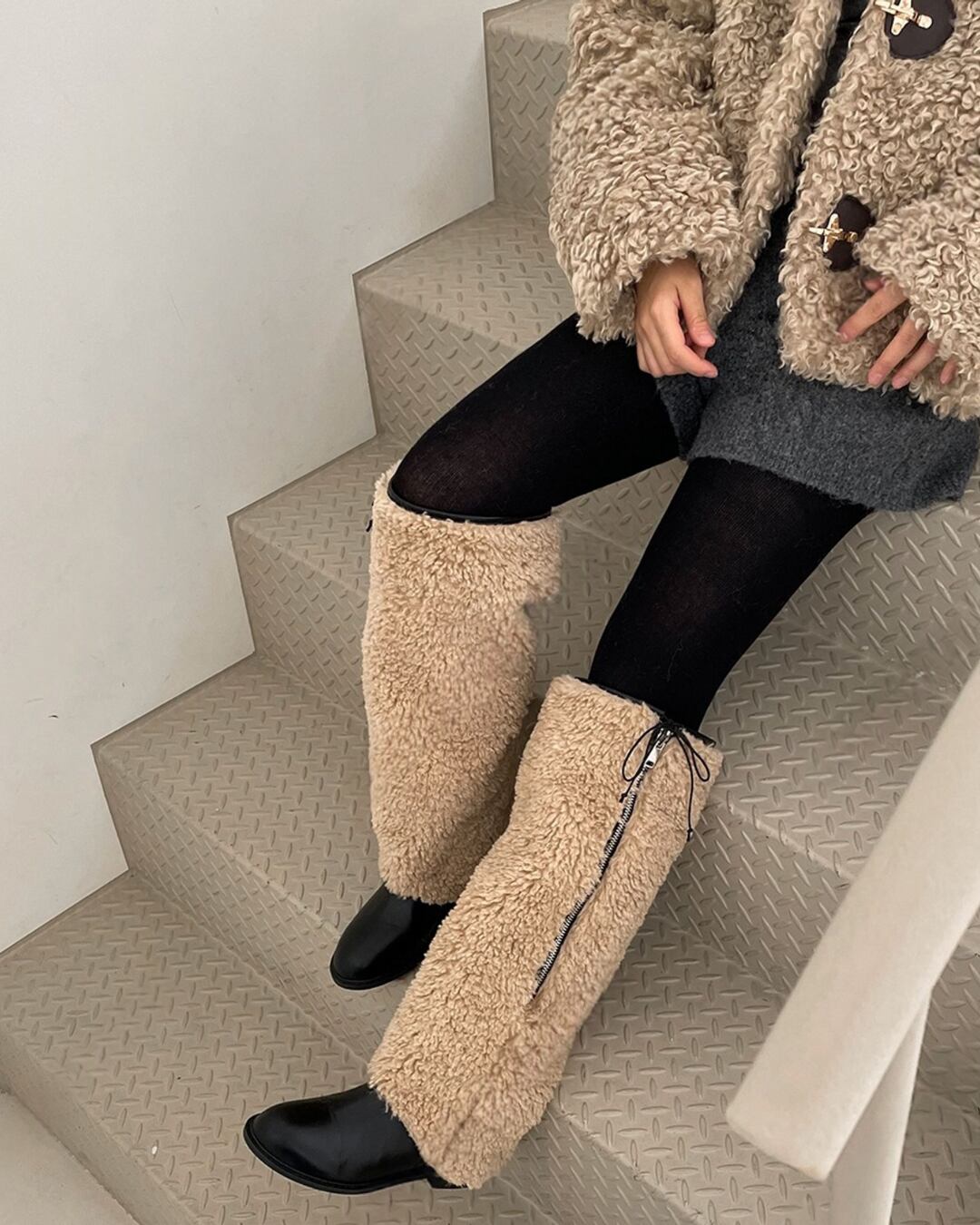 温かみのあるシアリング素材と合成皮革を使用したレッグウォーマー。寒い季節にぴったりのアイテムで、足元を暖かく包み込みます。シンプルなブラックカラーで、どんなコーディネートにも合わせやすく、スタイリッシュに仕上がります。ジップ付きで着脱も簡単、リラックスした時間や外出時に活躍する便利なアイテムです。