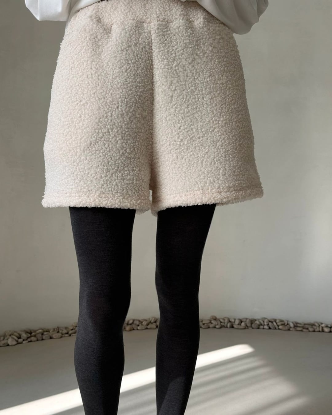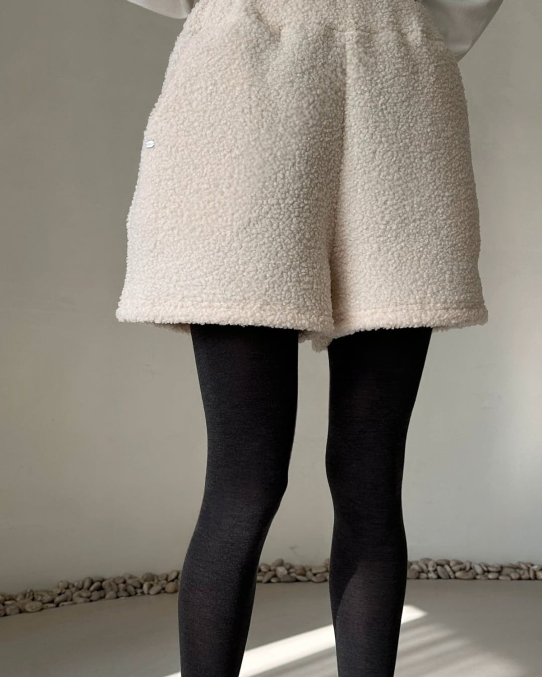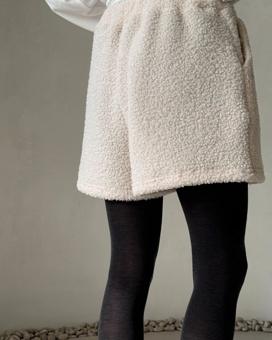 暖かいシアリング素材を使用したショートパンツ。ふわふわとした質感が特徴で、アイボリーカラーで柔らかく、リラックスしたカジュアルコーディネートにぴったりです。冬のインドアシーンやお家時間、アウトドアシーンでも活躍するアイテムで、タイツやレギンスと合わせてもおしゃれに決まります。