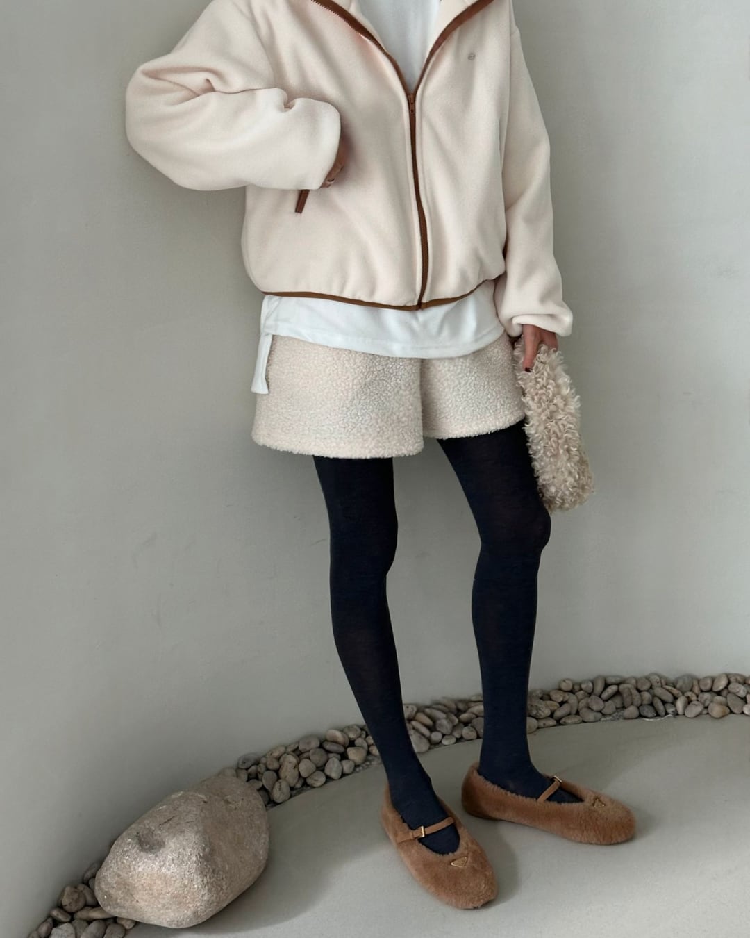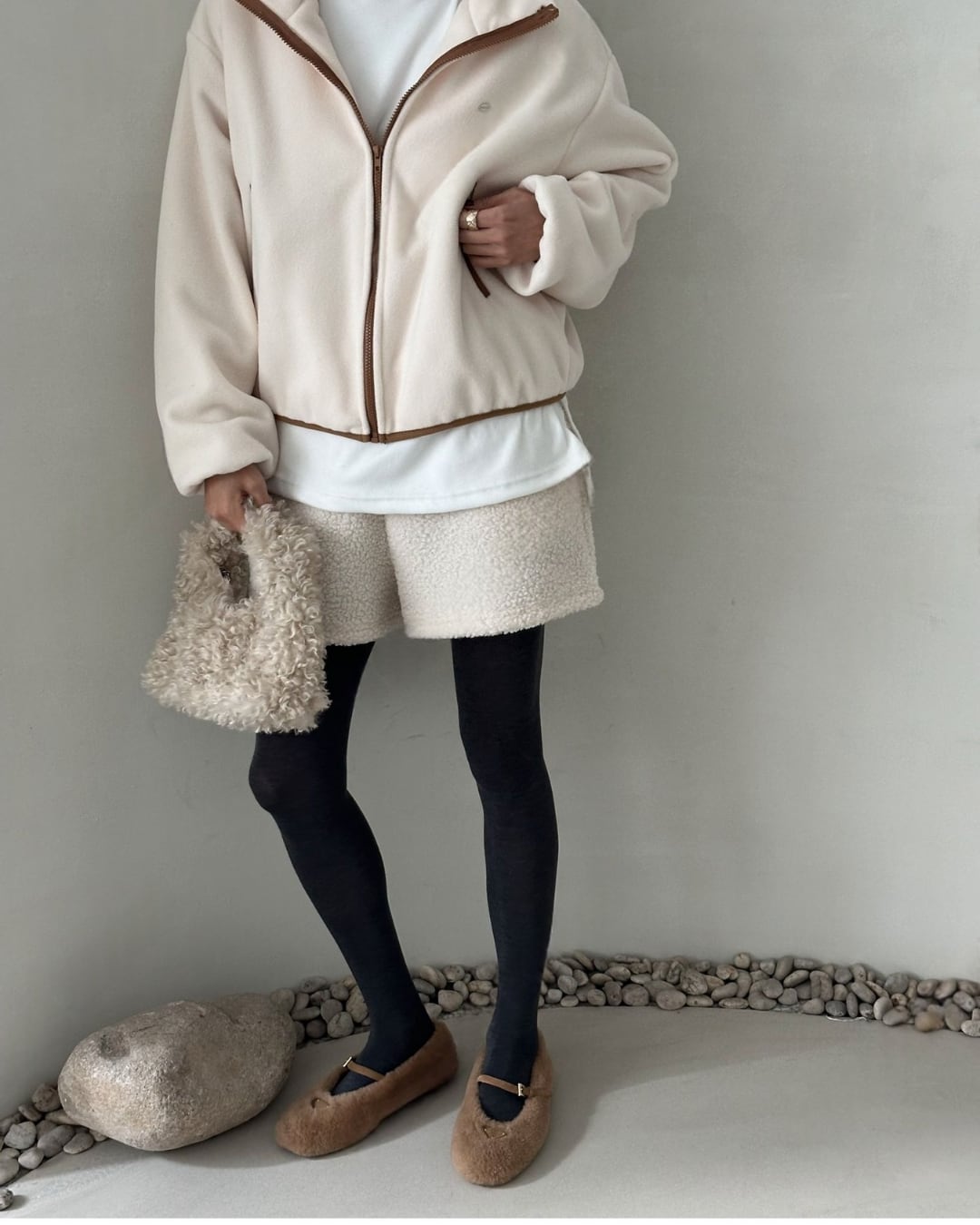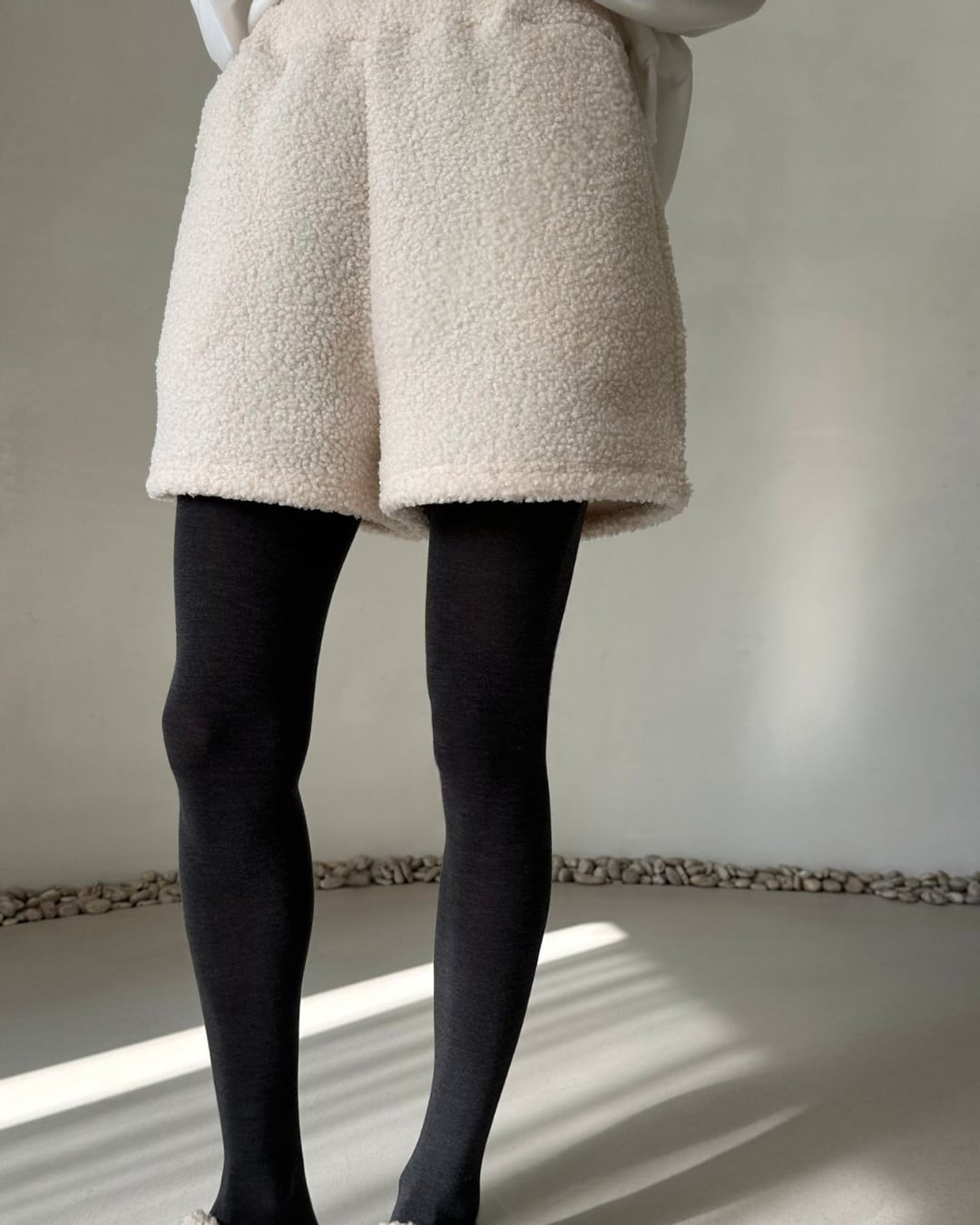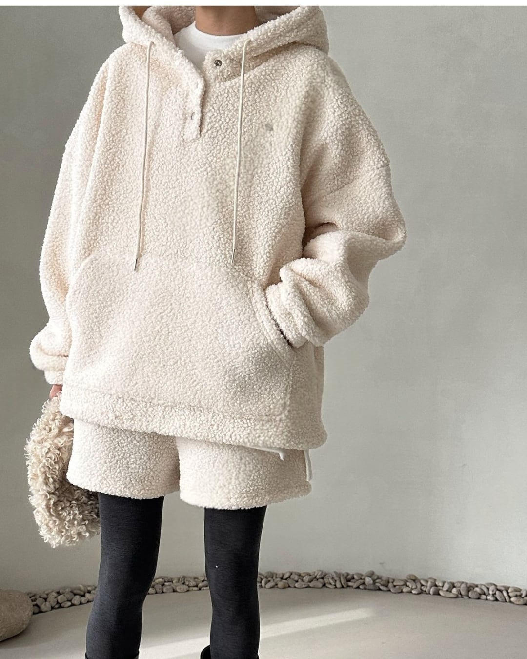 暖かいシアリング素材を使用したショートパンツ。ふわふわとした質感が特徴で、アイボリーカラーで柔らかく、リラックスしたカジュアルコーディネートにぴったりです。冬のインドアシーンやお家時間、アウトドアシーンでも活躍するアイテムで、タイツやレギンスと合わせてもおしゃれに決まります。