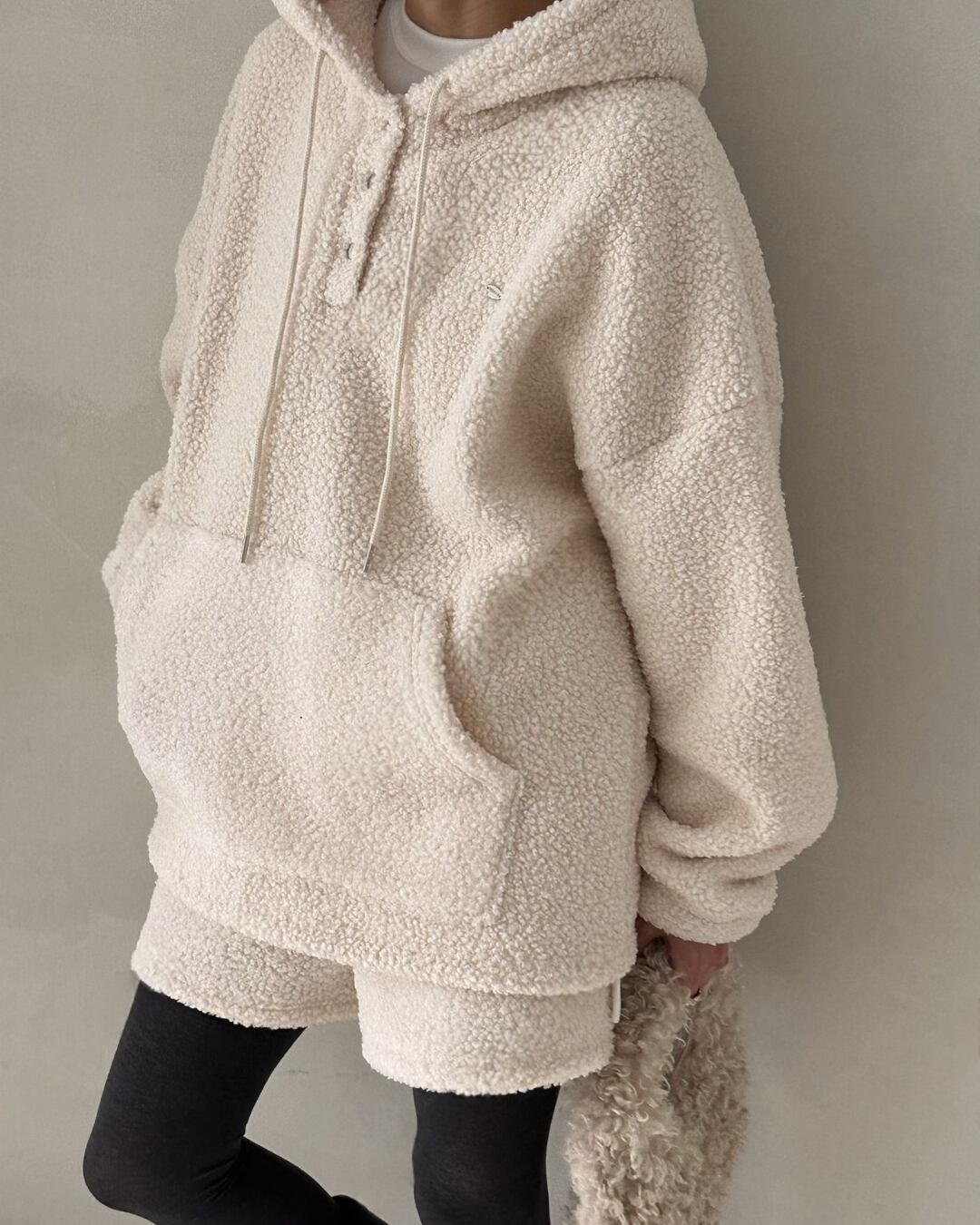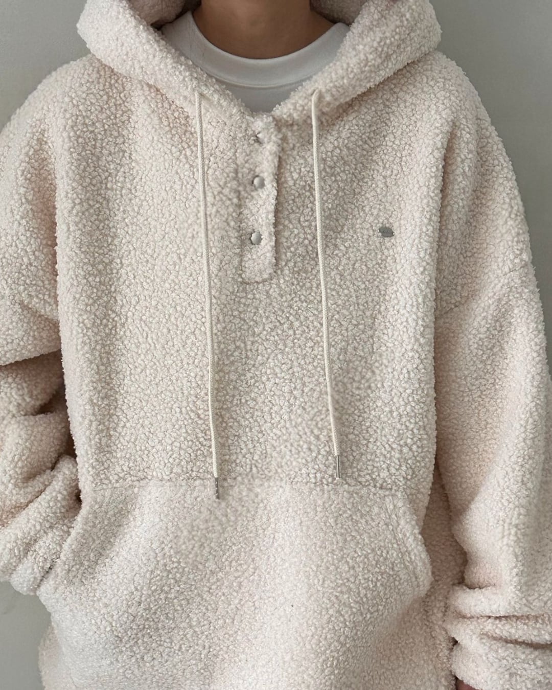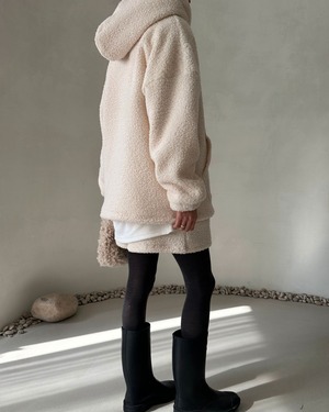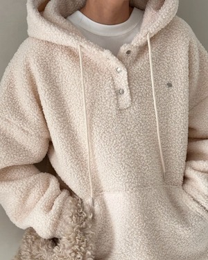 ふわふわのシアリング素材を使用したフード付きプルオーバー。アイボリーの優しい色合いが特徴的で、秋冬にぴったりの温かみあるアイテムです。シンプルながらもトレンド感のあるデザインで、リラックスしたカジュアルコーディネートに最適。内側がフワフワのシアリングで、肌触りも抜群です。デイリー使いにぴったりな一着です。