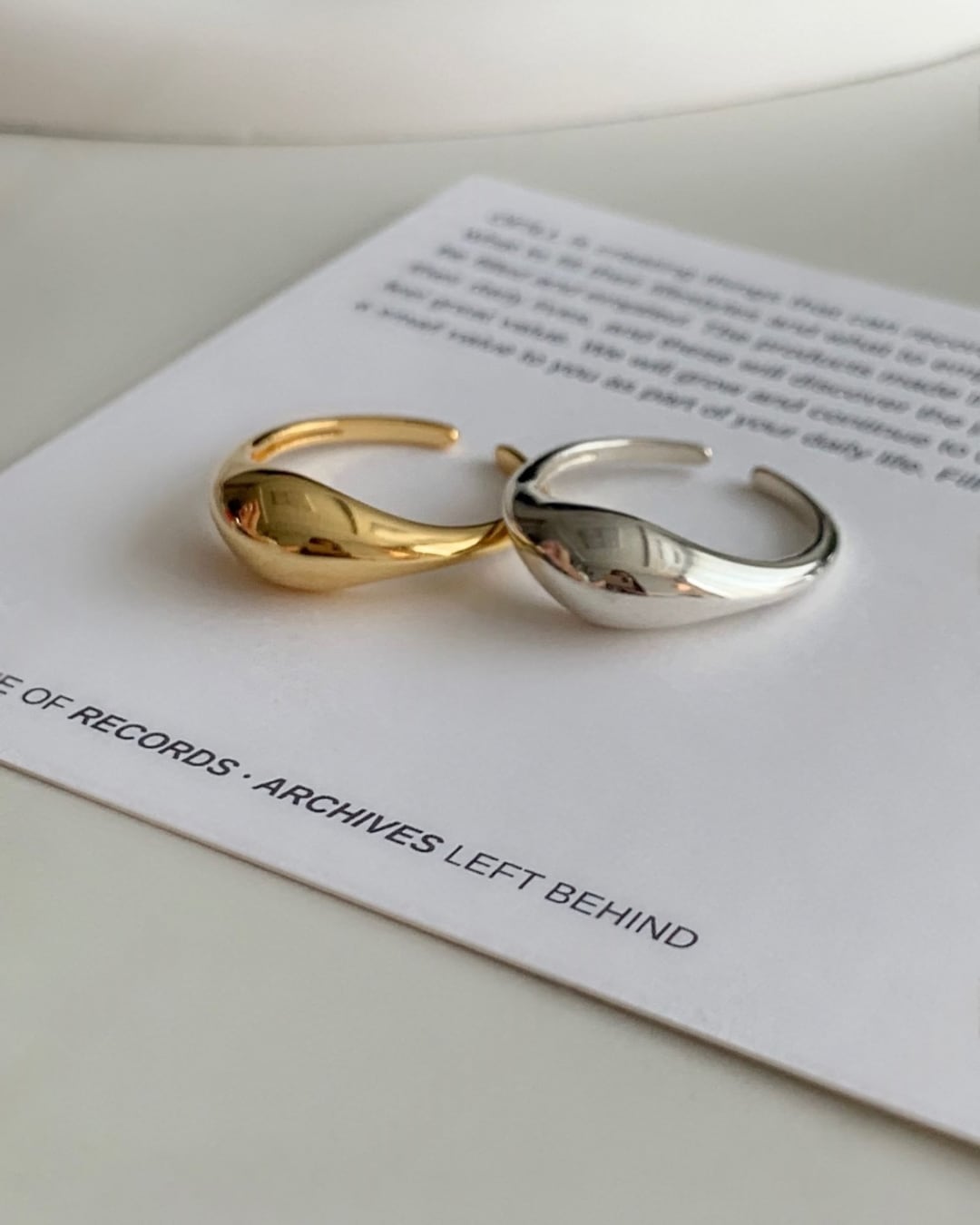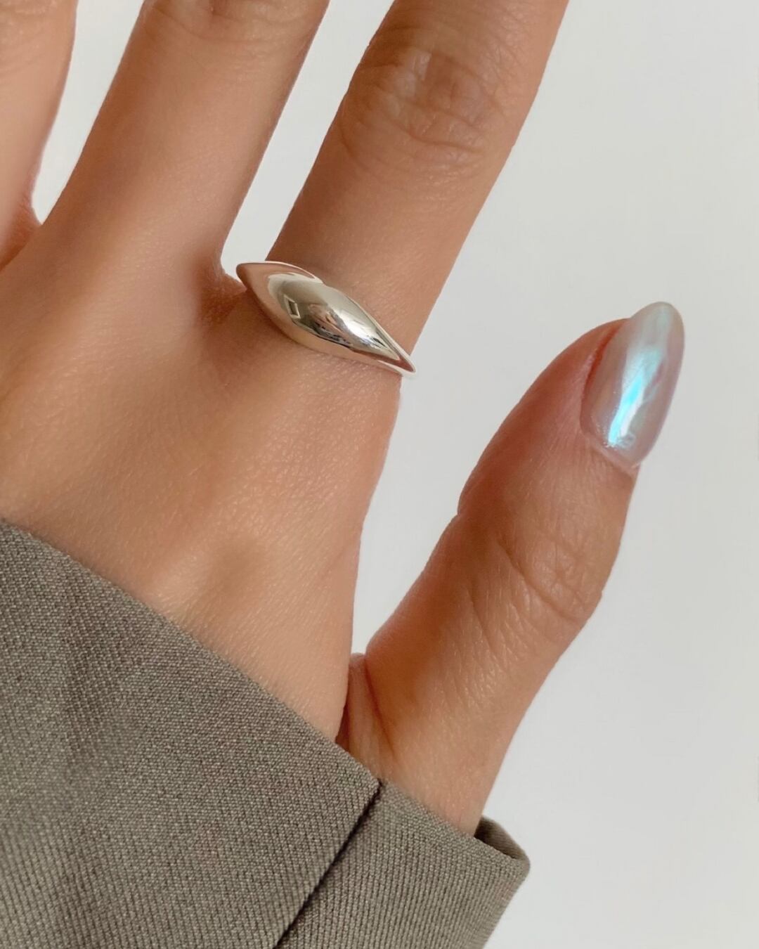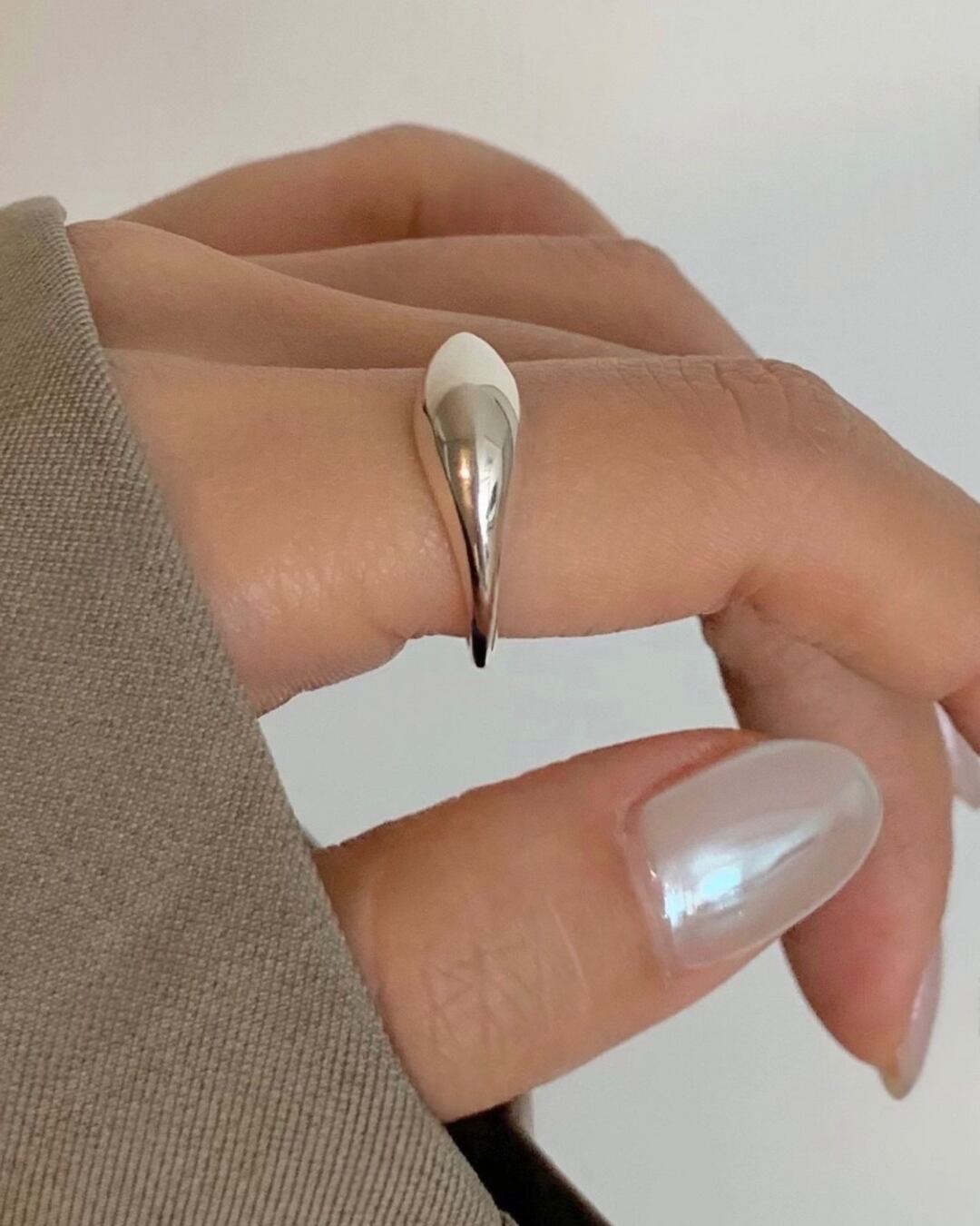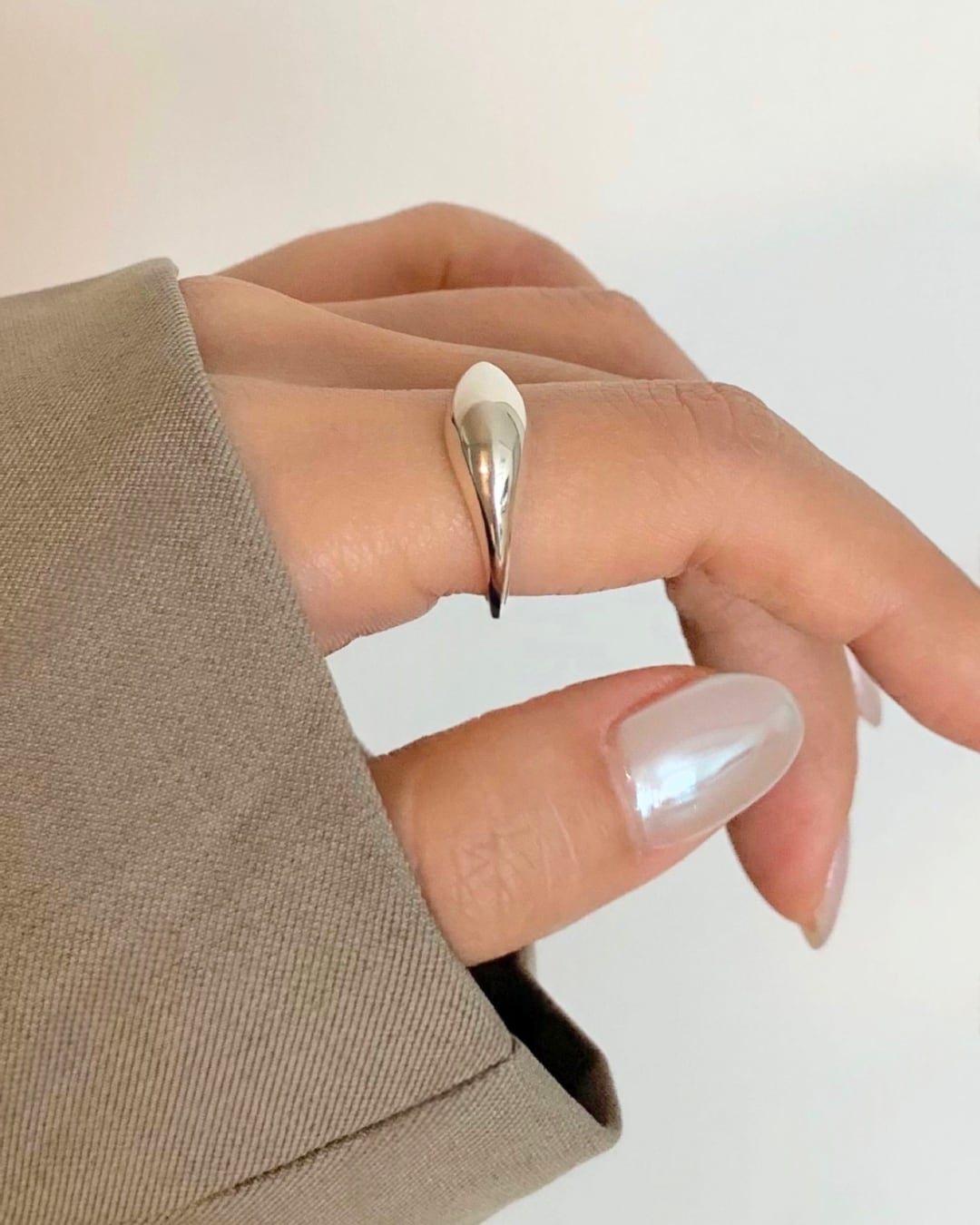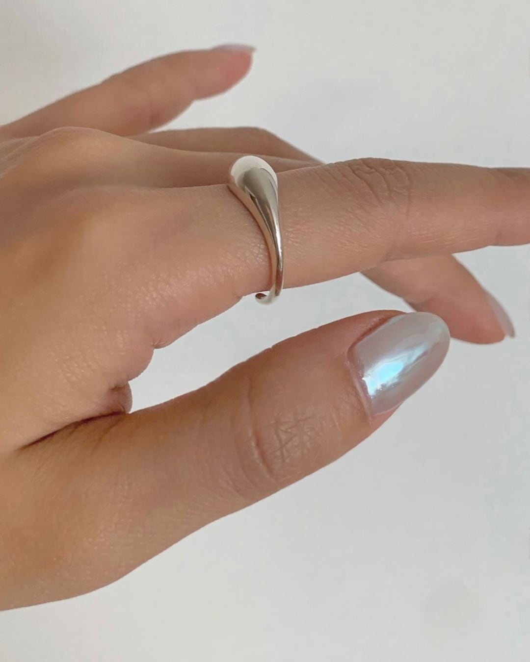 存在感のあるティアドロップ型トップが指先を美しく演出するボールドリング。シルバー925の滑らかな艶感が手元に上品なアクセントをプラスします。オープン仕様でサイズ調整しやすく、デイリーからモードスタイルまで幅広く活躍します。