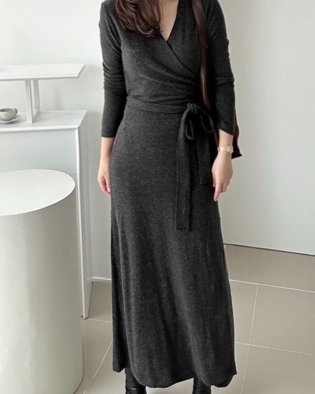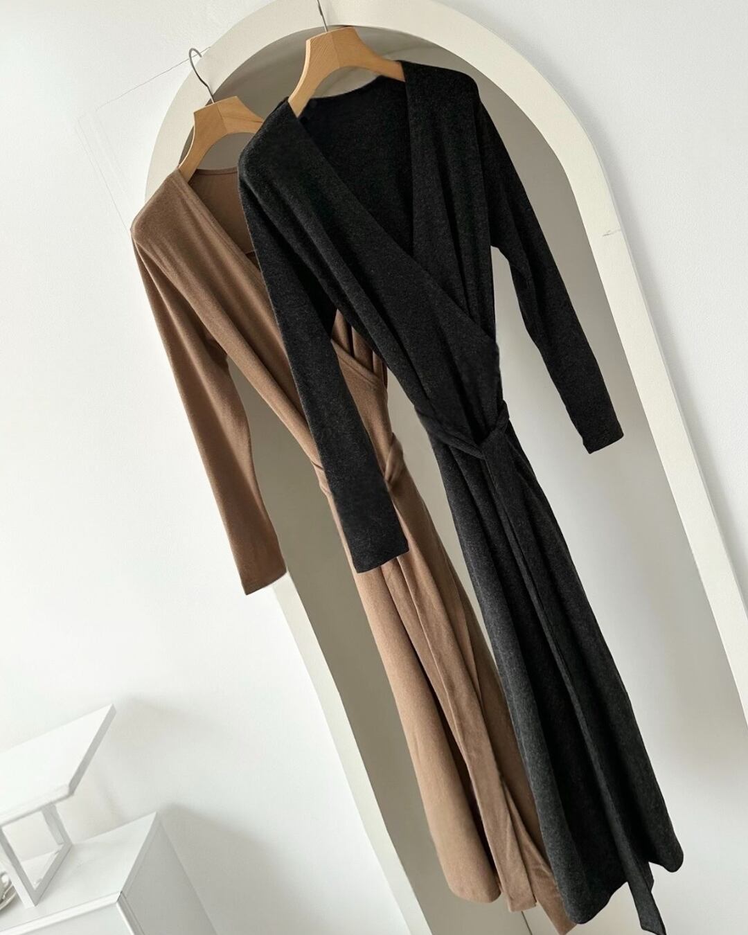アンゴラ混のやわらかな風合いが魅力のニットロングワンピース。ラップデザインが自然なドレープを生み、縦のラインを美しく演出します。程よい厚みと伸縮性で着心地も良く、1枚で大人っぽいスタイルが完成するアイテムです。