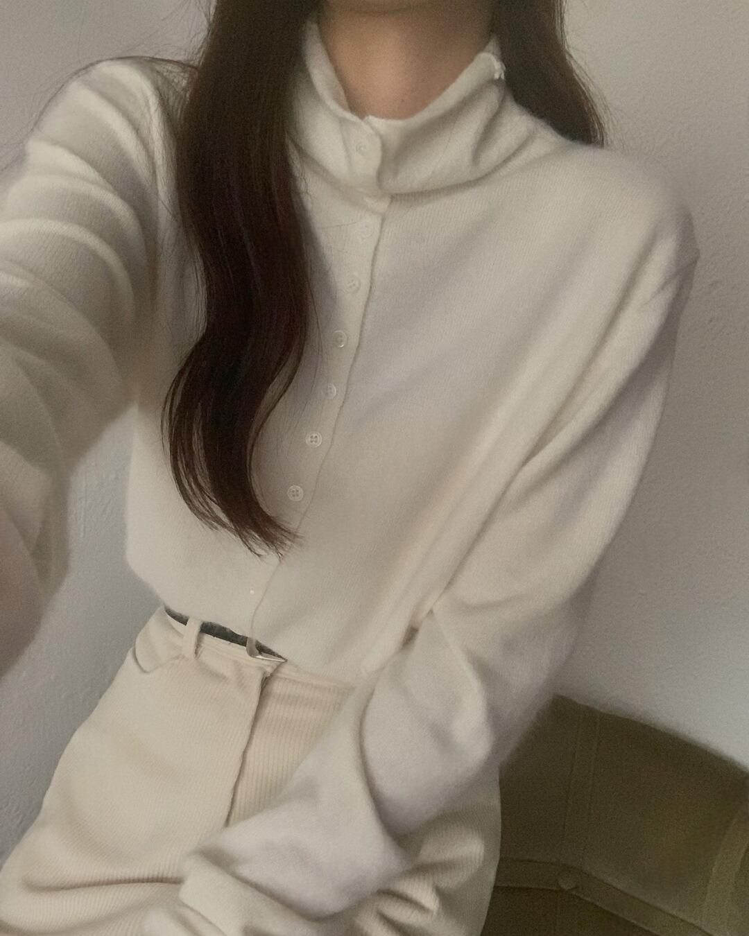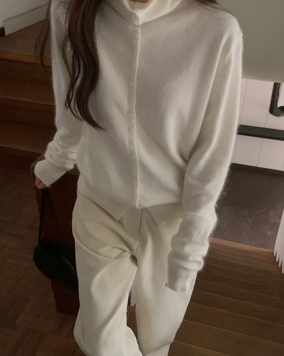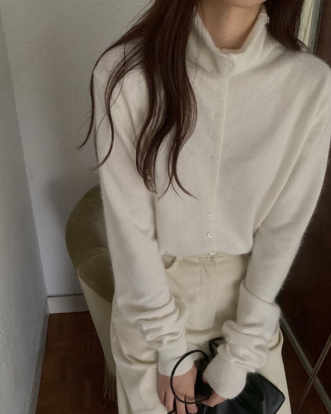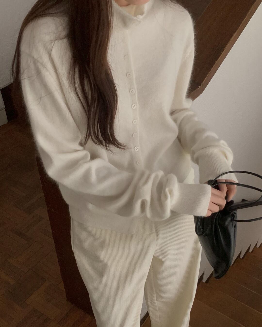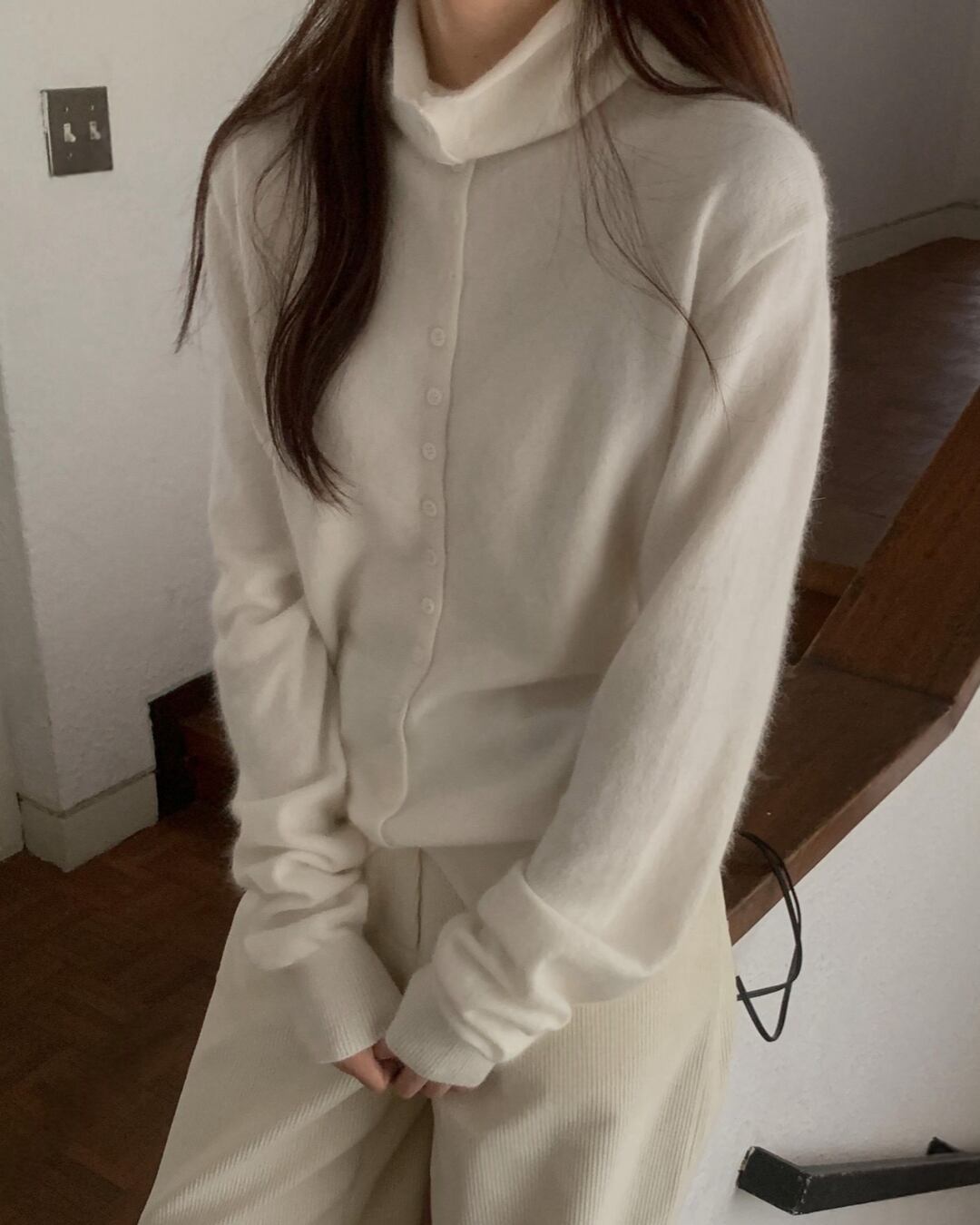 柔らかく上質なラクーン素材を使用したハイネックニットカーディガン。フロントのボタンデザインが上品な印象を演出し、程よいフィット感で一枚でもレイヤードでも活躍。秋冬の大人カジュアルにぴったりな万能アイテムです。