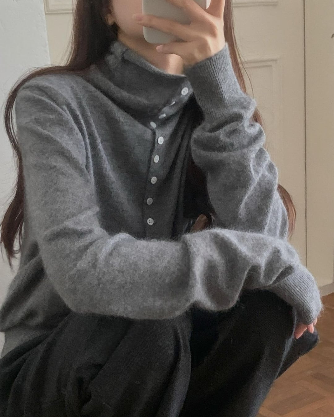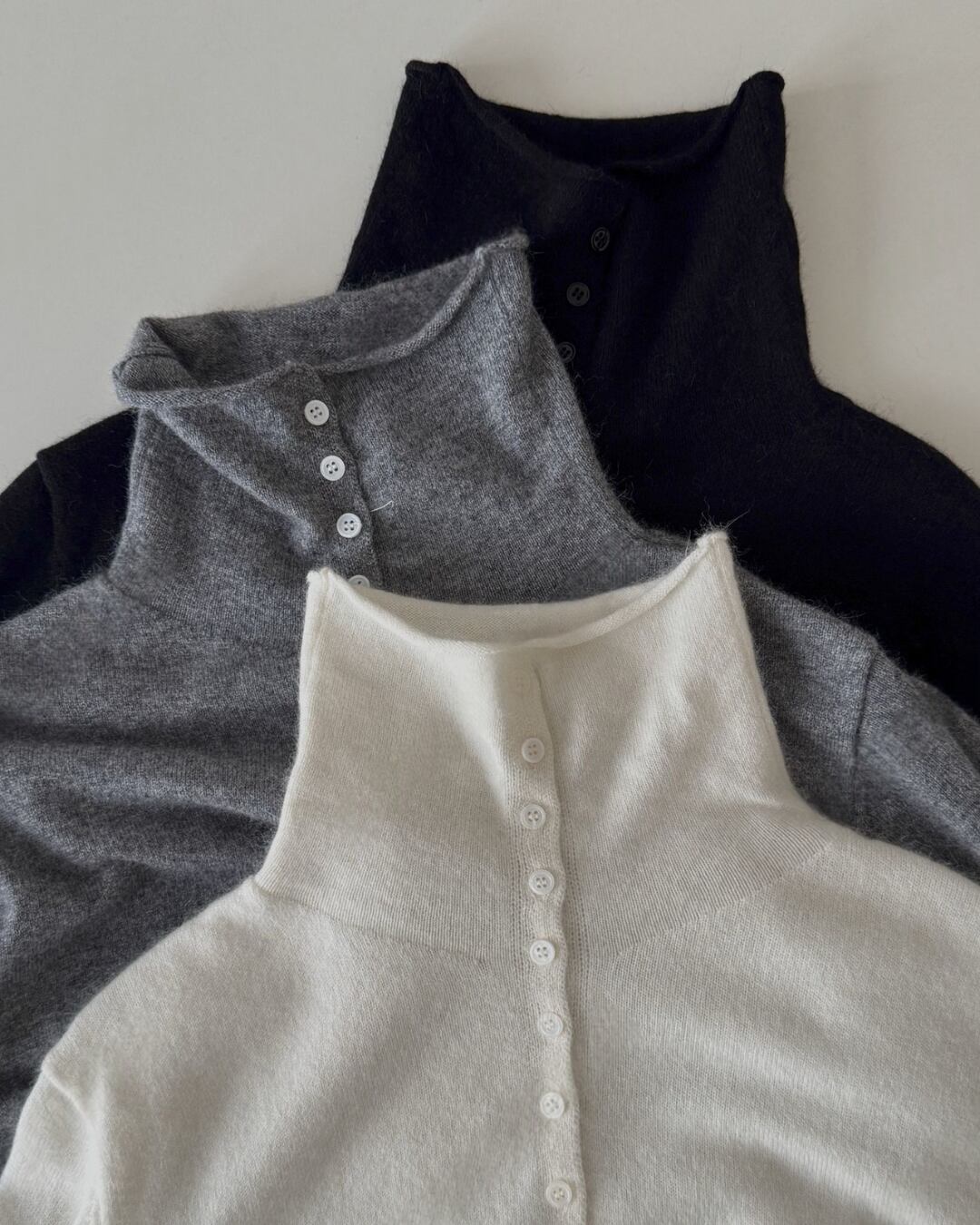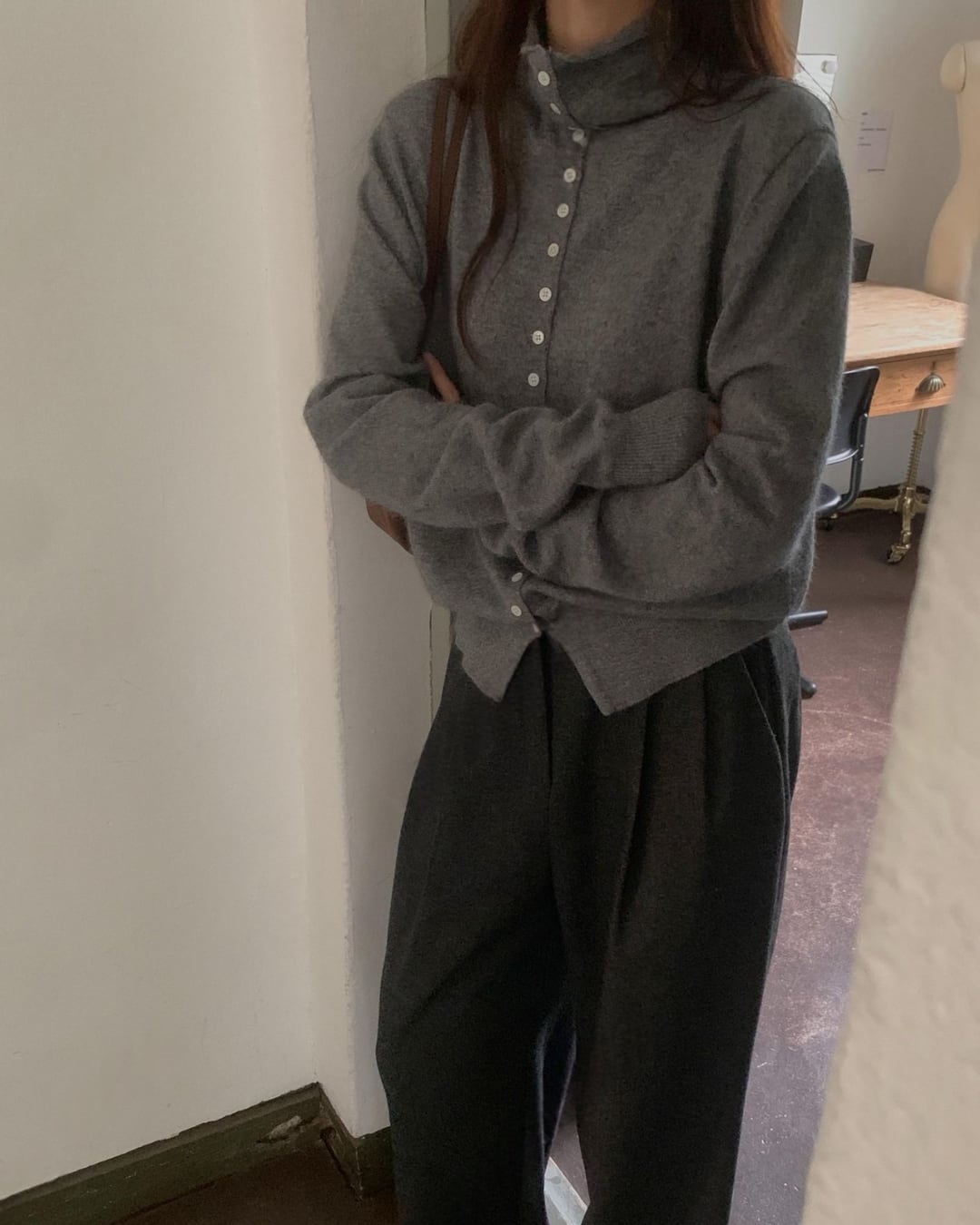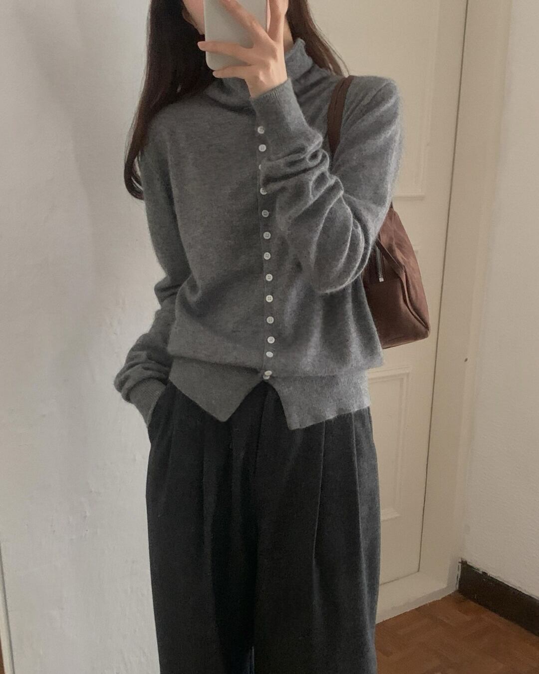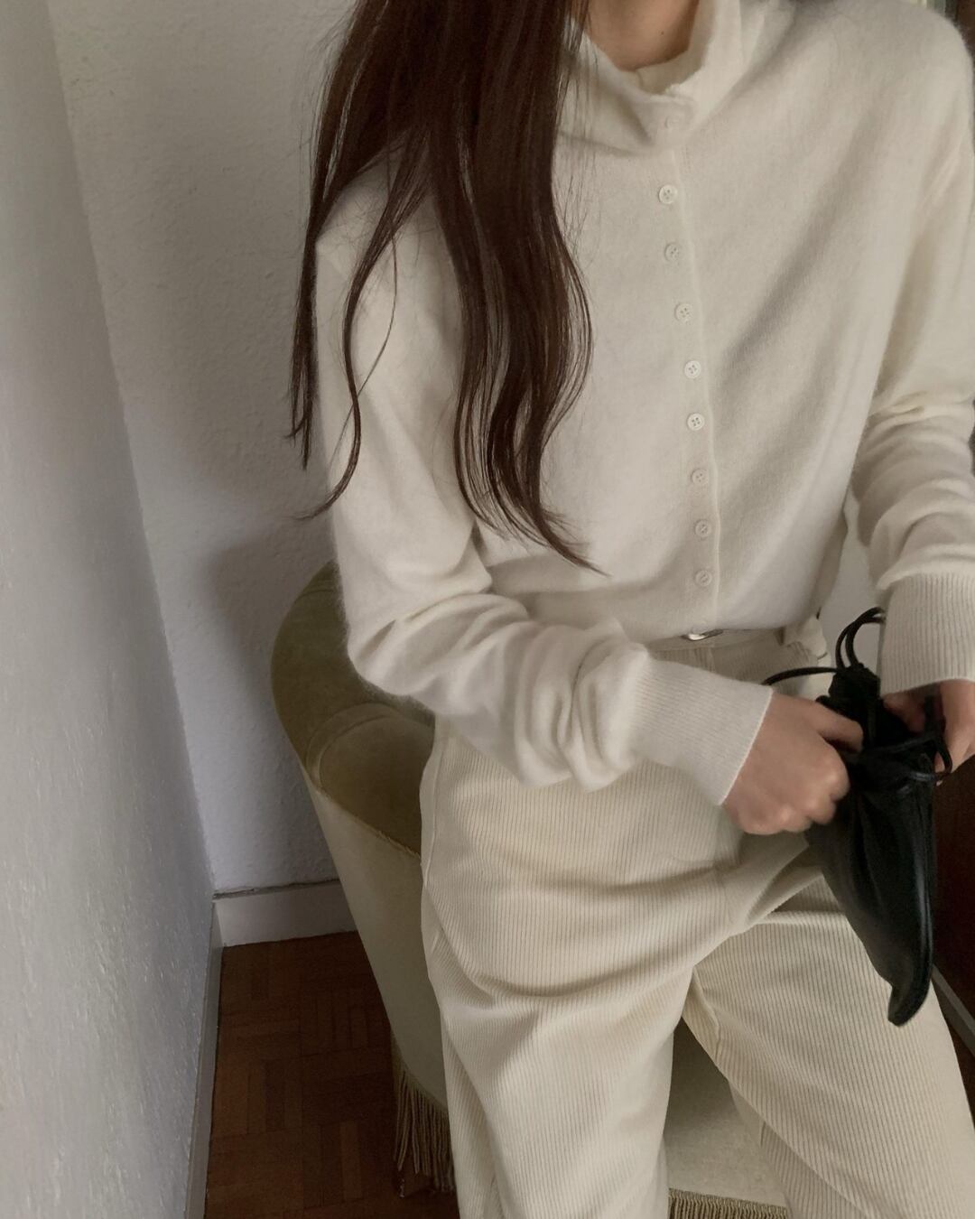 柔らかく上質なラクーン素材を使用したハイネックニットカーディガン。フロントのボタンデザインが上品な印象を演出し、程よいフィット感で一枚でもレイヤードでも活躍。秋冬の大人カジュアルにぴったりな万能アイテムです。