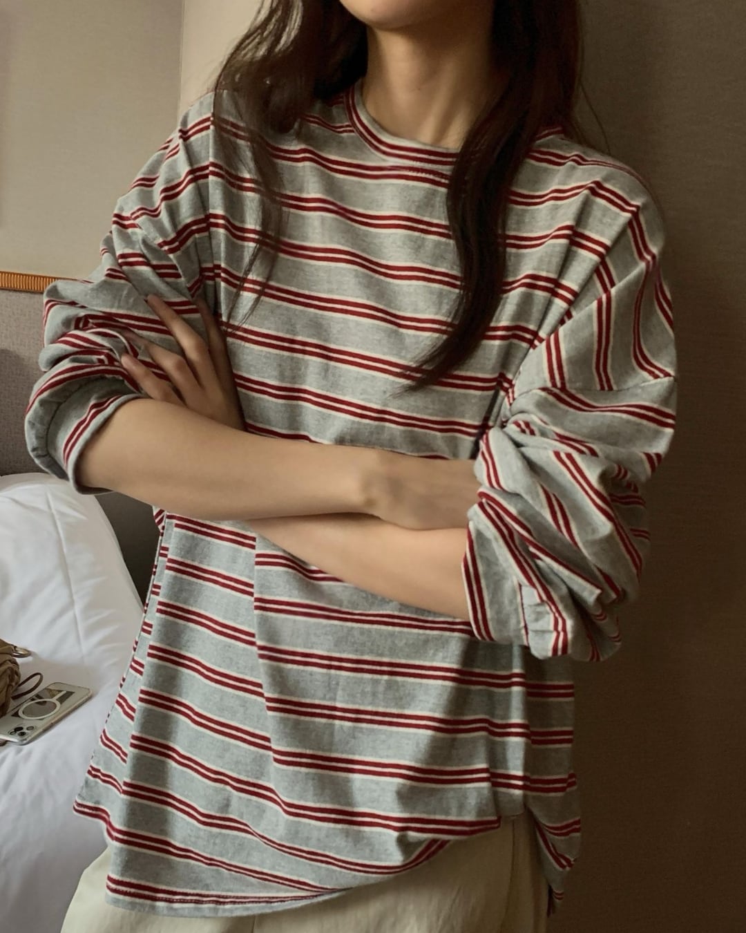 柔らかな綿素材を使用した、着心地の良いボーダーロングTシャツ。程よくゆとりのあるシルエットで、リラックス感がありながらもデイリーに使いやすい一枚です。シンプルな配色のボーダー柄がコーディネートのアクセントになり、パンツ・スカート問わず幅広く活躍します。シーズンレスで着用できる万能アイテムです。