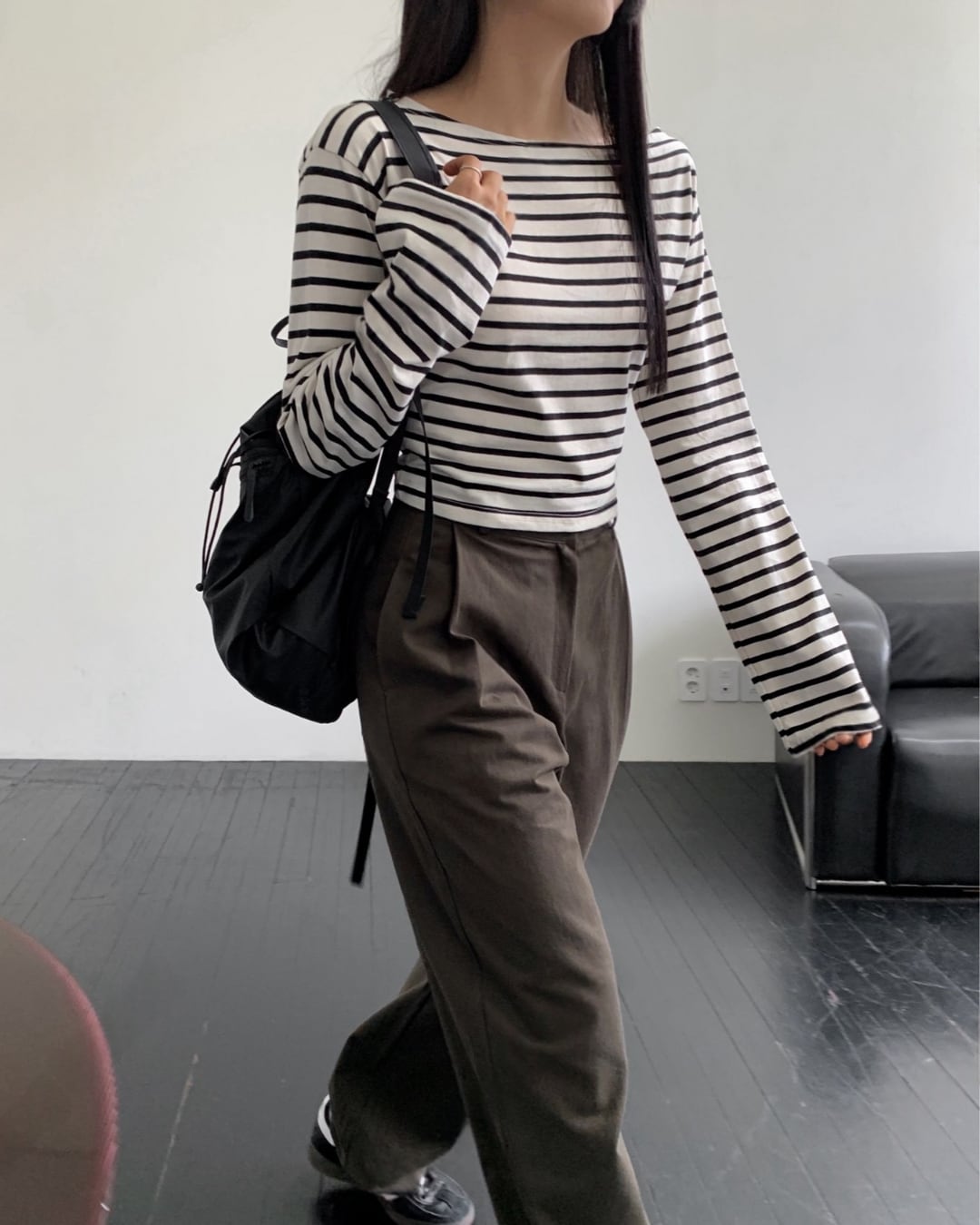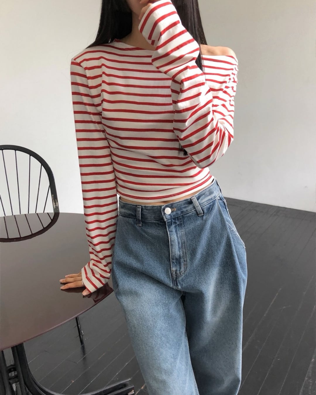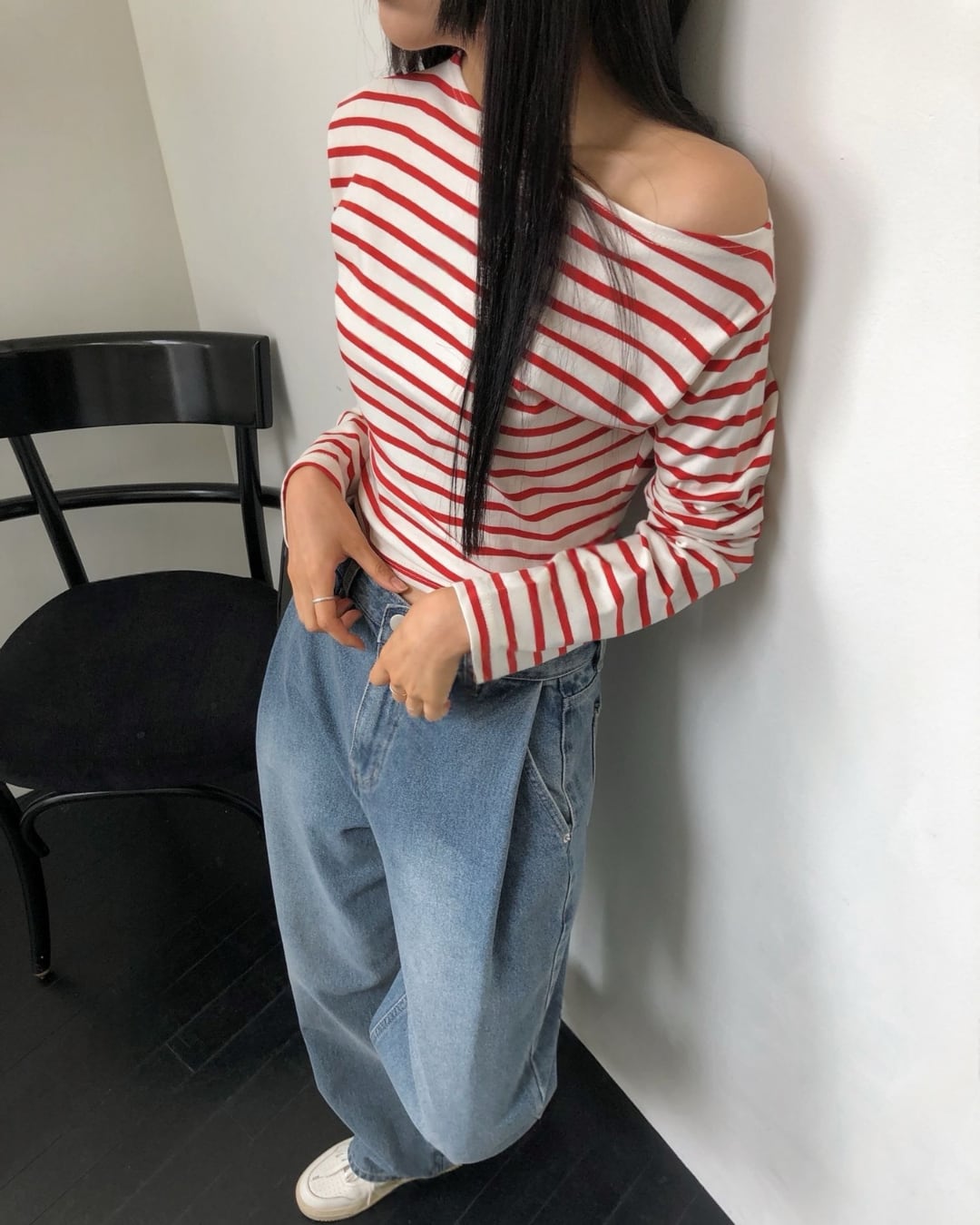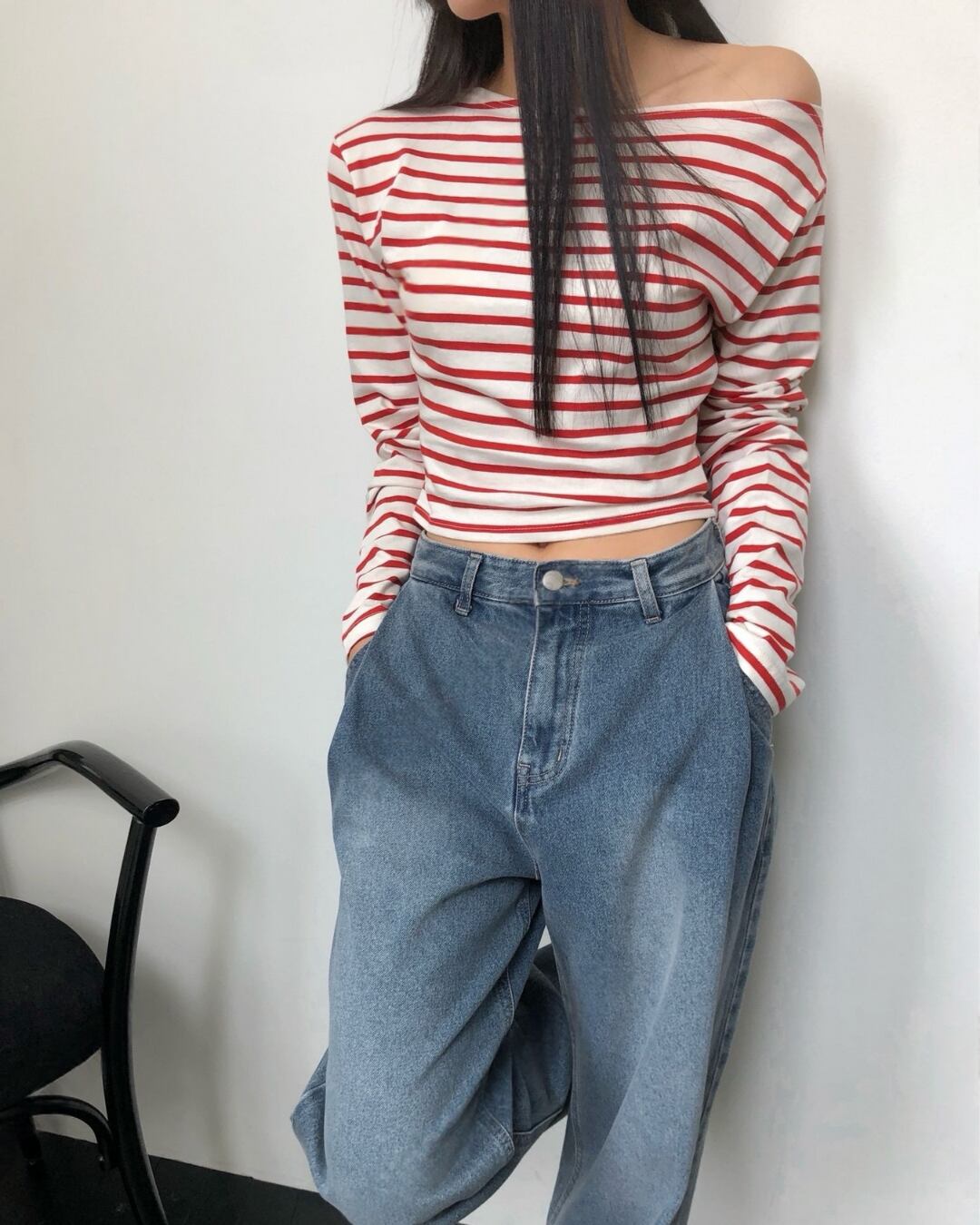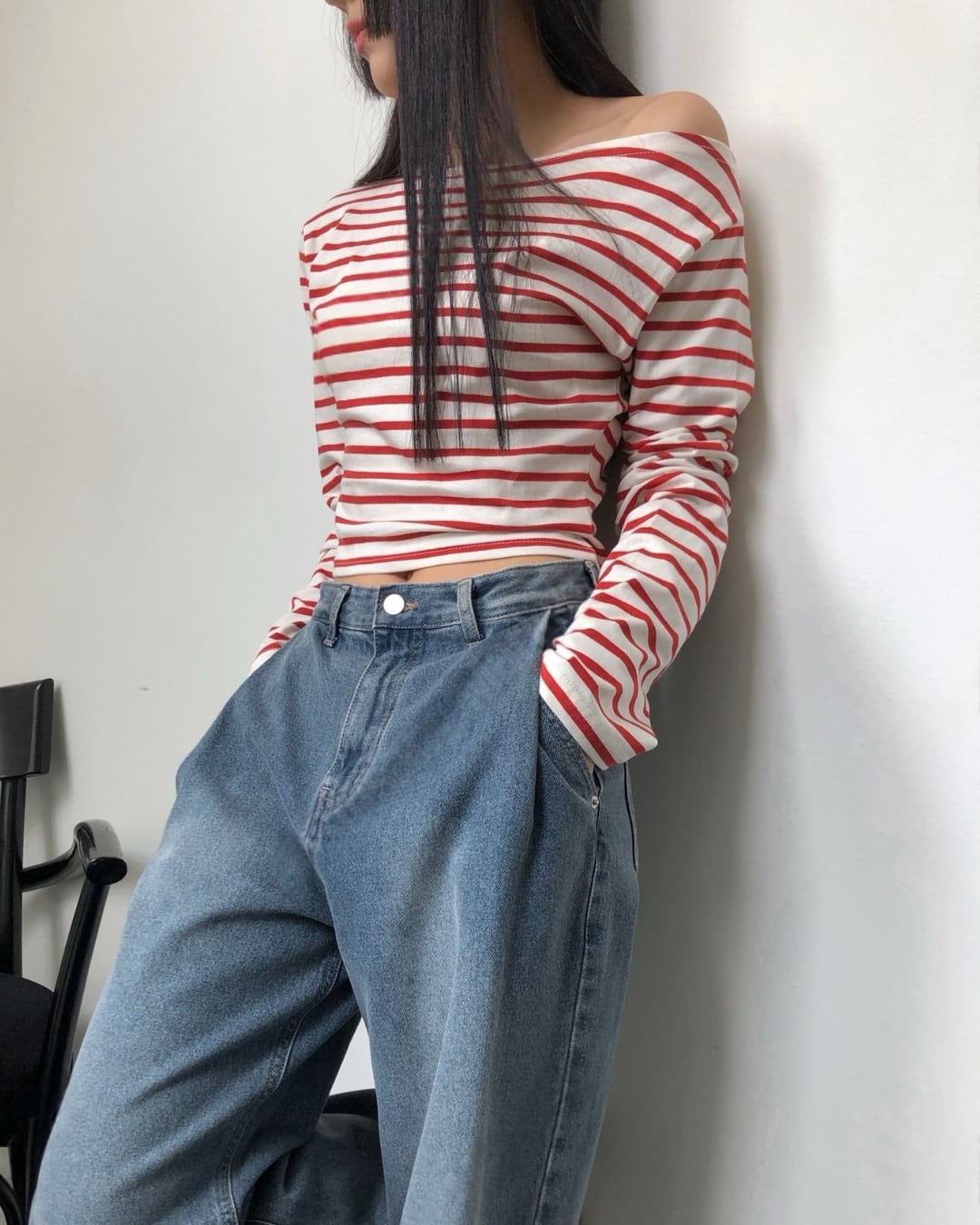 #ボーダートップス #オフショルダー #クロップド丈 #大人カジュアル #抜け感コーデ
