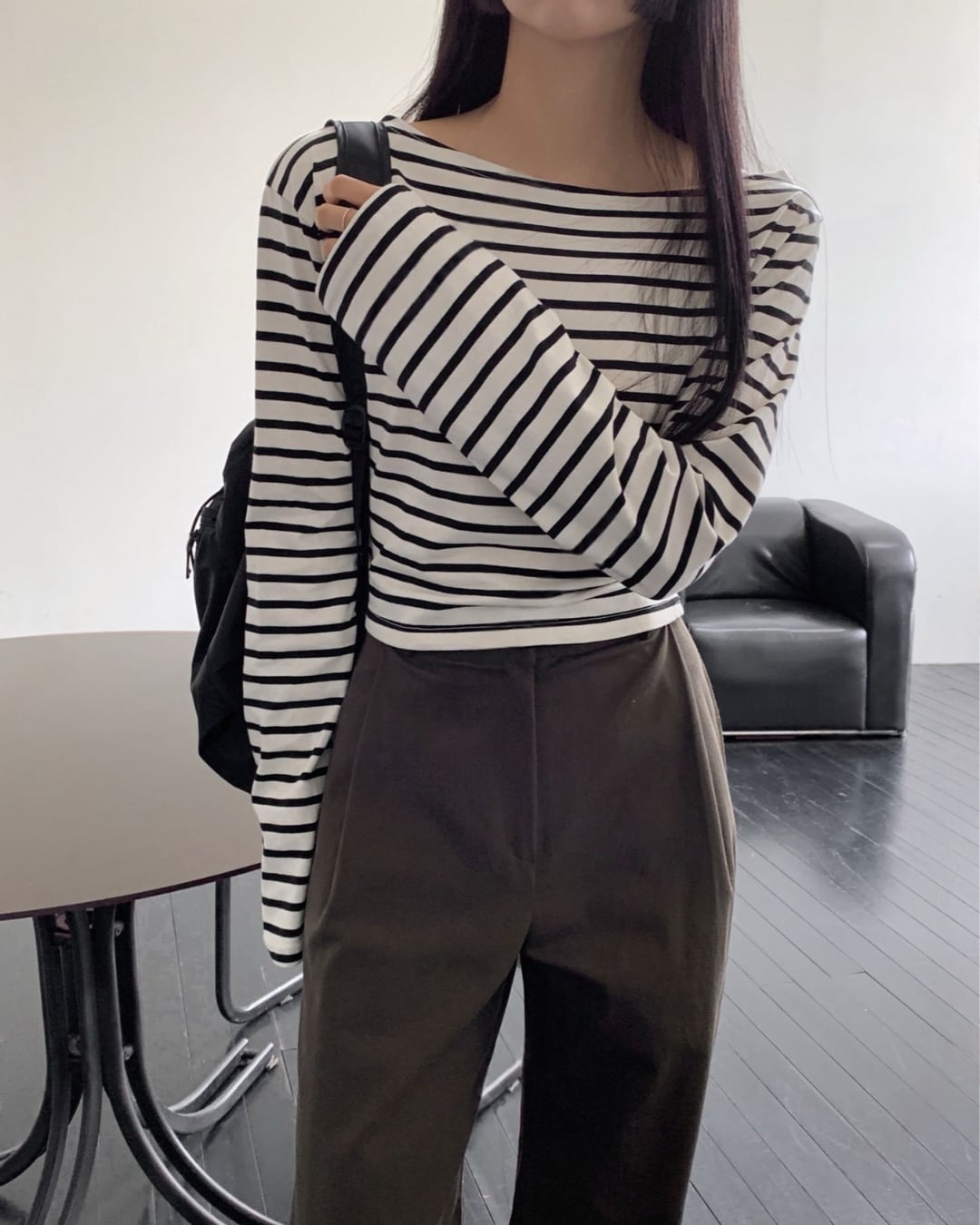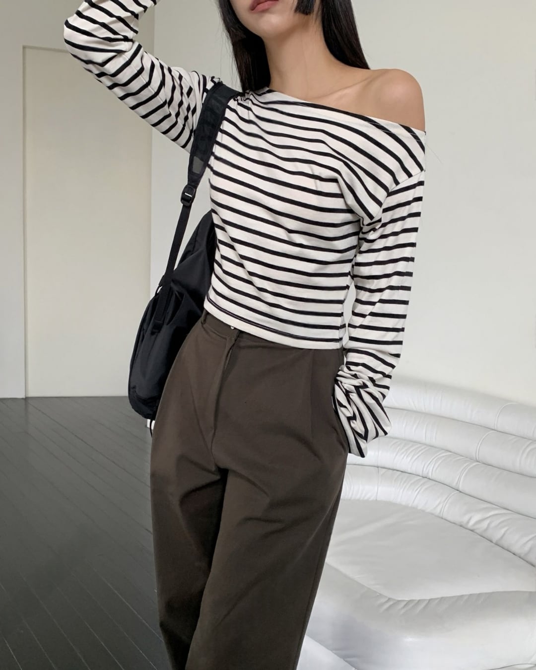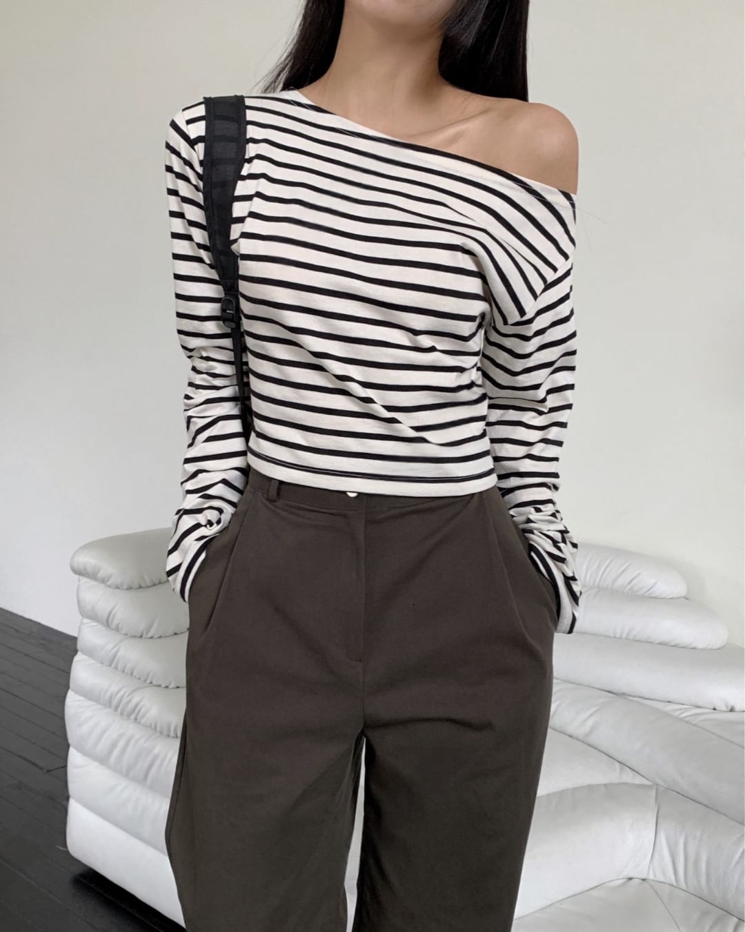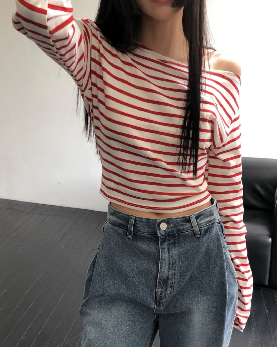 抜け感のあるオフショルダーデザインが魅力のボートネックボーダートップス。デコルテを美しく見せるアンバランスなネックラインで、シンプルながらも女性らしさを引き立てます。コンパクトなクロップド丈がスタイルアップを叶え、ハイウエストボトムとの相性も抜群。一枚で主役になる、こなれ感たっぷりのアイテムです。