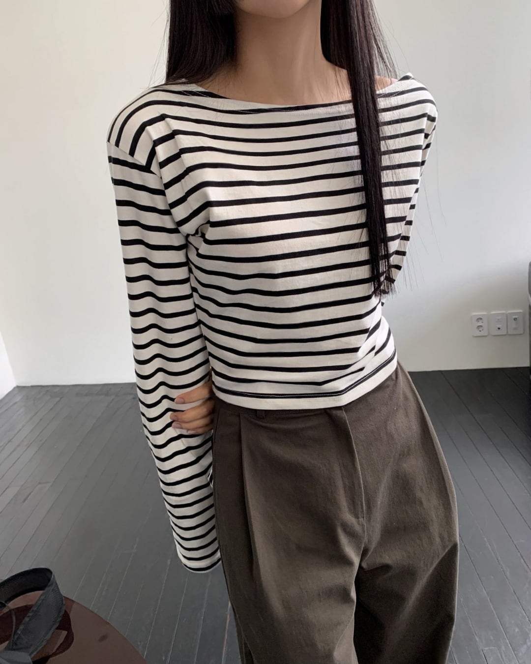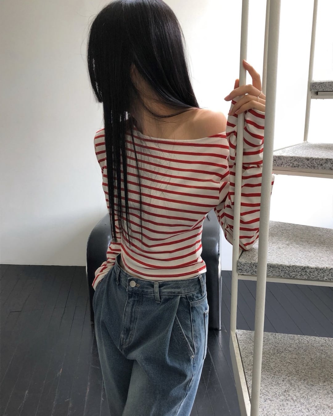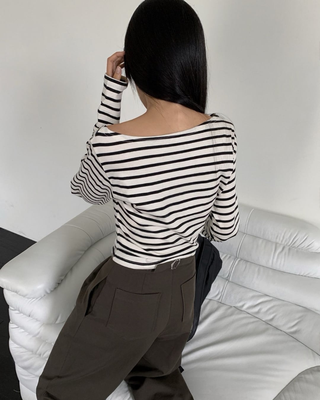 抜け感のあるオフショルダーデザインが魅力のボートネックボーダートップス。デコルテを美しく見せるアンバランスなネックラインで、シンプルながらも女性らしさを引き立てます。コンパクトなクロップド丈がスタイルアップを叶え、ハイウエストボトムとの相性も抜群。一枚で主役になる、こなれ感たっぷりのアイテムです。