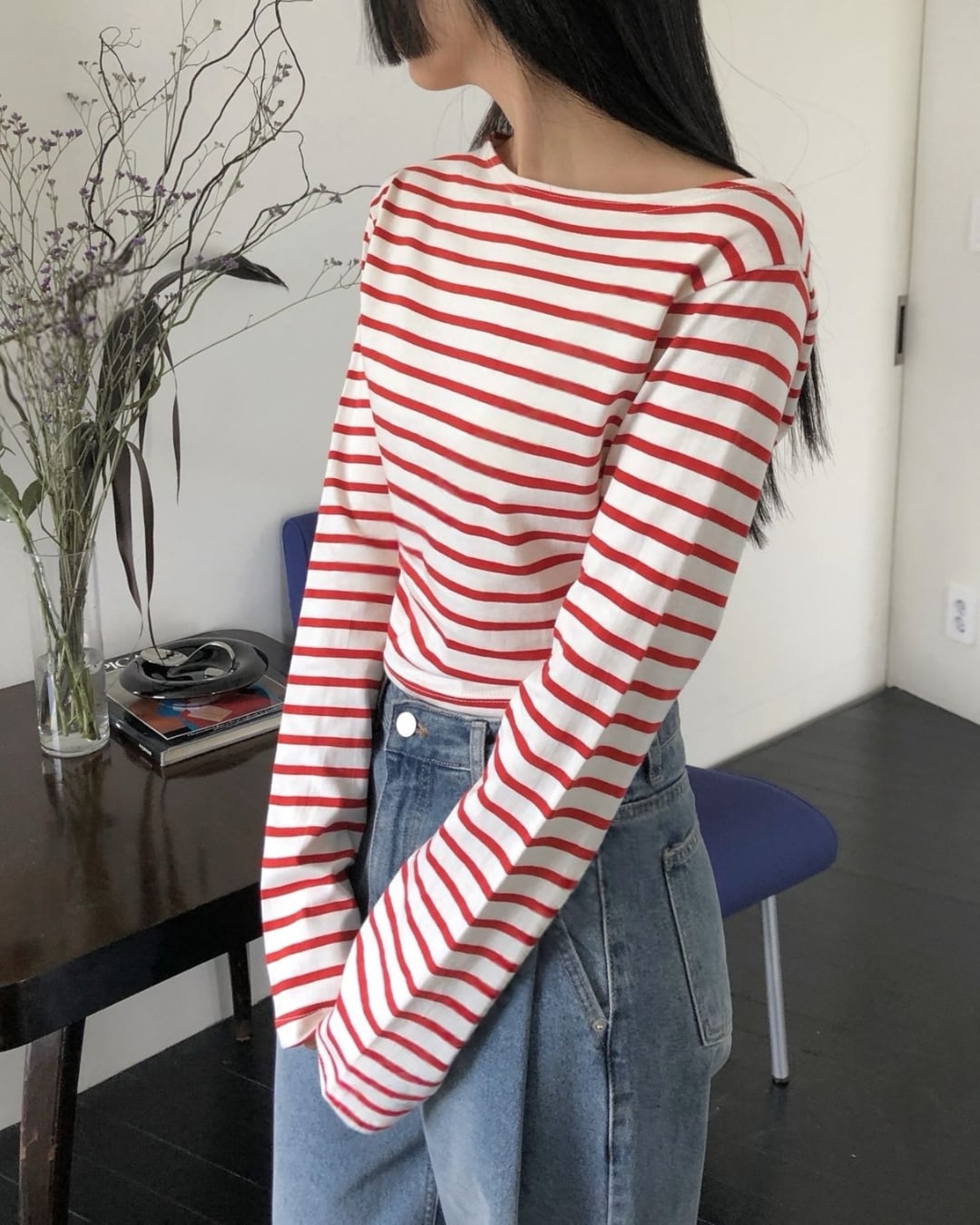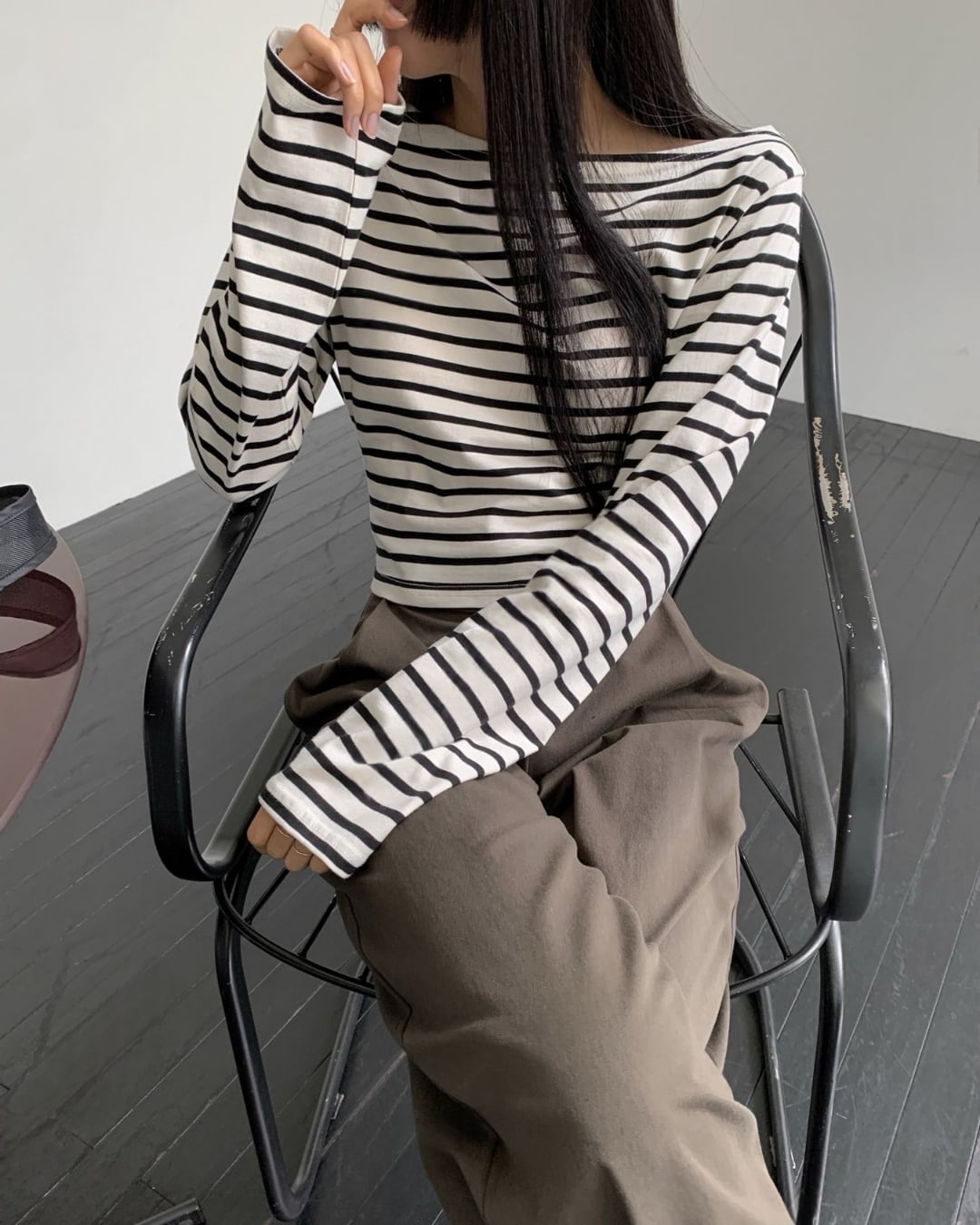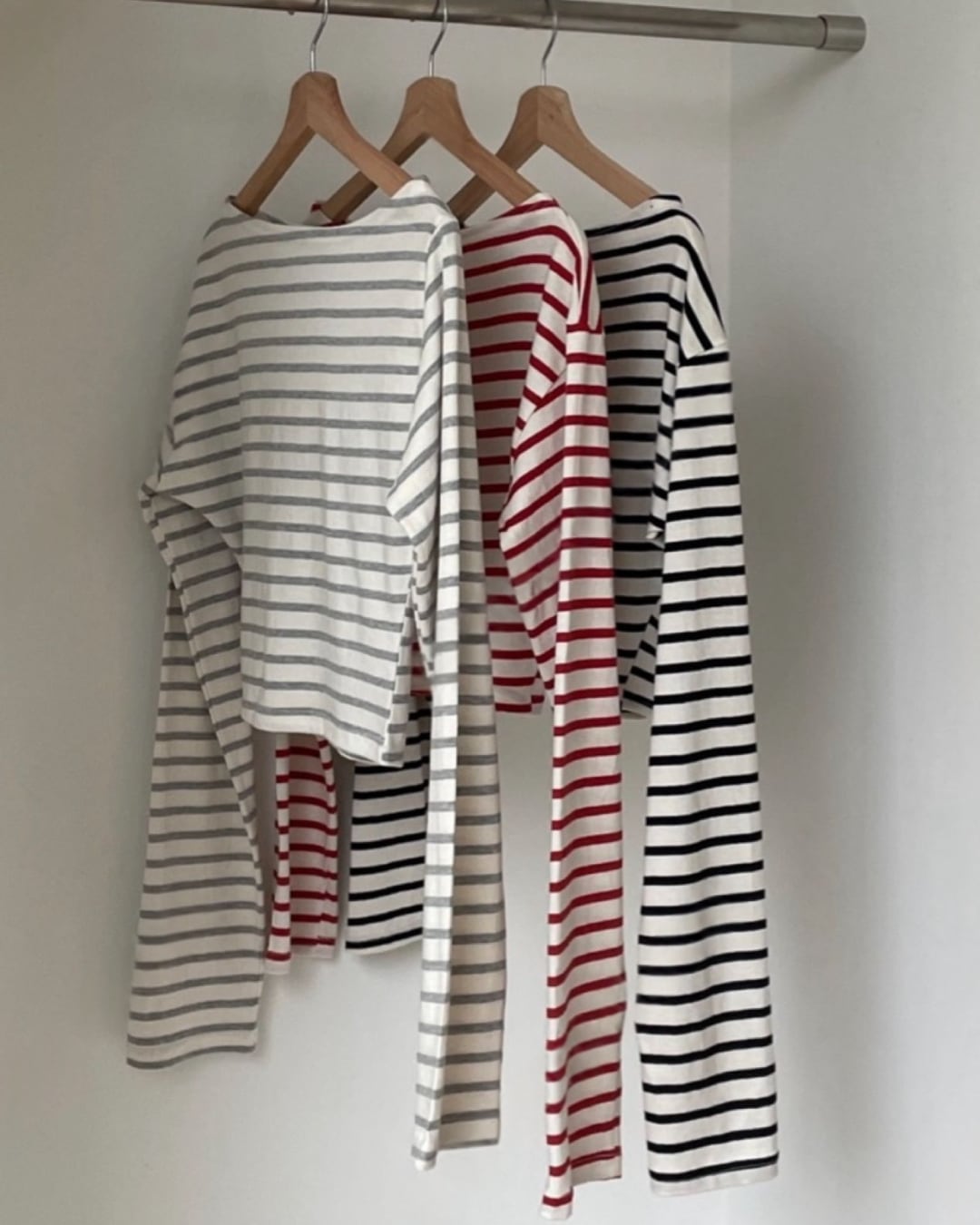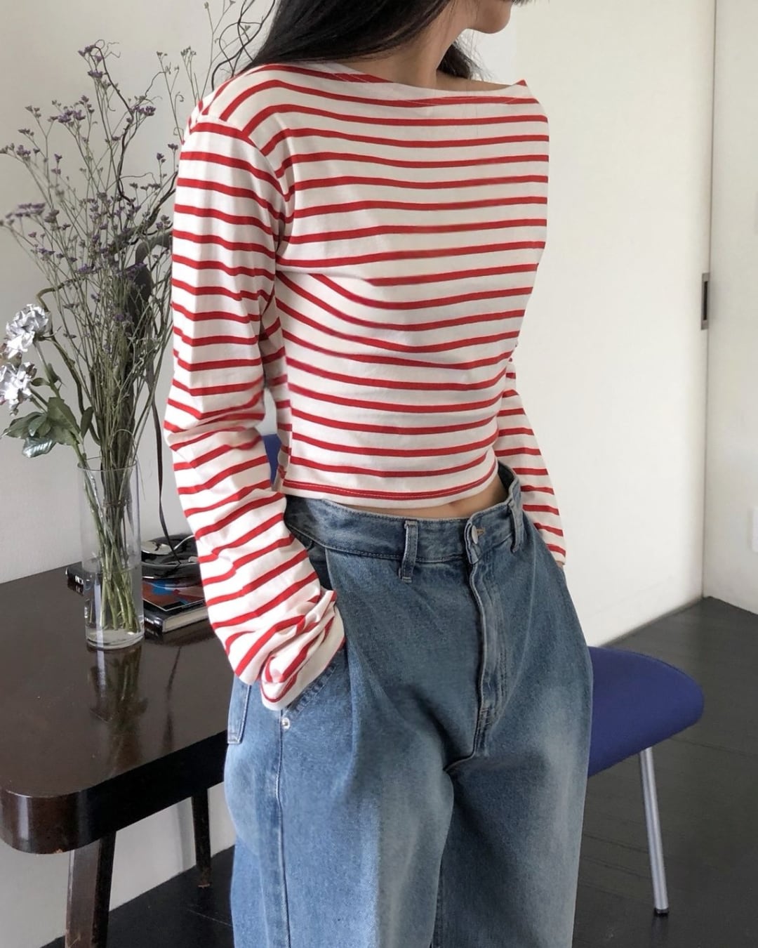 抜け感のあるオフショルダーデザインが魅力のボートネックボーダートップス。デコルテを美しく見せるアンバランスなネックラインで、シンプルながらも女性らしさを引き立てます。コンパクトなクロップド丈がスタイルアップを叶え、ハイウエストボトムとの相性も抜群。一枚で主役になる、こなれ感たっぷりのアイテムです。