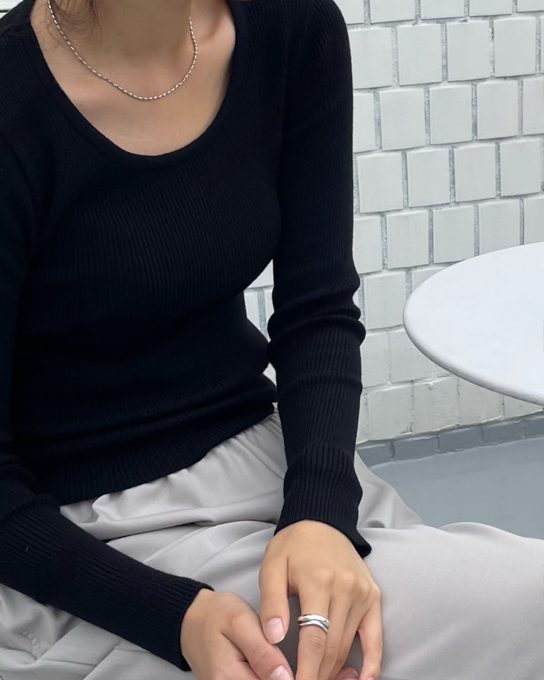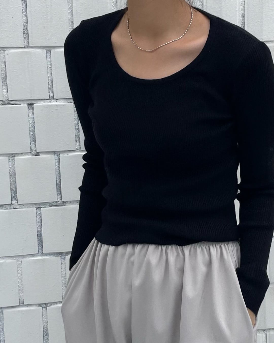 Uネックリブニット長袖トップス
