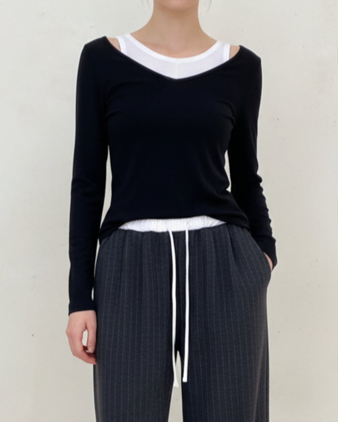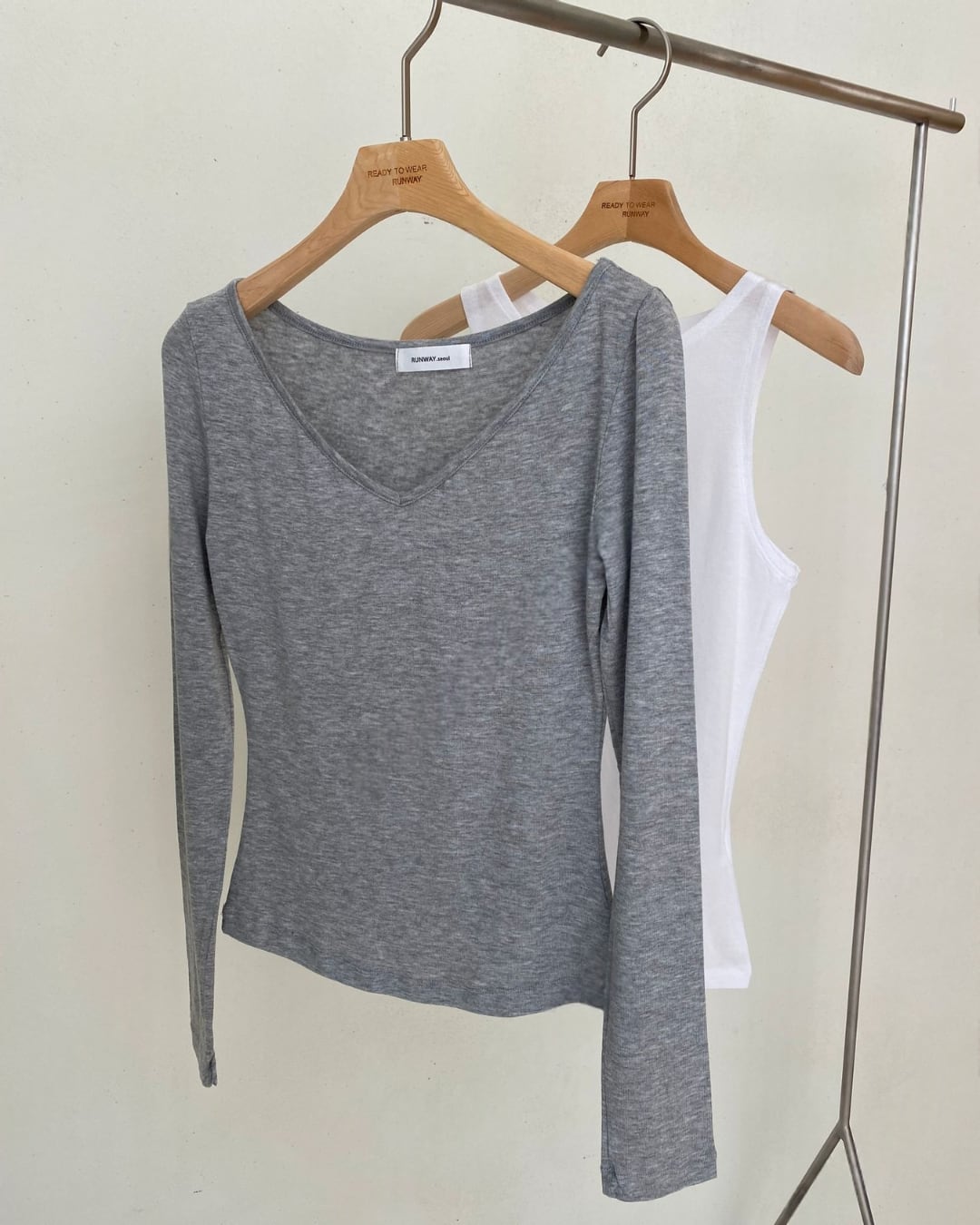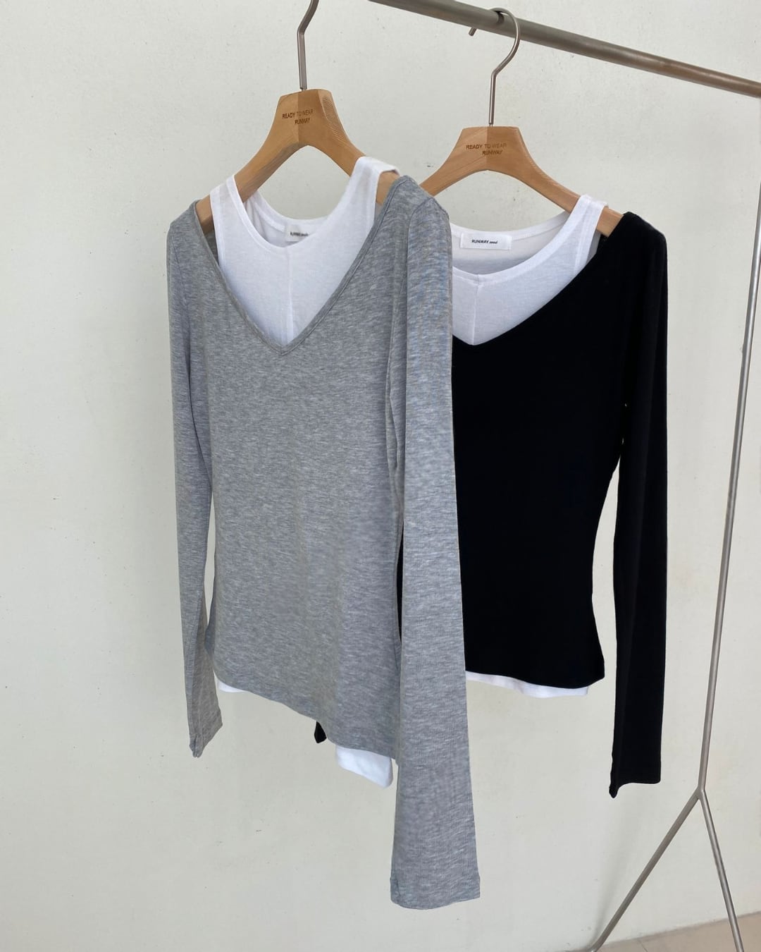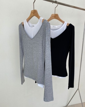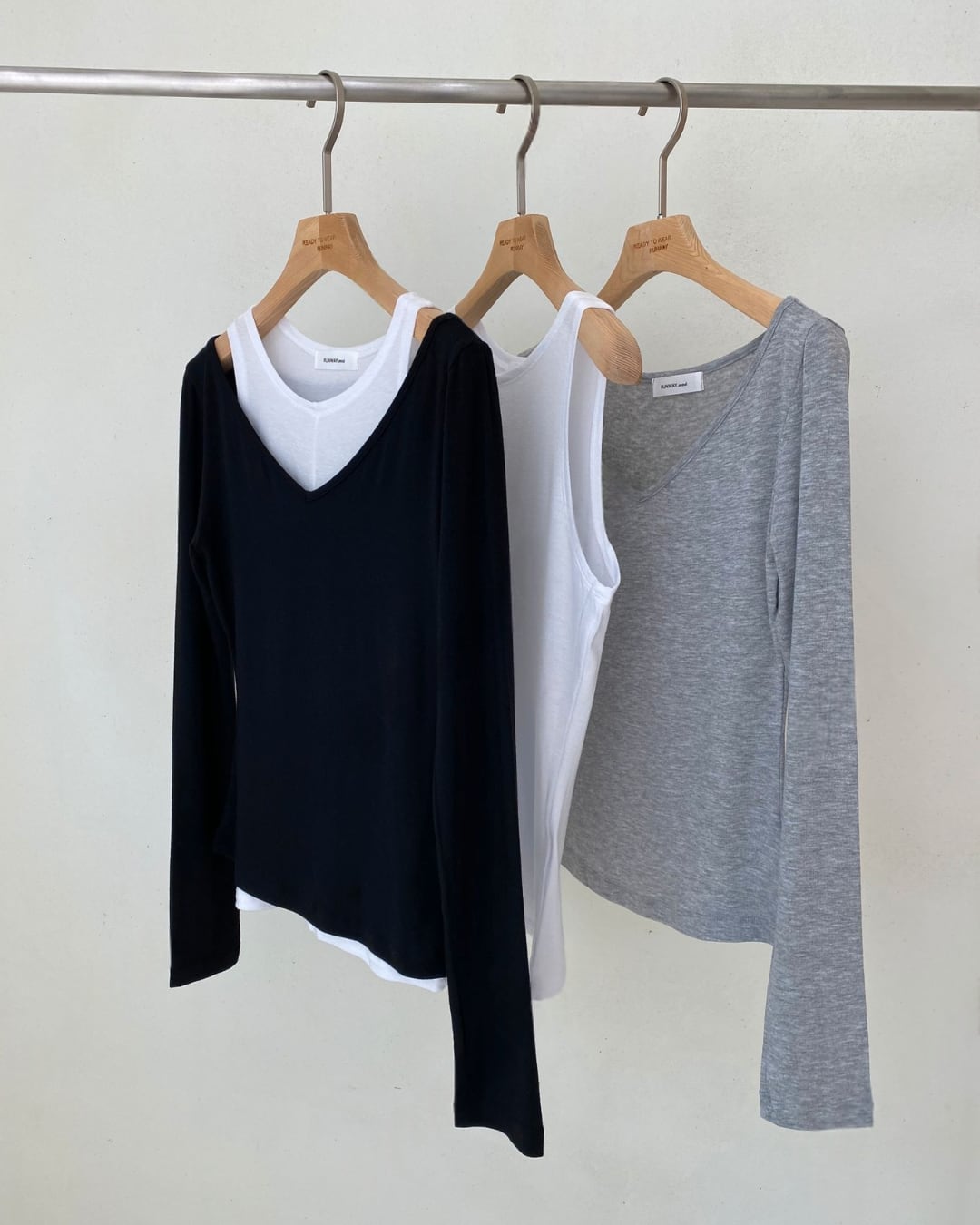 Vネック長袖トップスとノースリーブのレイヤードセット。程よくフィットするシルエットと柔らかな素材感で、女性らしい抜け感を演出します。それぞれ単品使いもできる着回し力の高いアイテムです。