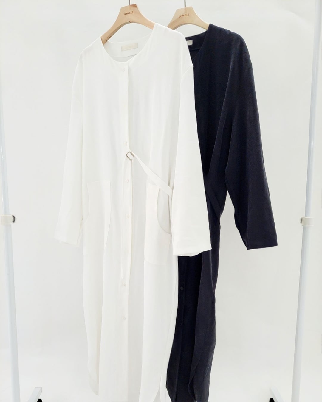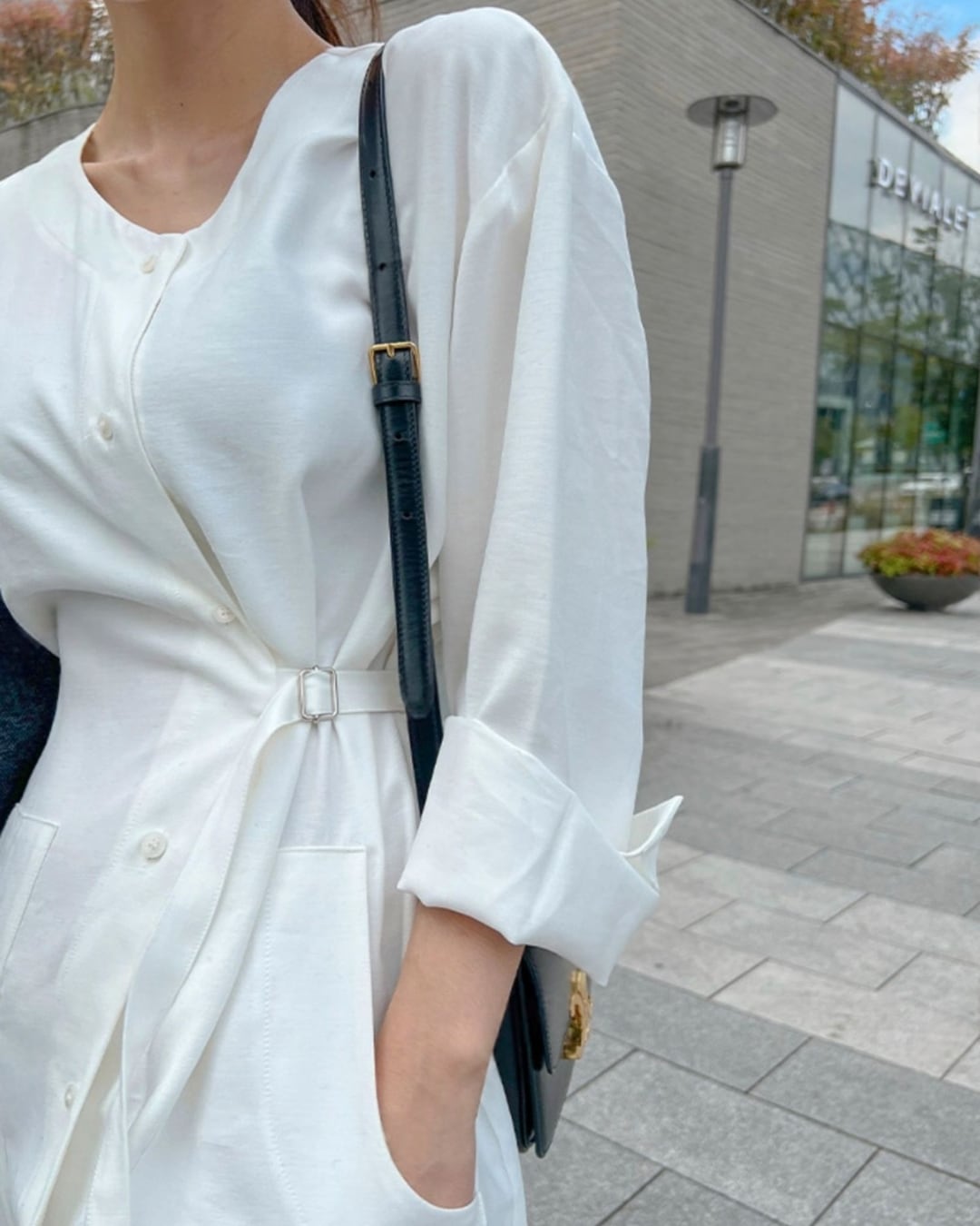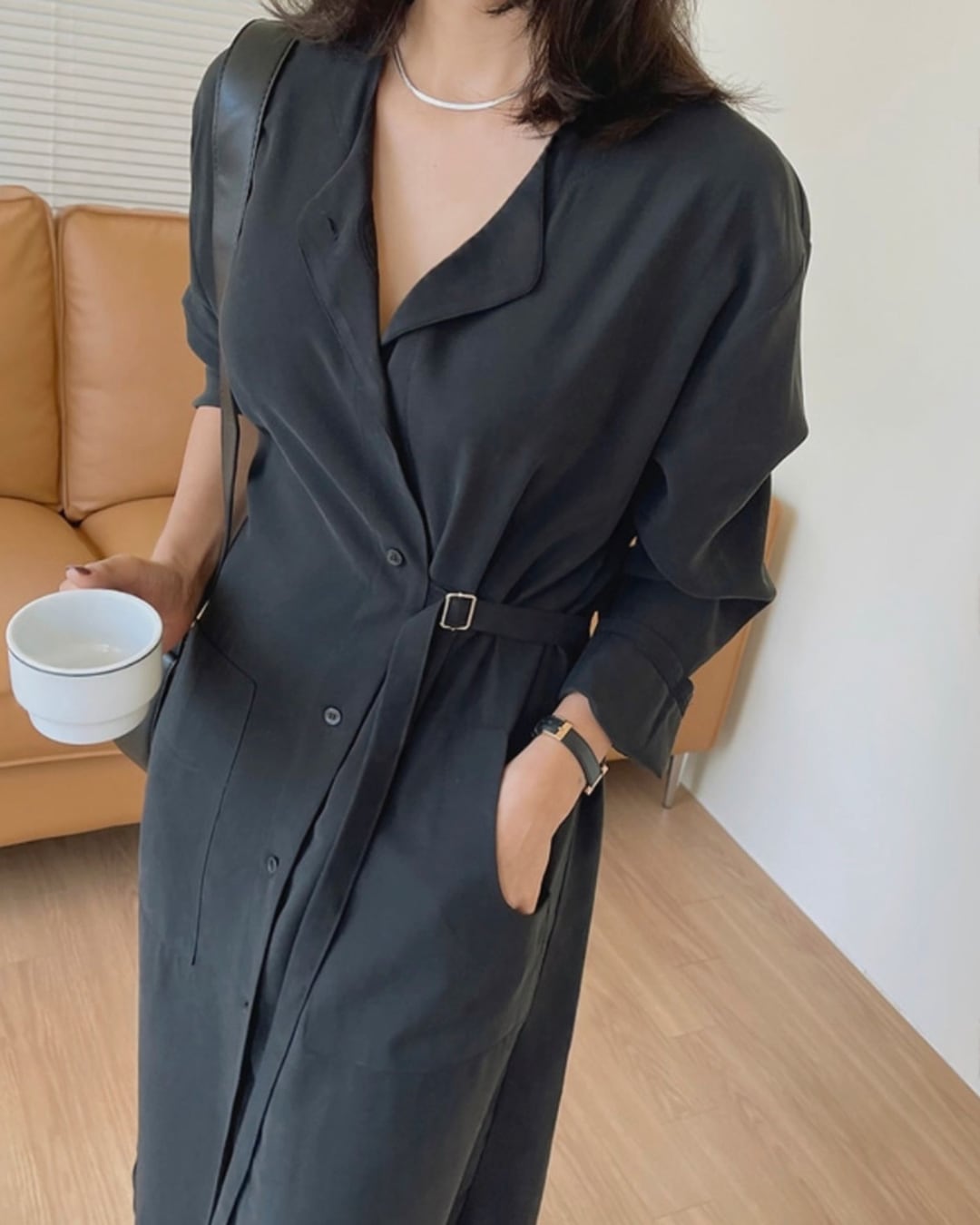 ウエストバックルデザインがポイントのシャツロングワンピース。程よくゆとりのあるシルエットで、1枚でも羽織りとしても着用可能。きれいめにもカジュアルにも着回せる上品なアイテムです。