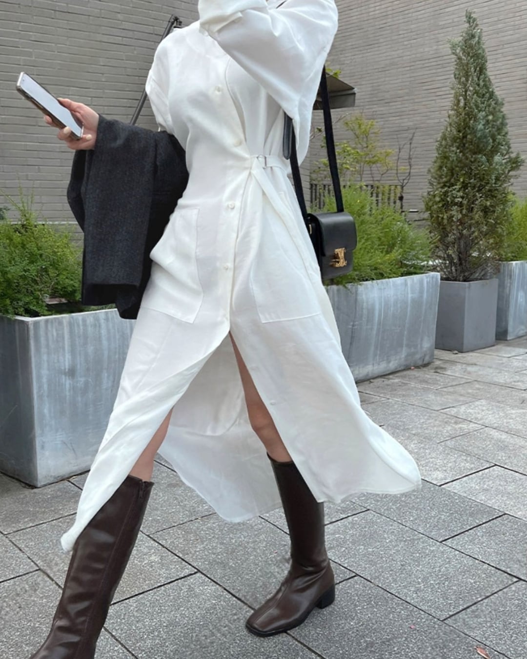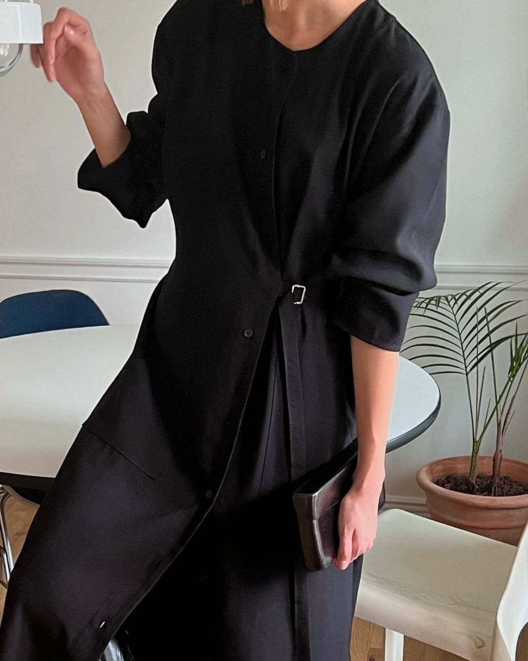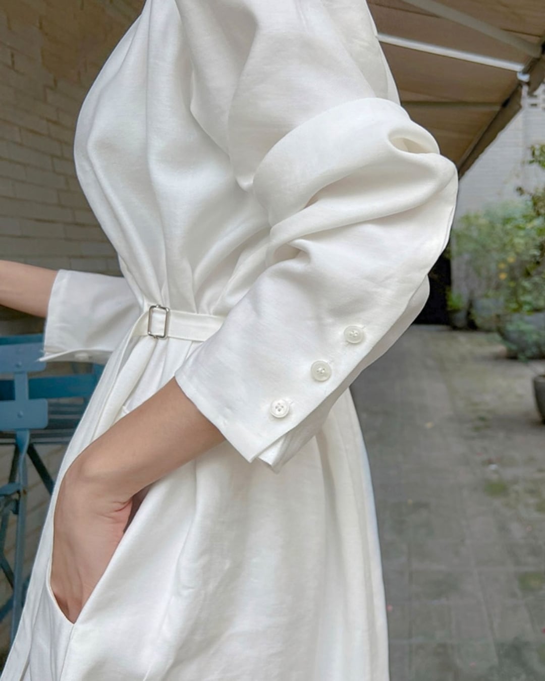 ウエストバックルデザインがポイントのシャツロングワンピース。程よくゆとりのあるシルエットで、1枚でも羽織りとしても着用可能。きれいめにもカジュアルにも着回せる上品なアイテムです。
