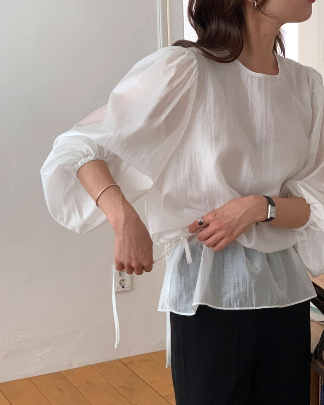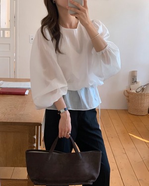 軽やかな素材感が魅力のダブルレイヤードブラウス。ふんわりとしたボリューム袖と裾ストリングデザインが女性らしい印象を演出します。きれいめにもカジュアルにも着回せる上品な一枚です。