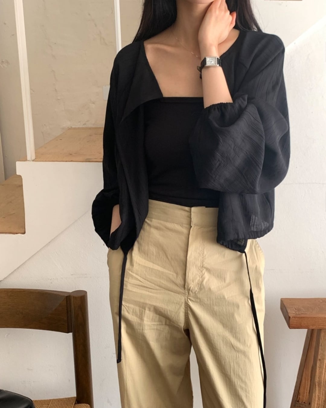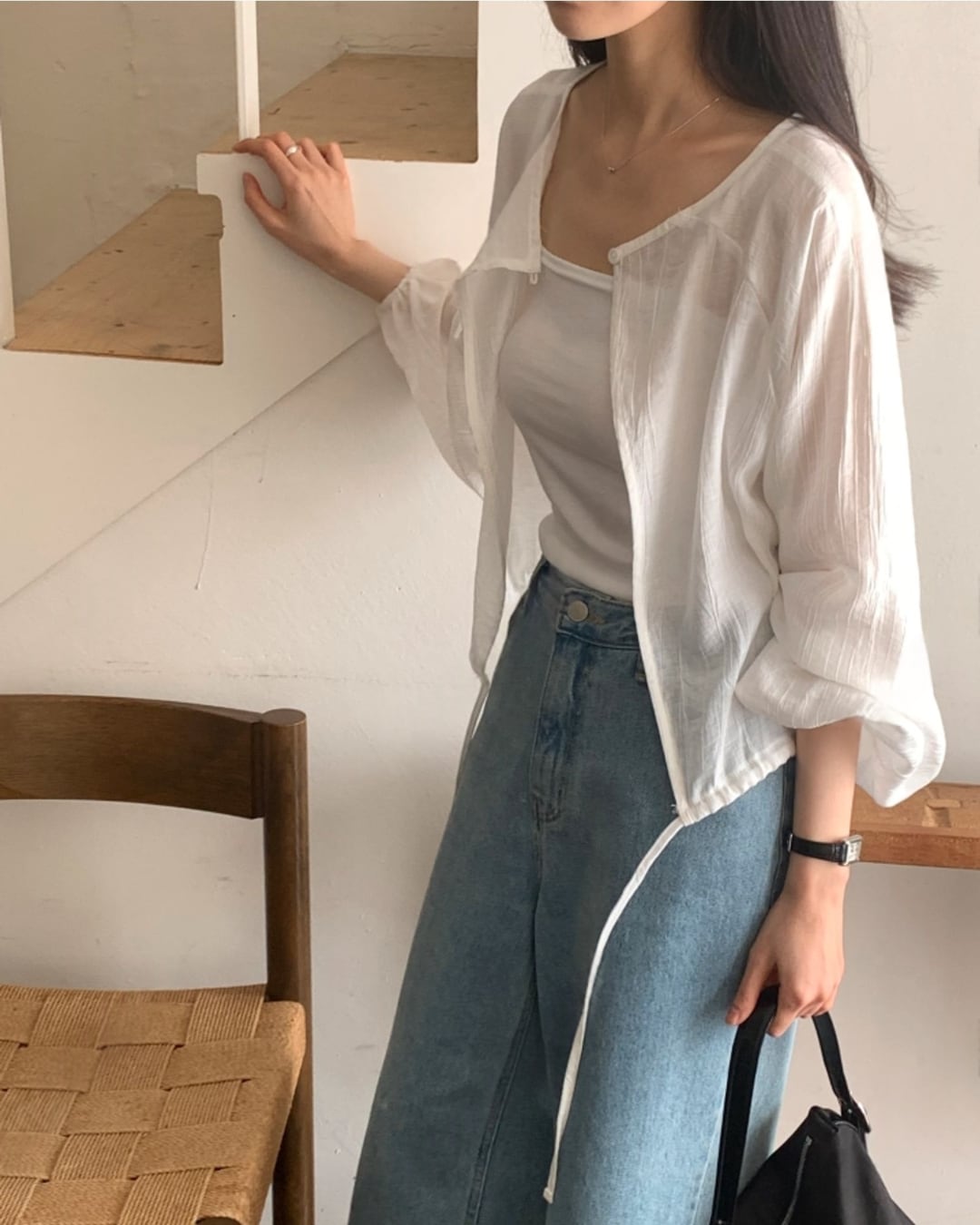 前後どちらでも着用できるツーウェイデザインのシアーブラウス。程よい透け感と軽やかな素材が、抜け感のある大人スタイルを演出します。バックにはさりげないスリットデザインを施し、後ろ姿まで印象的に。デニムと合わせたカジュアルスタイルはもちろん、ワンピースの羽織りとしても活躍する万能アイテムです。