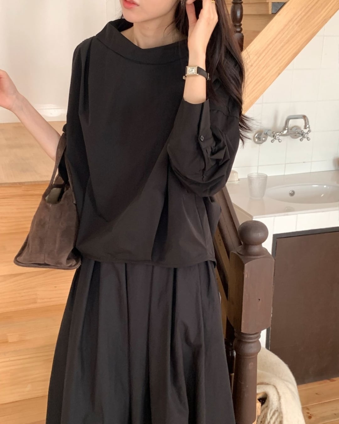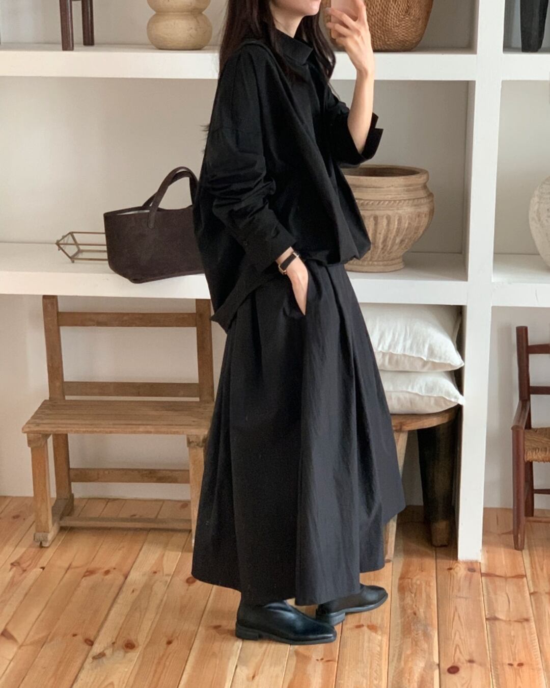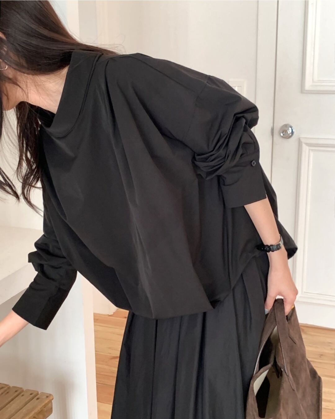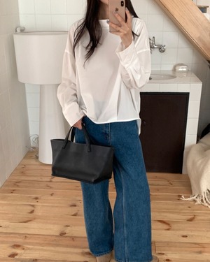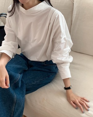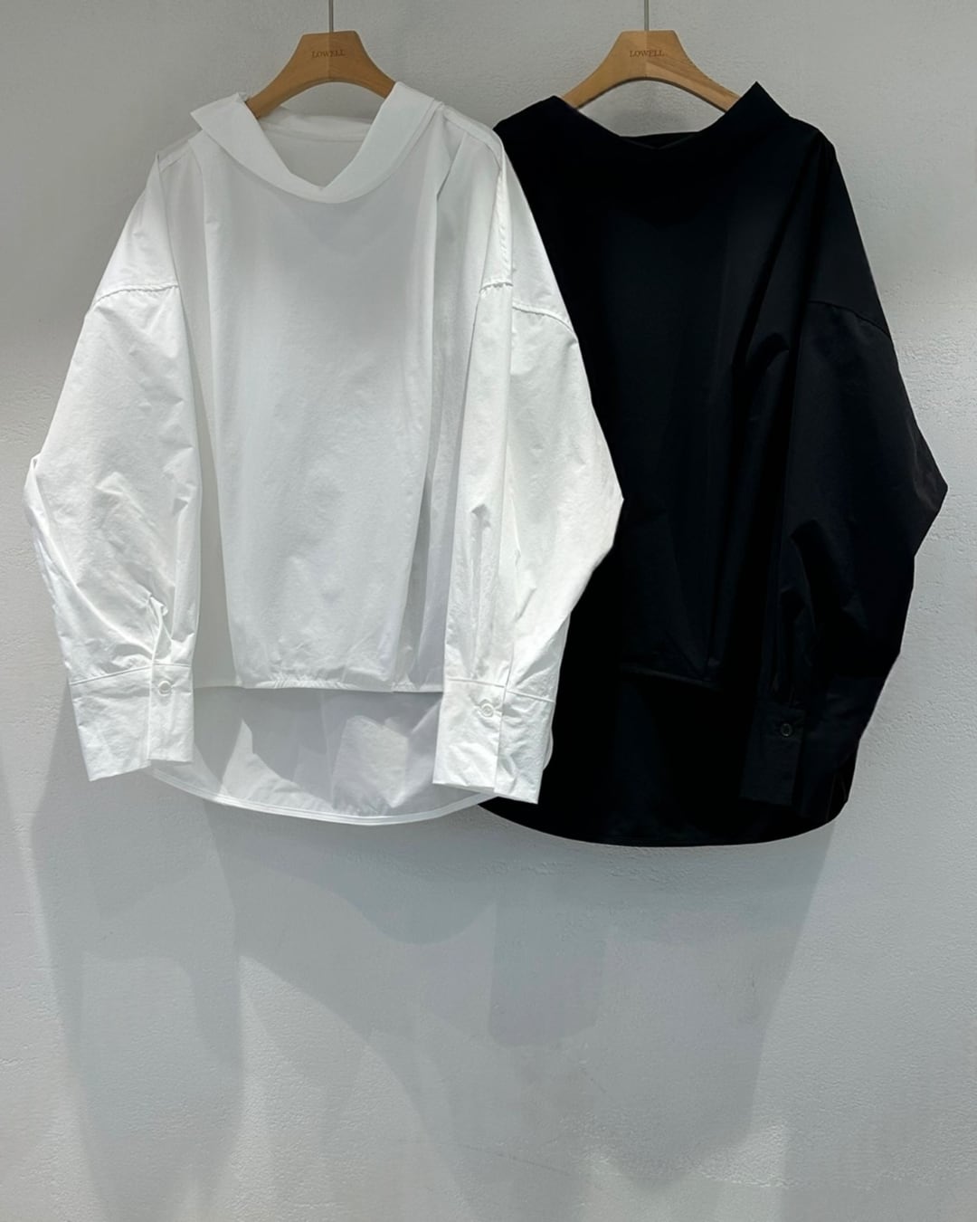立体感のあるカウルネックが印象的なボクシーシルエットのシャツブラウス。首元に自然なドレープを生み出し、シンプルながらも洗練された雰囲気を演出します。ラグラン仕様のゆったりとした身幅で、リラックス感のある着心地。前後差のある丈感で、アウトスタイルでもバランスよく決まります。
