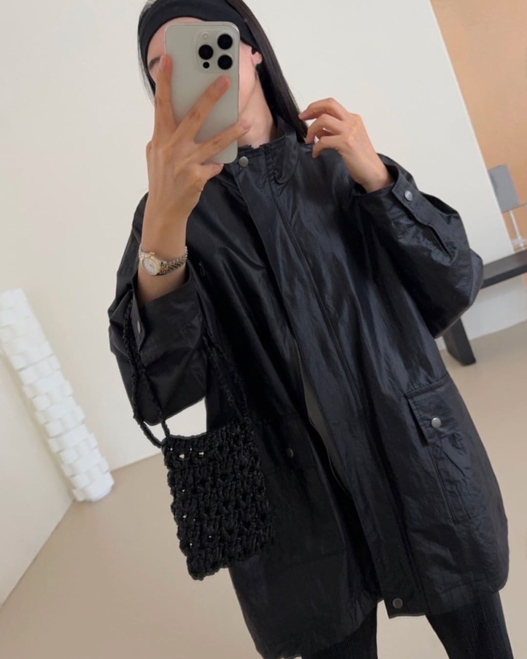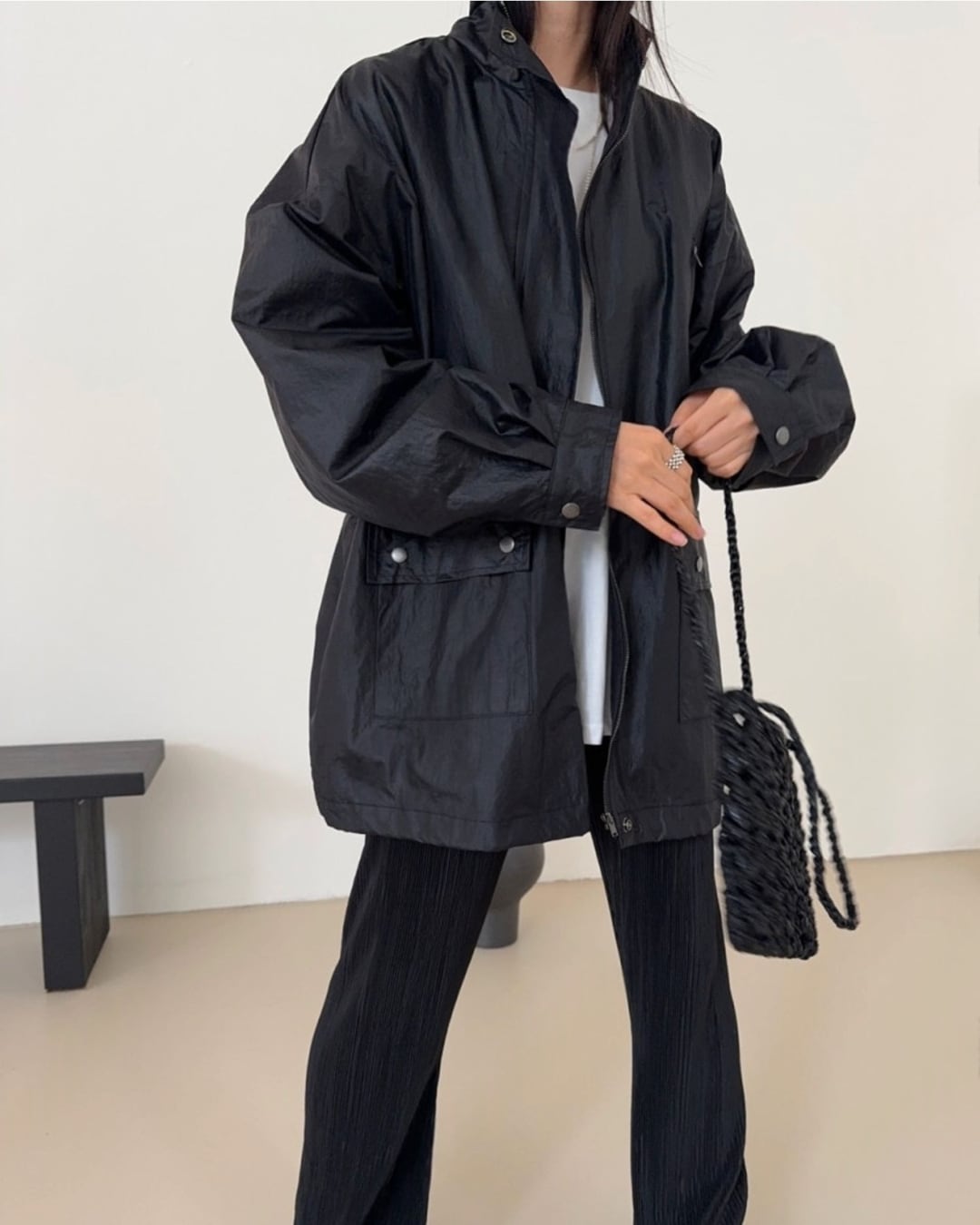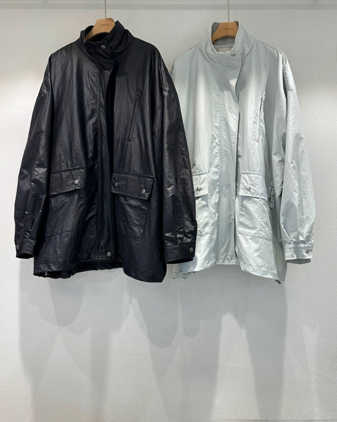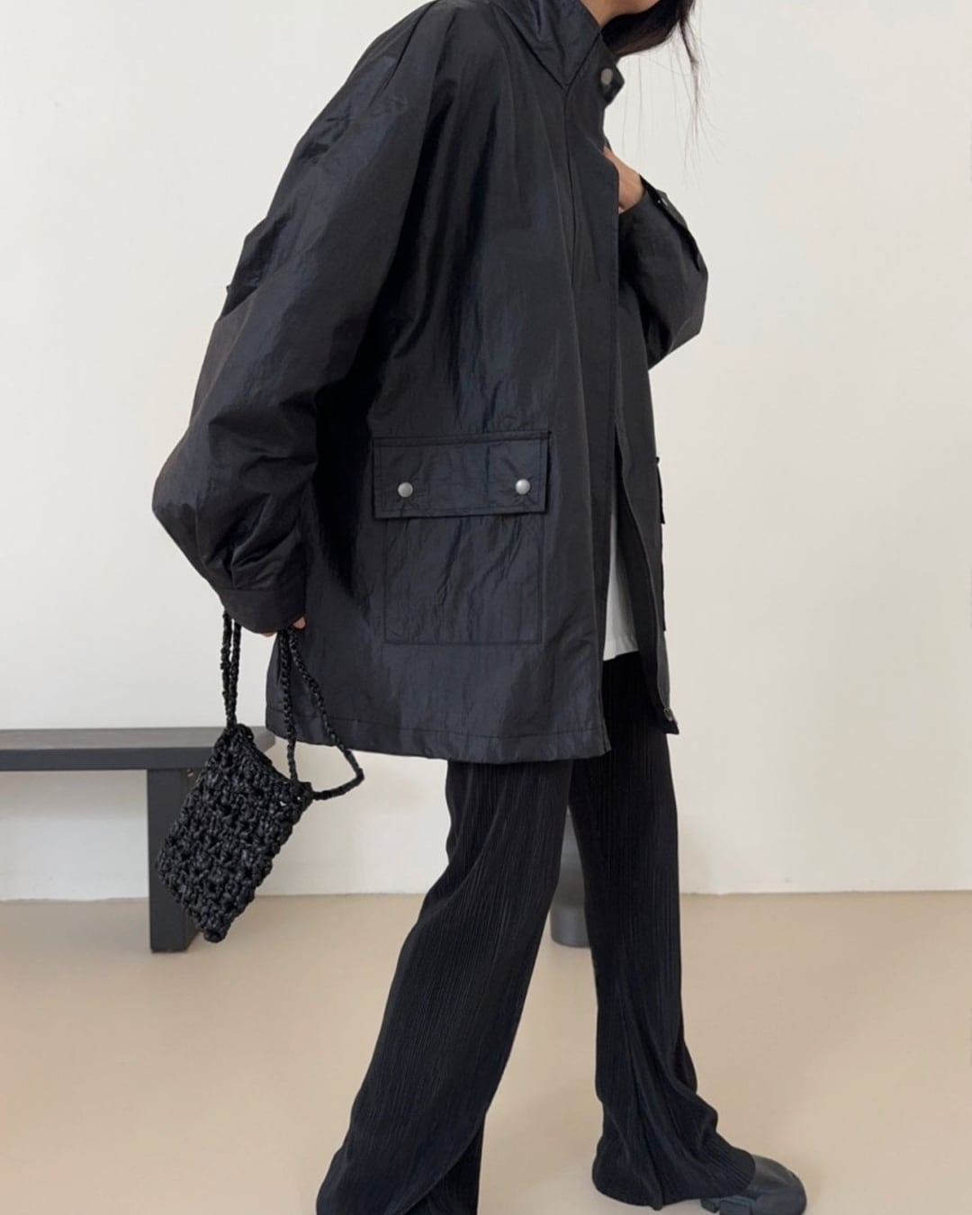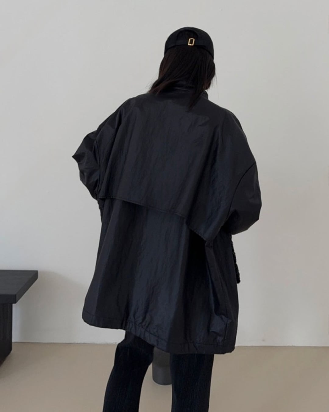 軽やかなナイロン素材で仕立てたミリタリーテイストのウインドブレーカージャケット。ルーズフィットのシルエットで、さっと羽織るだけでこなれた印象に仕上がります。スタンドネックデザインと大きめポケットがアクセントになり、実用性も兼ね備えた一着。ヒップが隠れるロング丈で、パンツスタイルとの相性も抜群です。