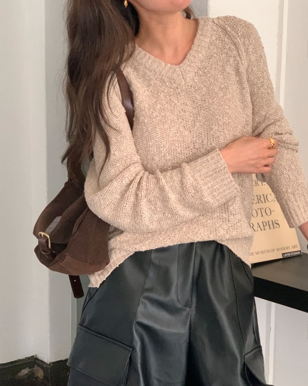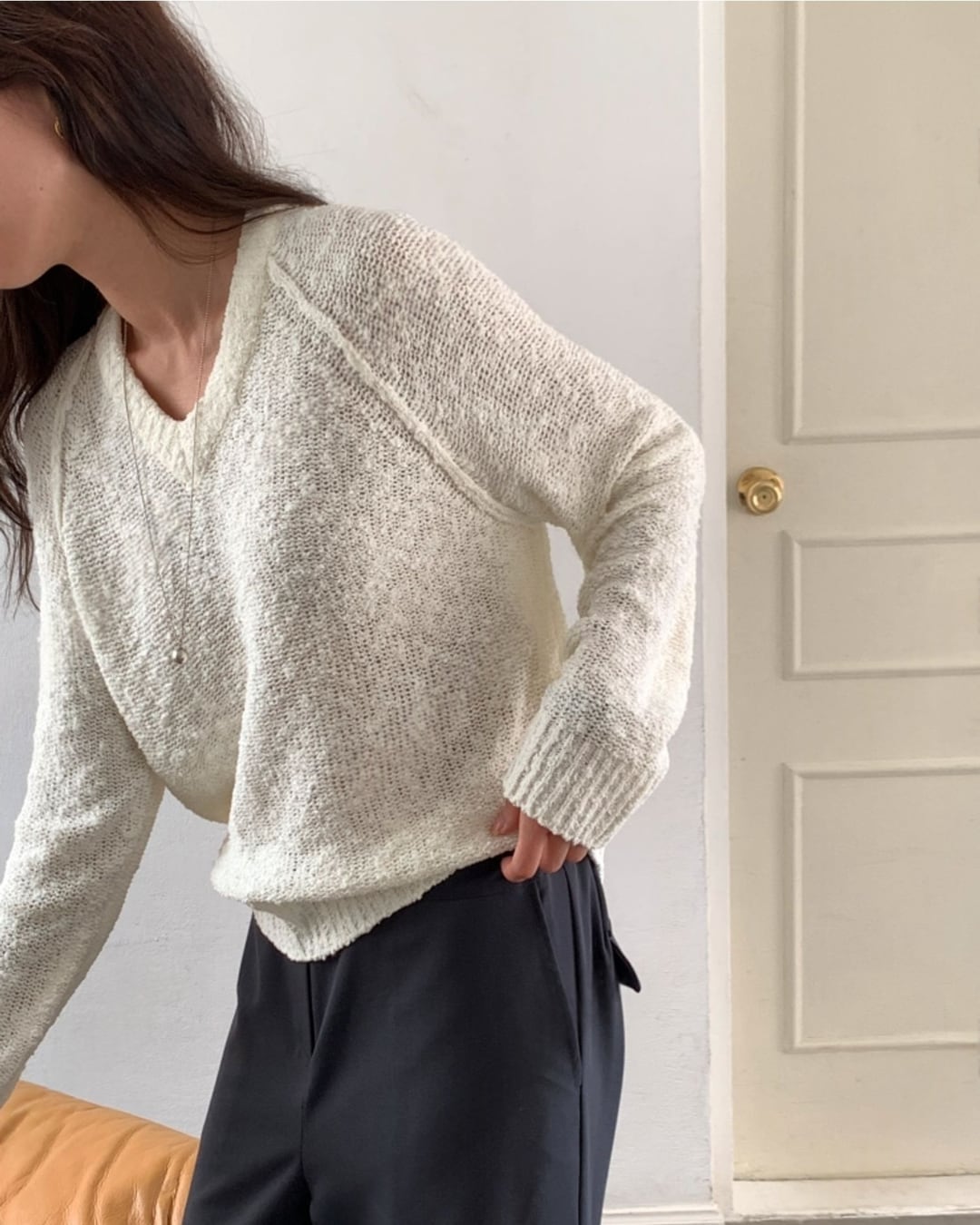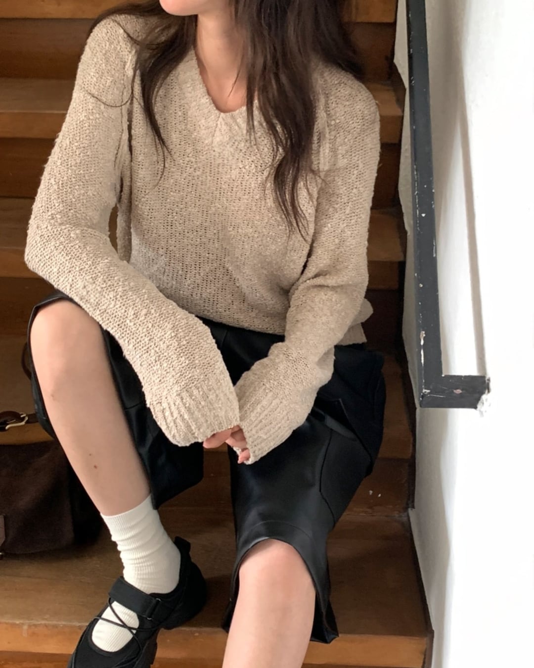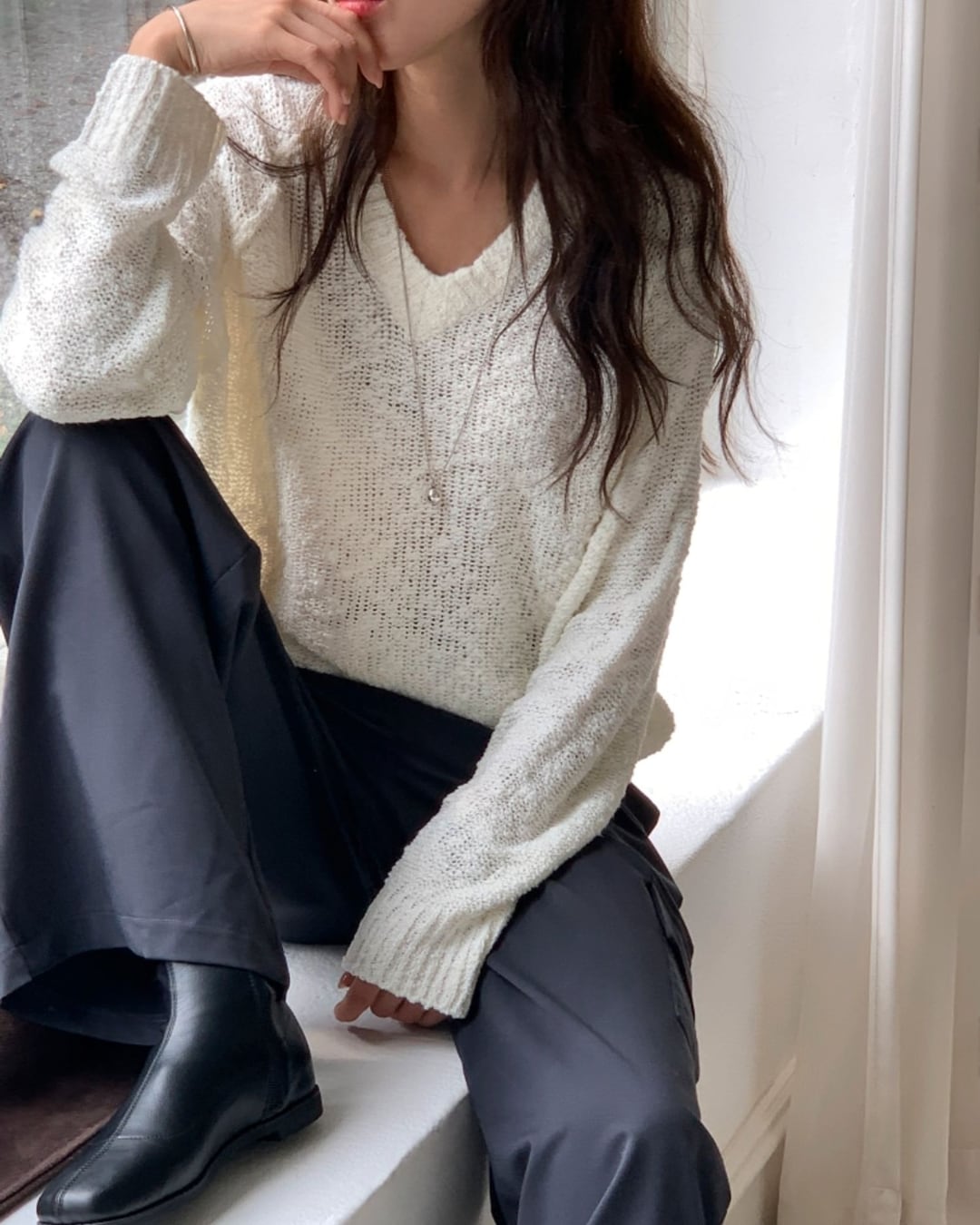 #Vネックニット #ポップコーン編み #ルーズフィット #大人カジュアル #秋冬コーデ