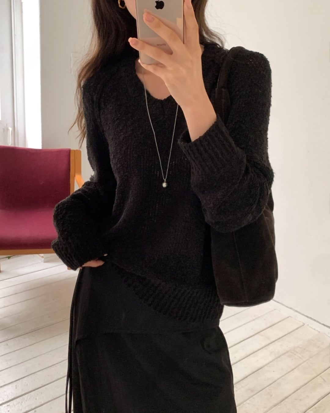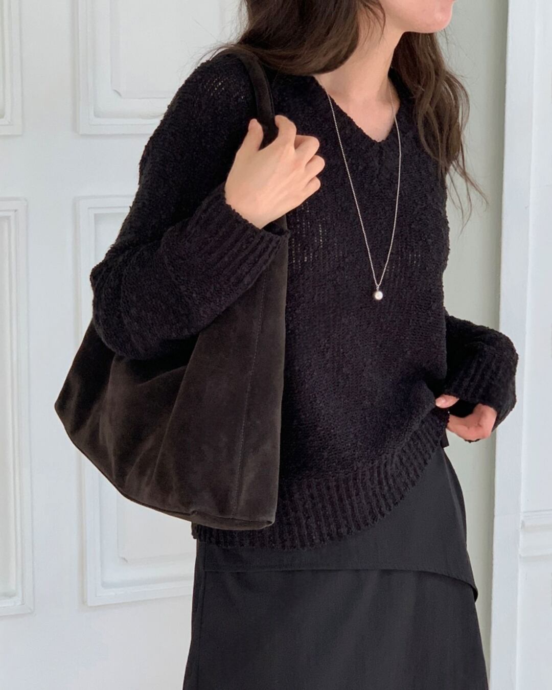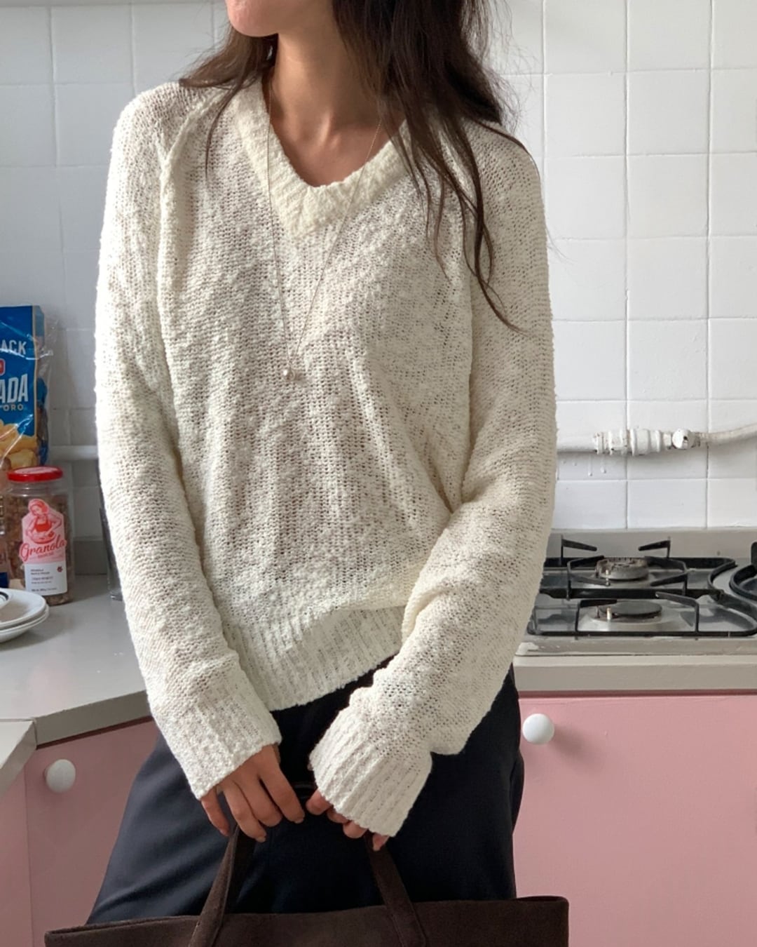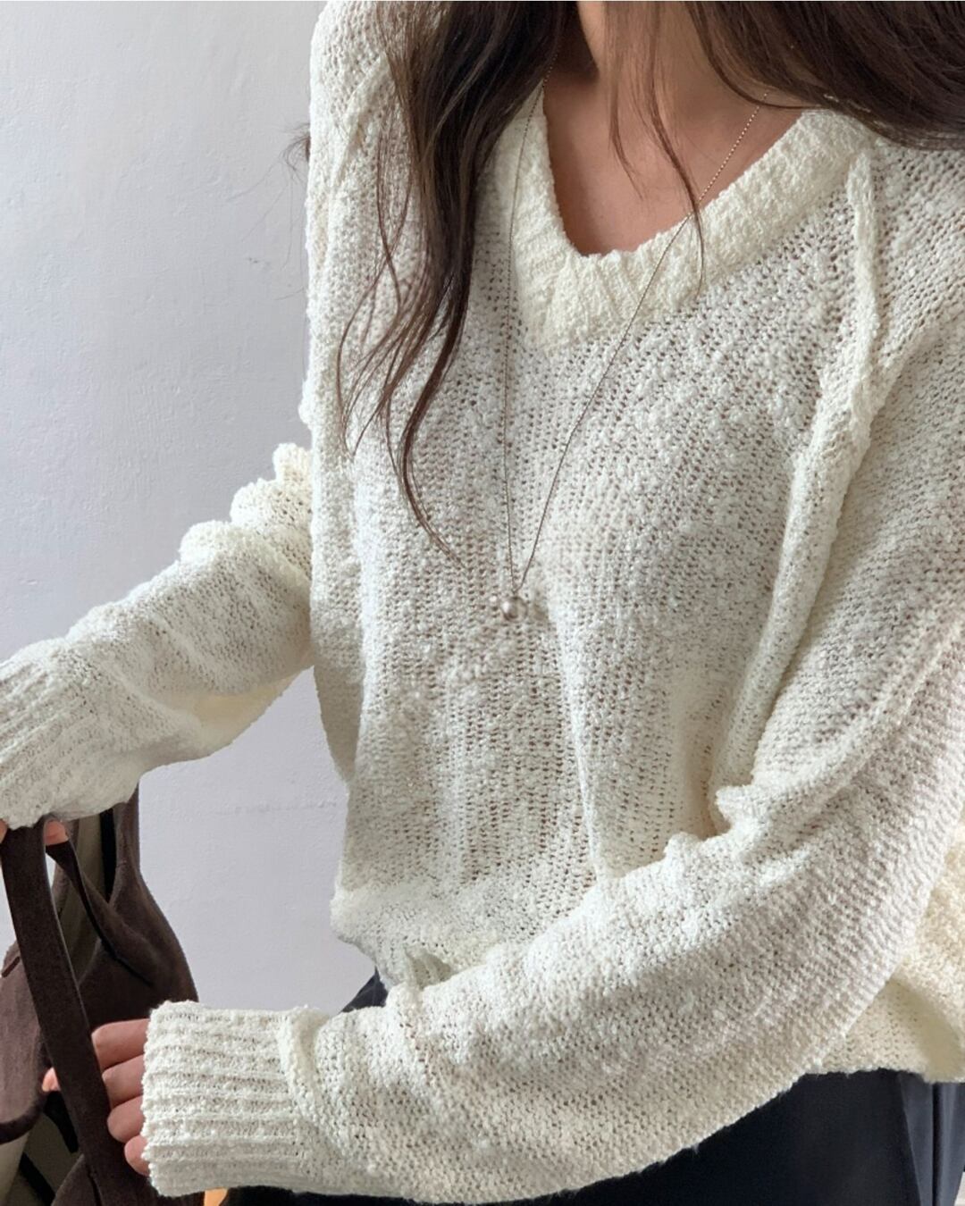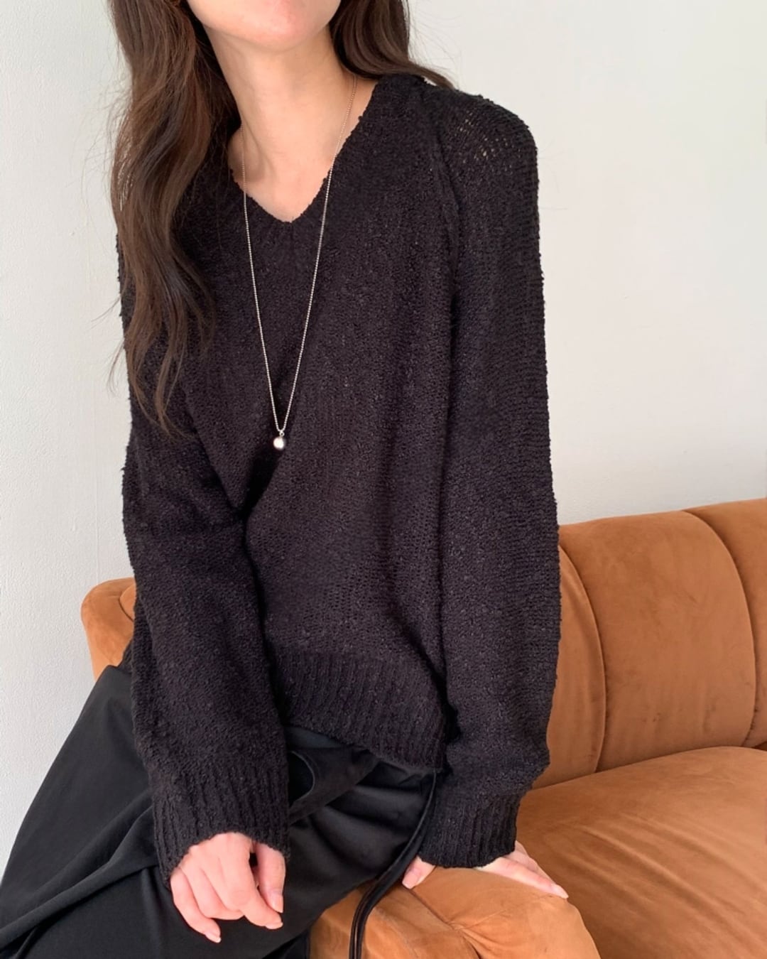 立体感のあるポップコーン編みが魅力のVネックニット。表情のある編地がコーデにさりげないアクセントをプラスし、シンプルながらも存在感のある一枚です。ゆったりとしたルーズフィットシルエットで、リラックス感のある着心地。デニムやスラックス、スカートとも好相性で、デイリーに活躍する万能ニットです。