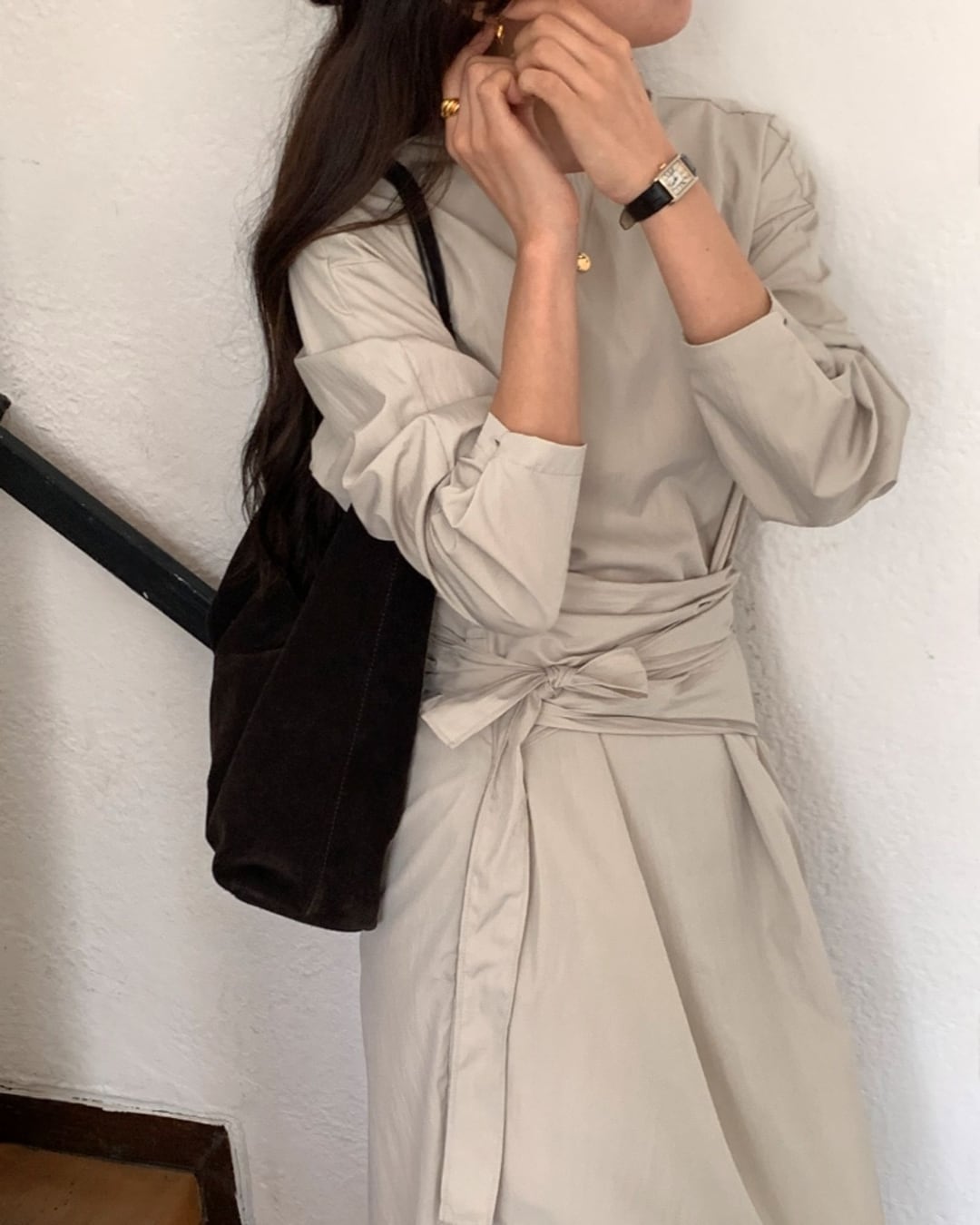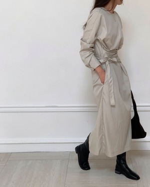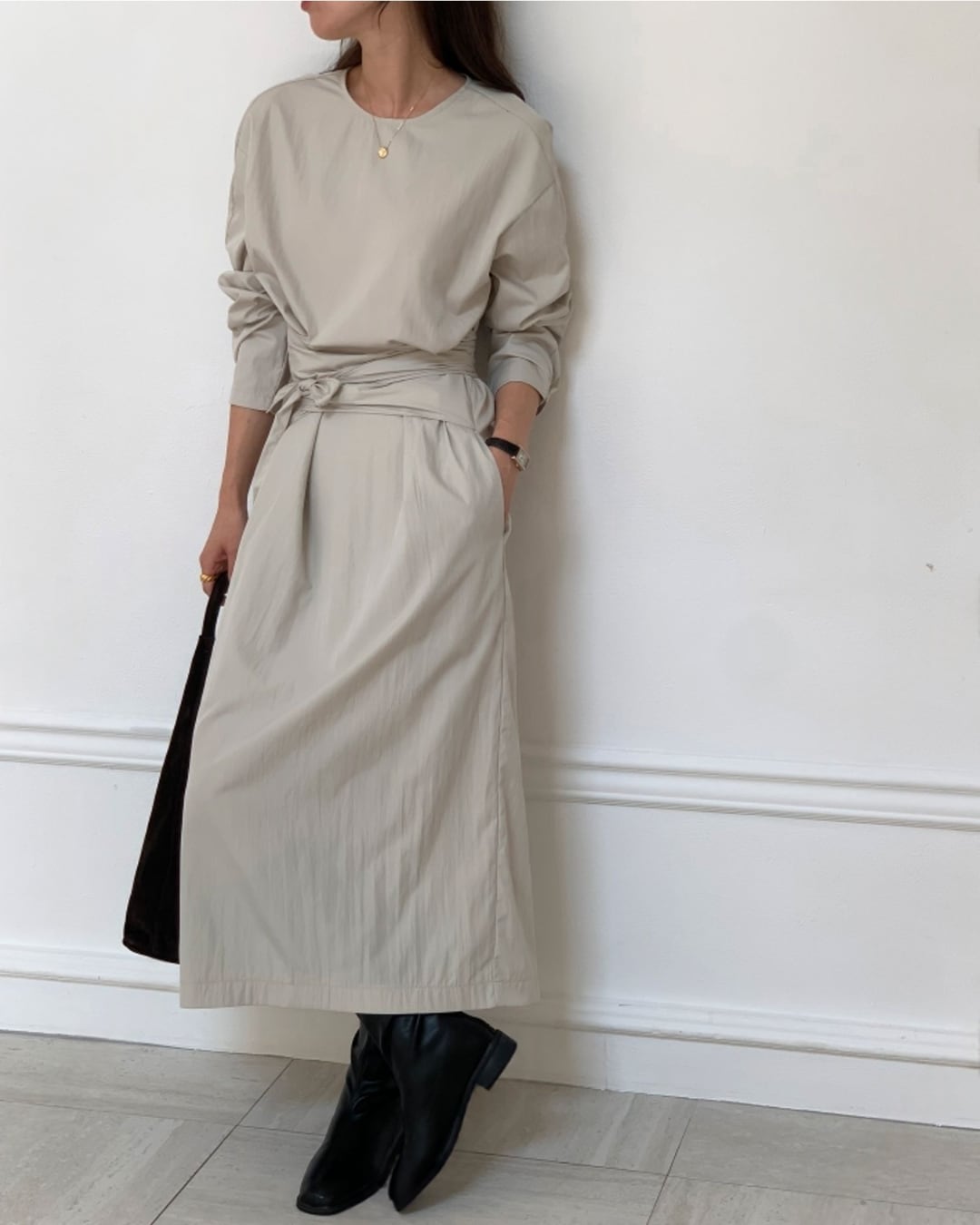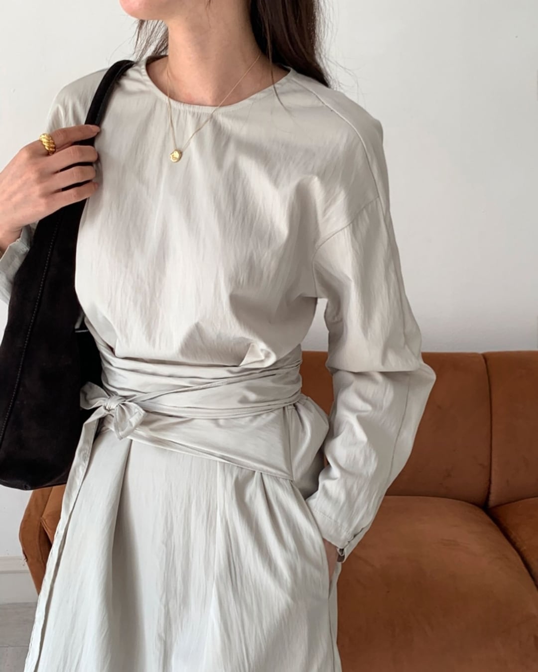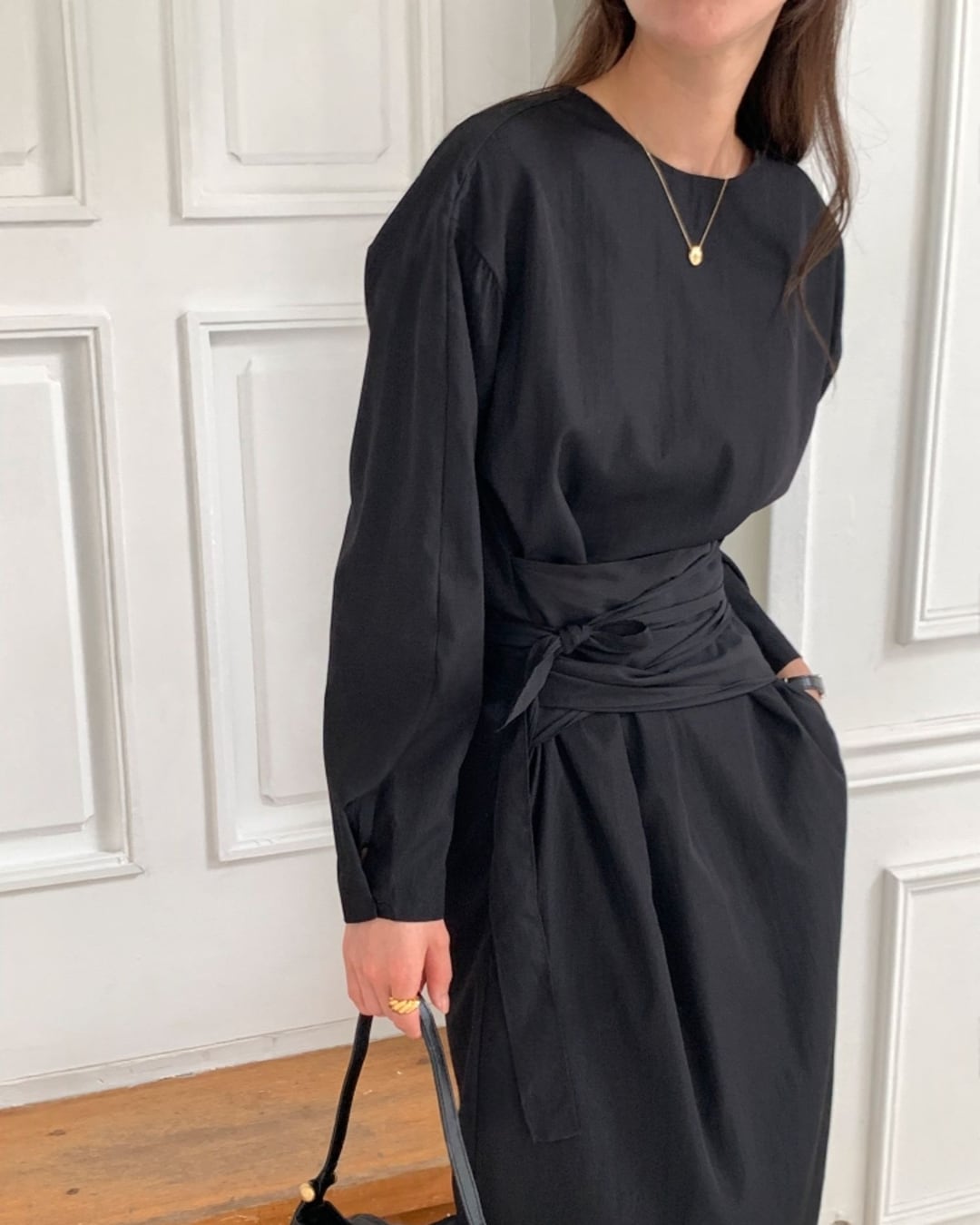 ウエストのラップストラップがアクセントになった、洗練されたロングワンピース。ゆったりとしたボクシーシルエットに、ウエストマークデザインをプラスすることで、メリハリのある大人スタイルが完成します。軽やかな素材感で着心地も快適。ラグランスリーブ仕様で肩まわりも動きやすく、程よい抜け感を演出します。ブーツやパンプスと合わせて、きれいめにもカジュアルにも着回せる万能ワンピースです。
