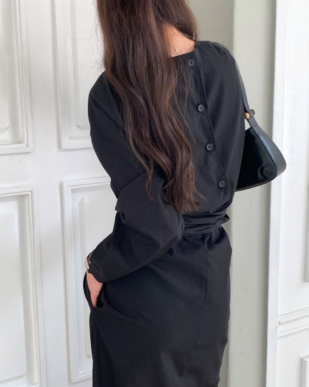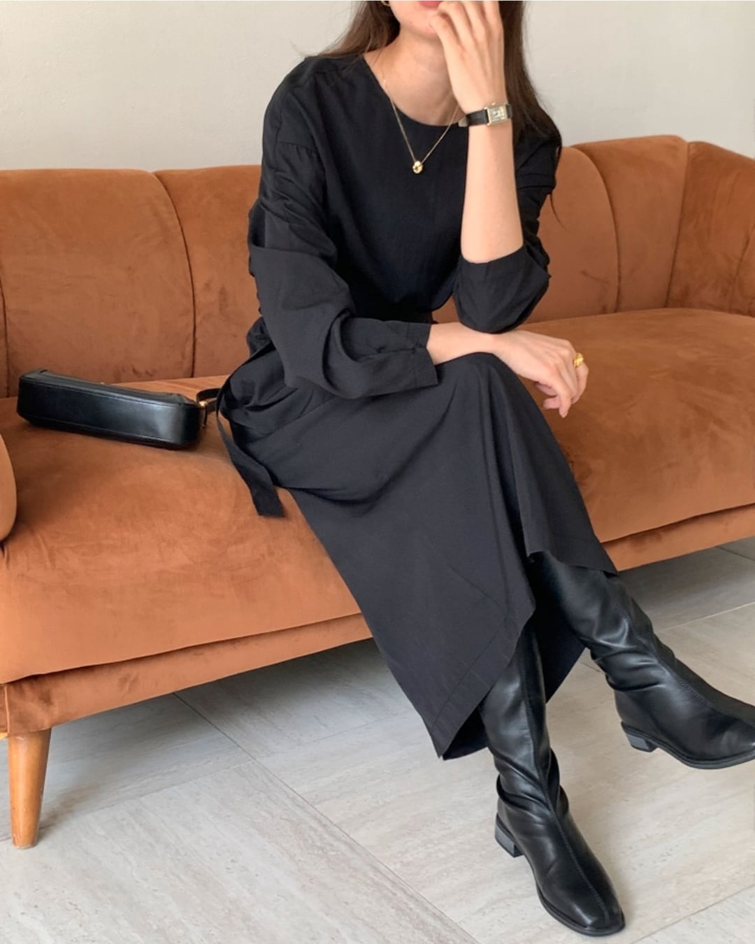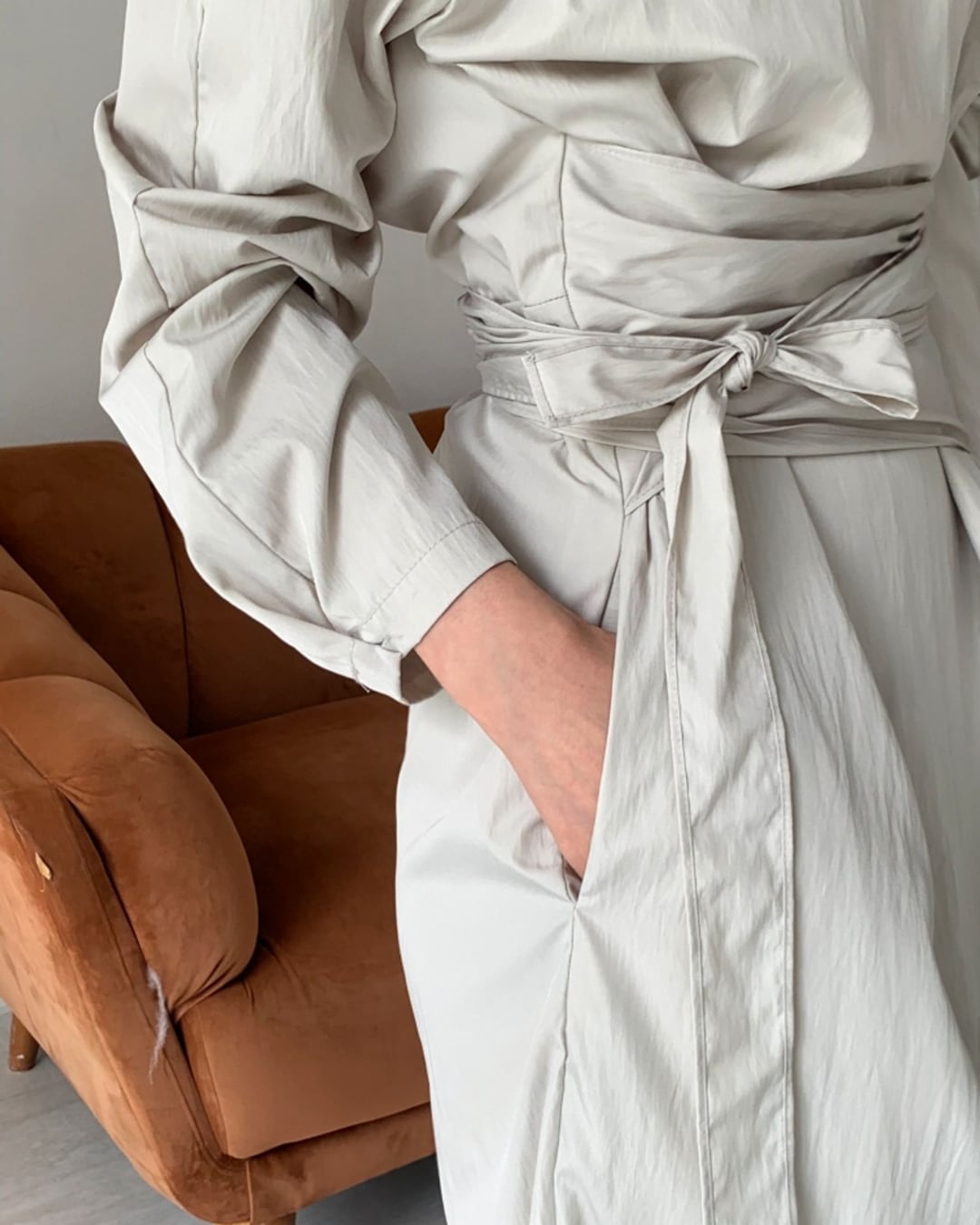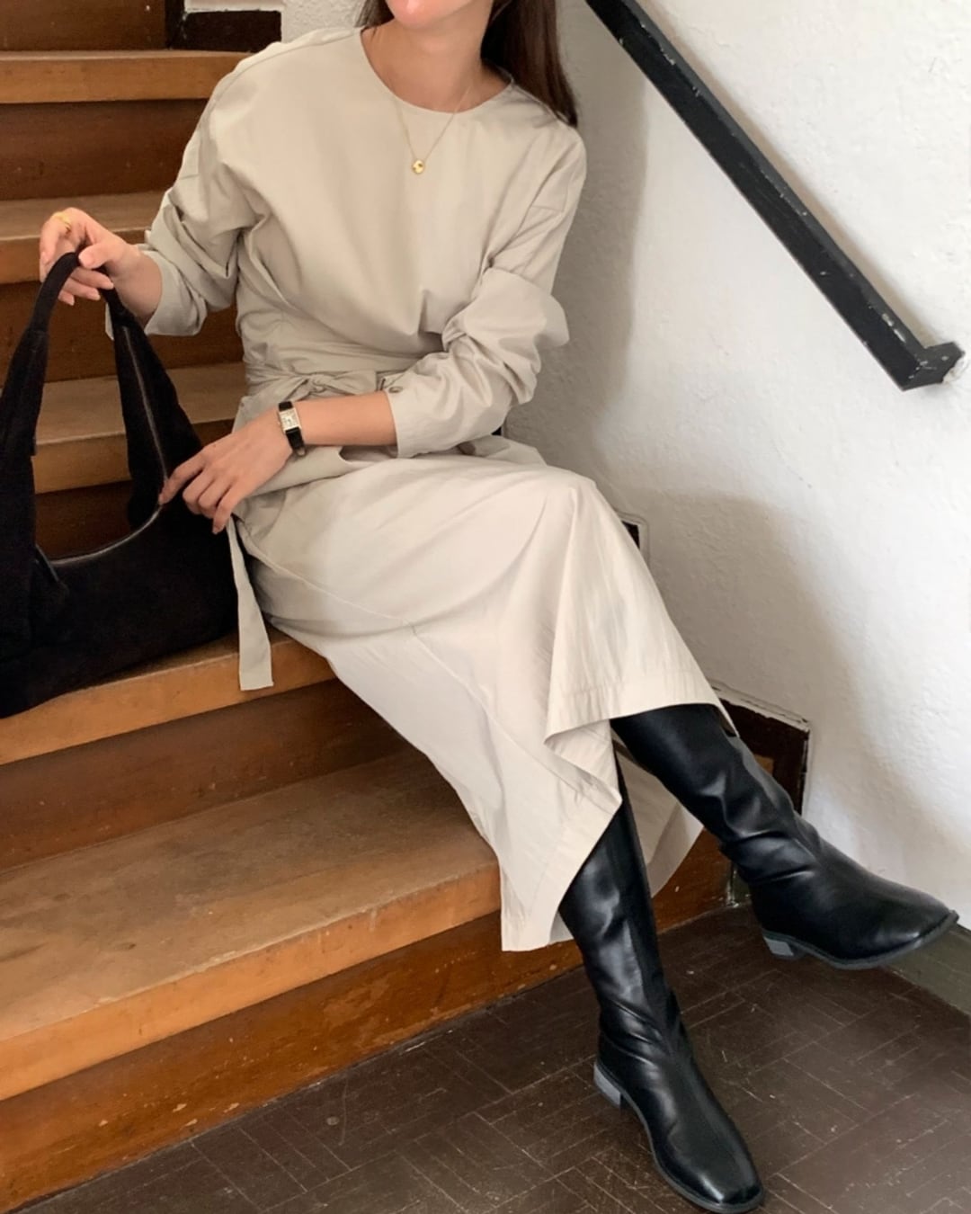 ウエストのラップストラップがアクセントになった、洗練されたロングワンピース。ゆったりとしたボクシーシルエットに、ウエストマークデザインをプラスすることで、メリハリのある大人スタイルが完成します。軽やかな素材感で着心地も快適。ラグランスリーブ仕様で肩まわりも動きやすく、程よい抜け感を演出します。ブーツやパンプスと合わせて、きれいめにもカジュアルにも着回せる万能ワンピースです。