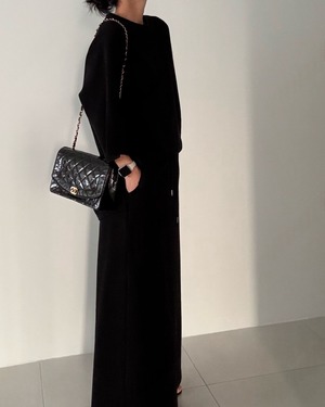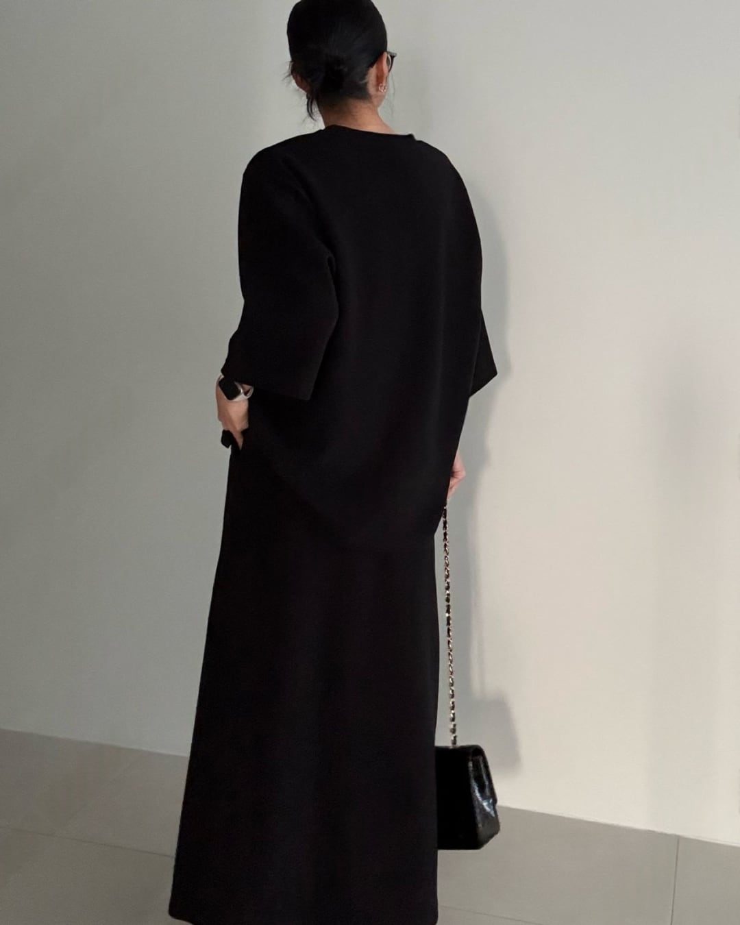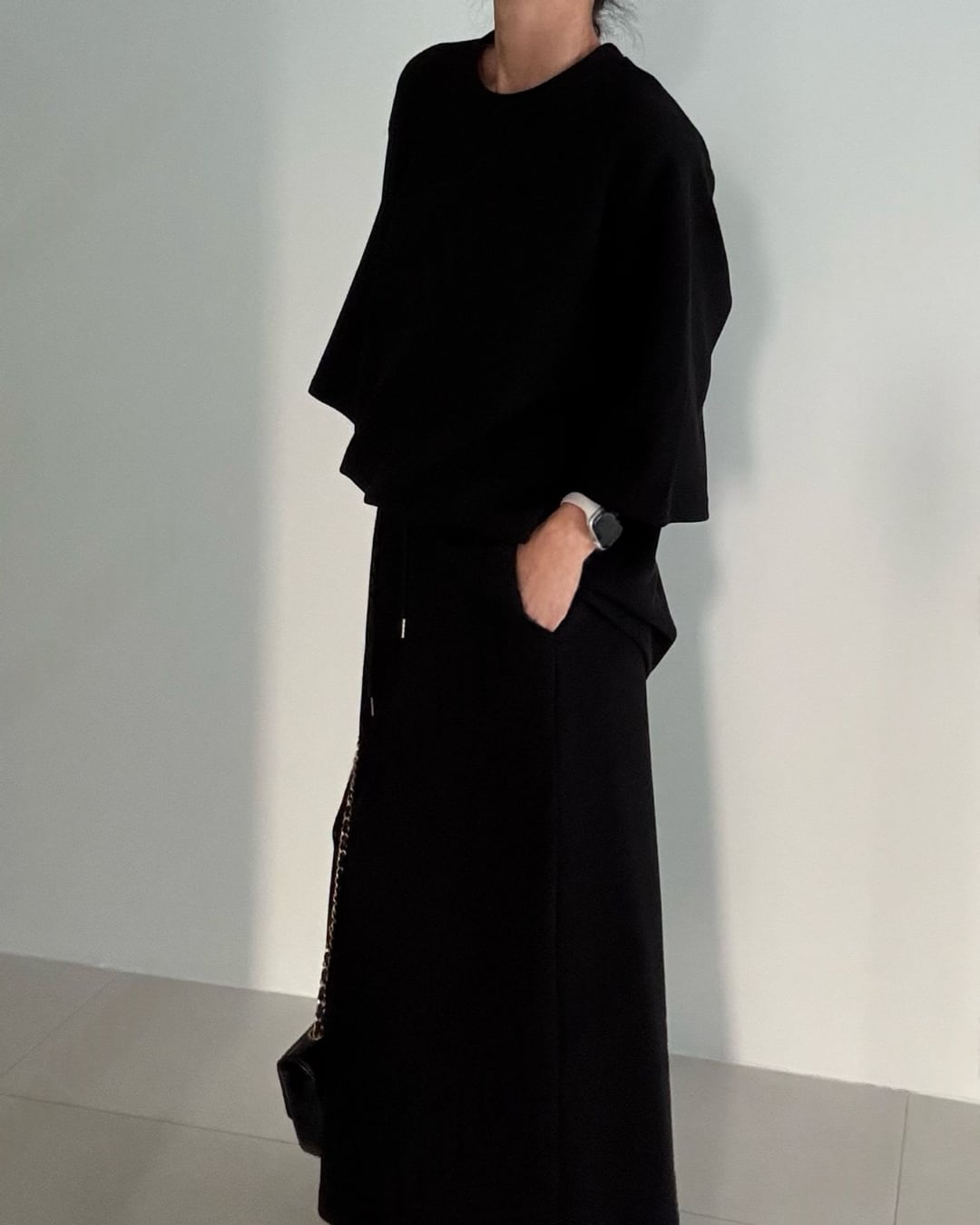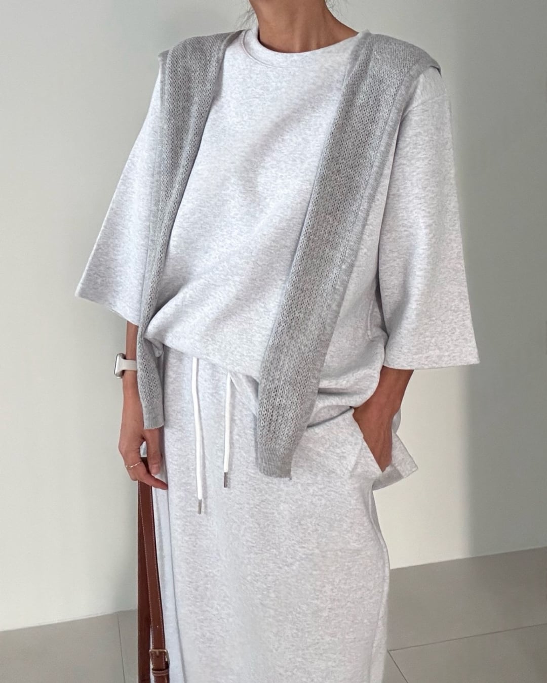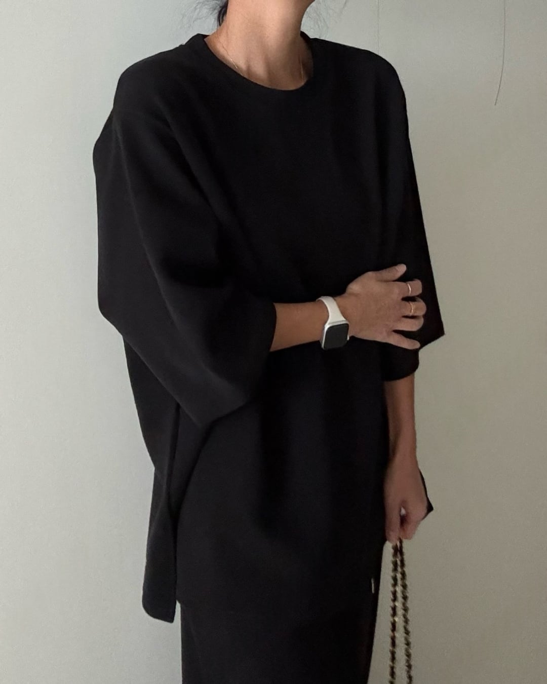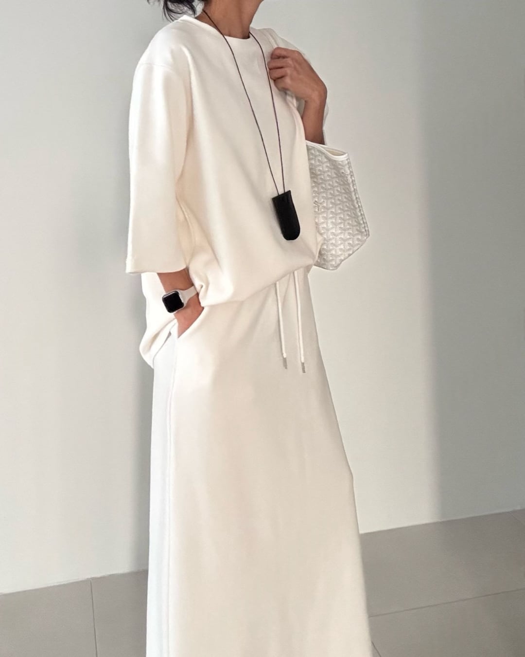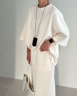 リラックス感と洗練された雰囲気を兼ね備えたセットアップ。ゆったりとしたハーフスリーブトップスと、すっきりとしたロングスカートのバランスが絶妙な一着です。程よい厚みと伸縮性のある素材で、着心地も快適。上下セットで着るだけでコーディネートが完成し、忙しい日にも頼れるアイテムです。それぞれ単品でも着回しができ、トップスはデニム合わせ、スカートはシャツやニット合わせなど幅広いスタイリングが楽しめます。大人のきれいめカジュアルにぴったりの万能セットアップです。
