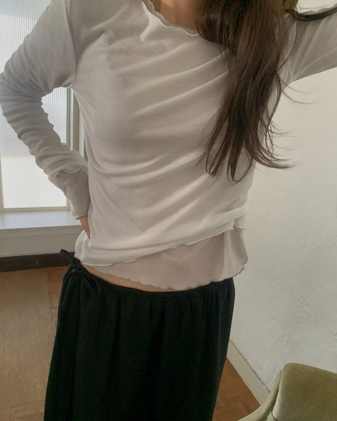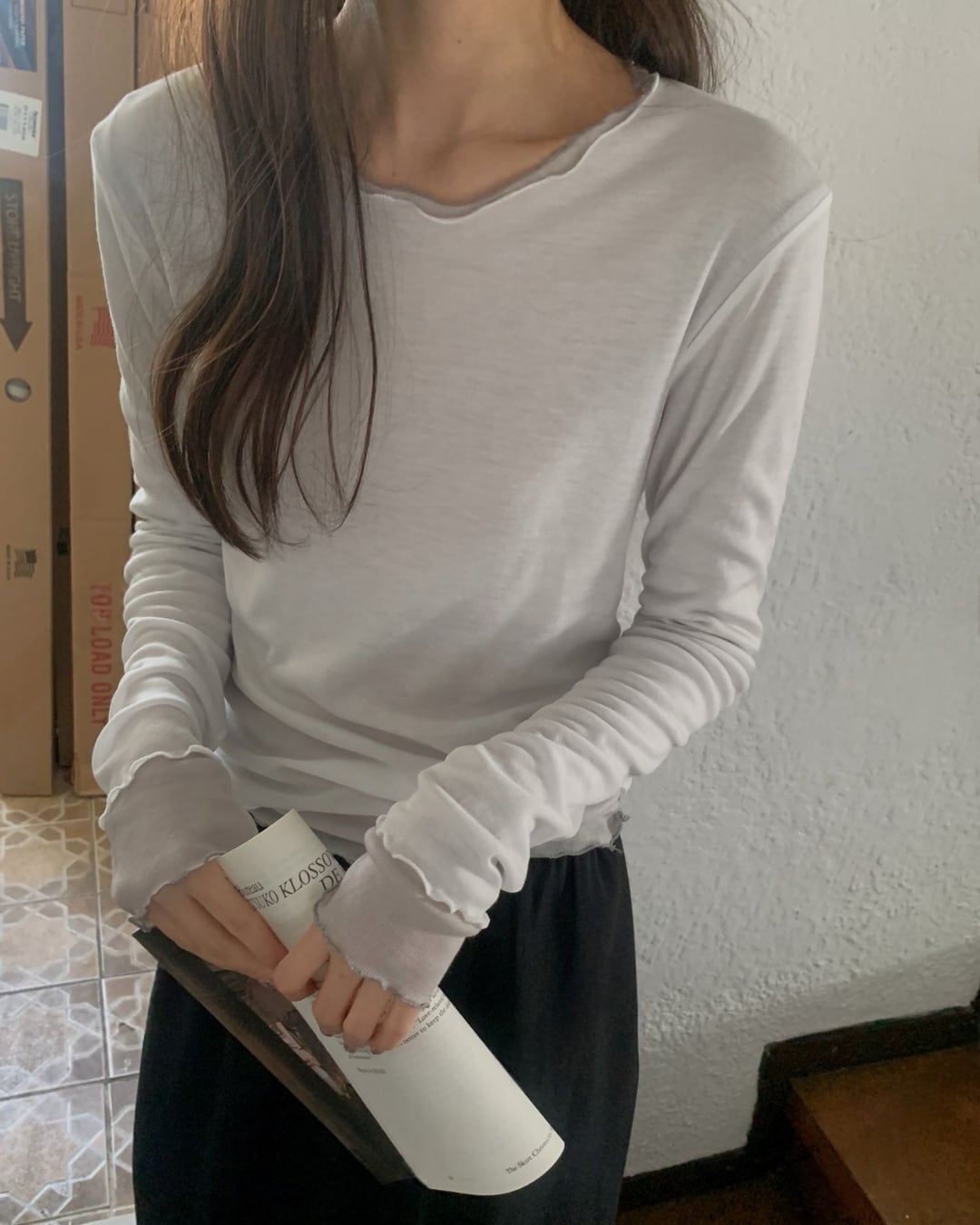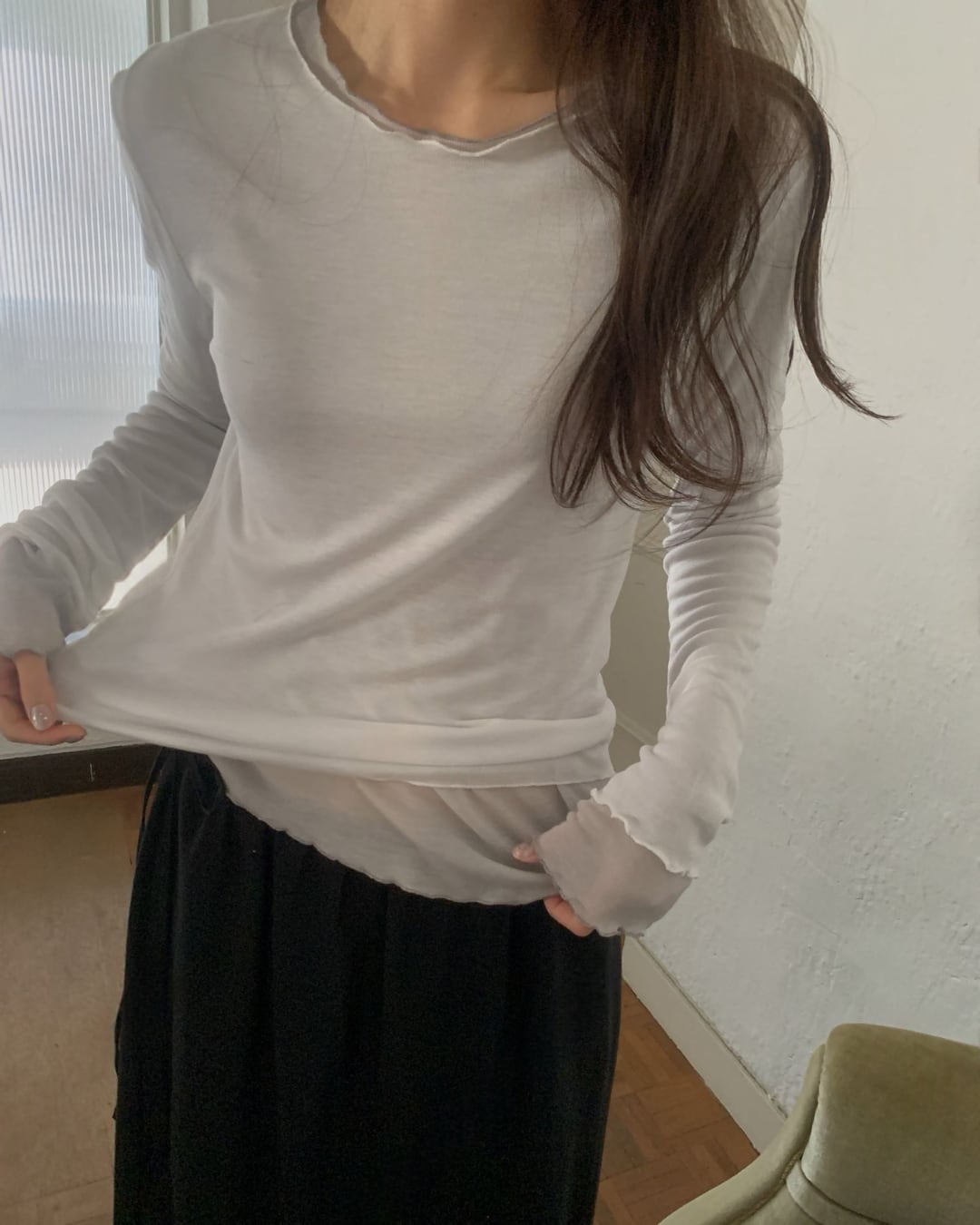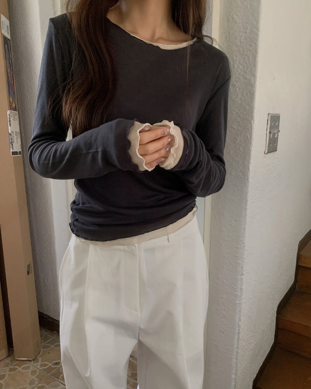 配色メロウがさりげないアクセントになるロングスリーブトップス。首元・袖口・裾にあしらわれたフリルデザインが女性らしさを引き立て、レイヤード風の着こなしを一枚で楽しめるアイテムです。やわらかく滑らかなテンセル混素材で、肌触りが良く快適な着心地。ほどよいフィット感があり、インナーとしても一枚着としても活躍します。パンツにもスカートにも合わせやすく、デイリーコーデに取り入れやすい万能トップスです。