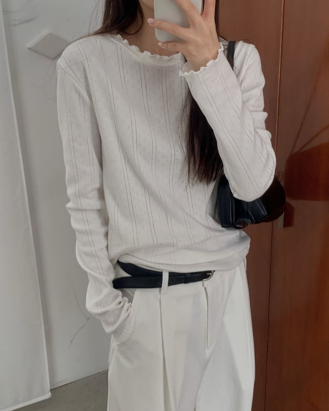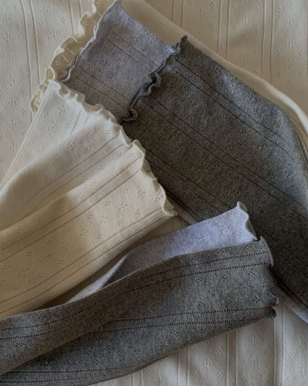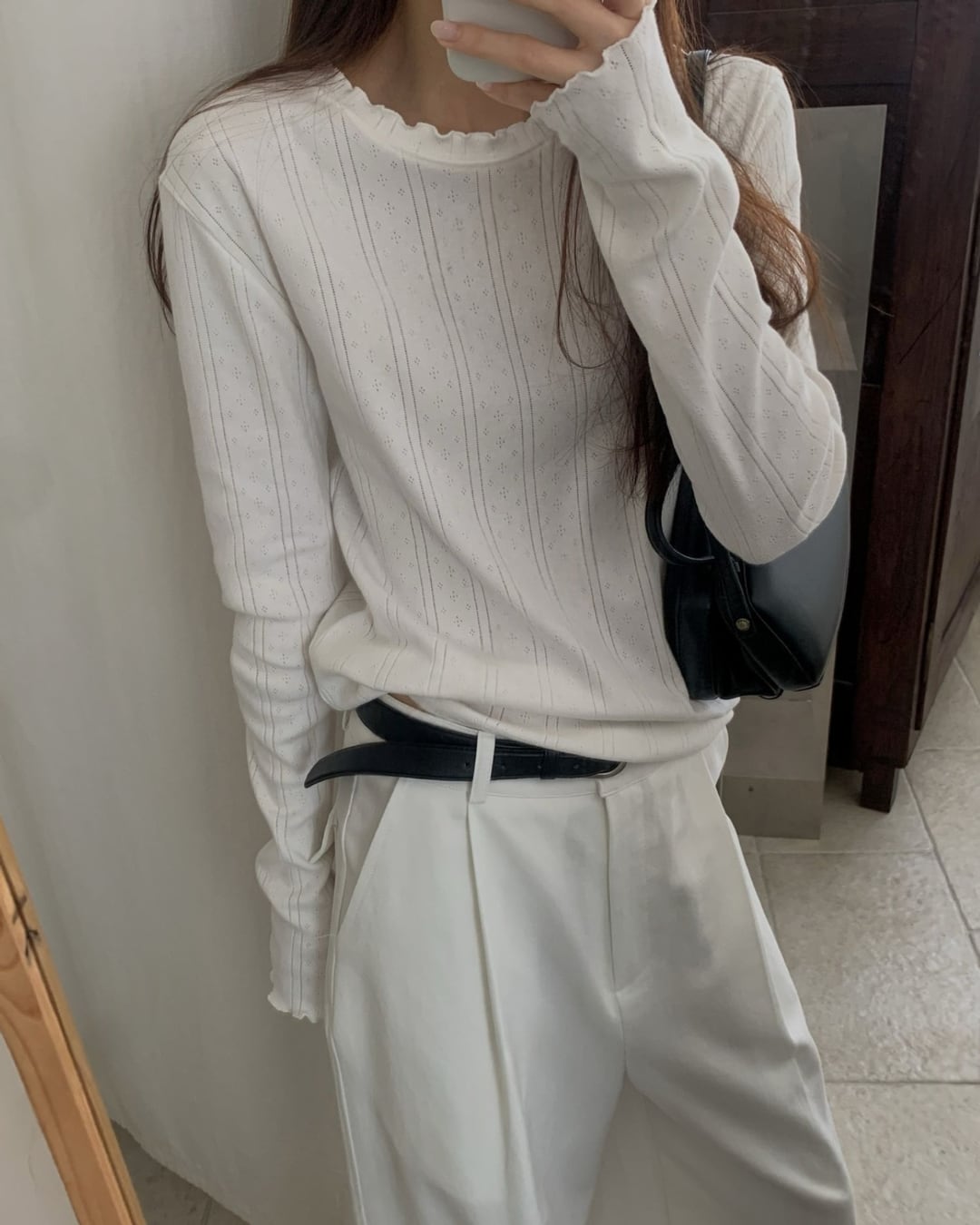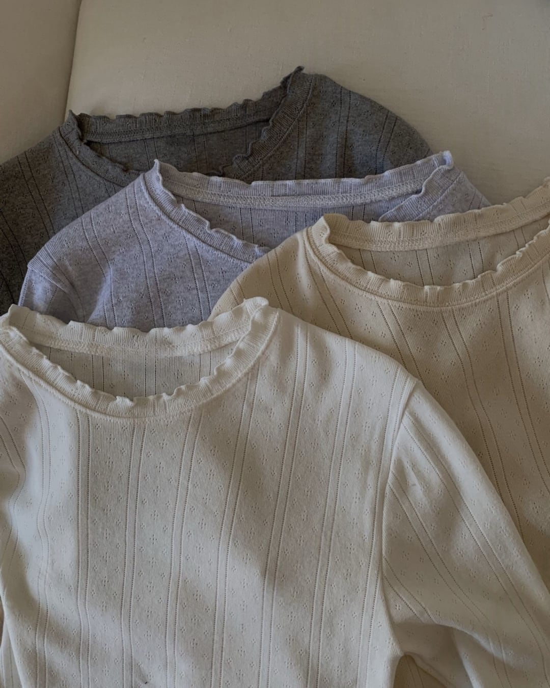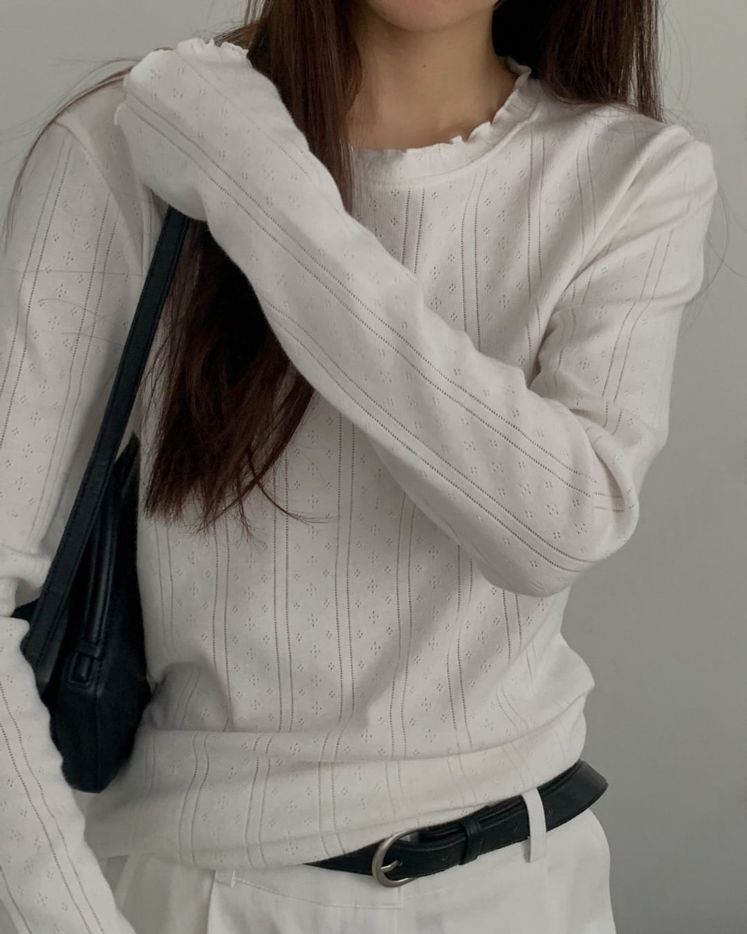 繊細な透かし編みと縦ラインリブが上品な印象を与えるロングスリーブトップス。首元と袖口のメロウデザインがさりげないフェミニンさをプラスし、シンプルながらも存在感のある一枚です。柔らかなコットン素材で肌あたりが良く、程よいフィット感で女性らしいシルエットを演出。薄手の生地感なので、インナーとしても一枚着としても活躍します。