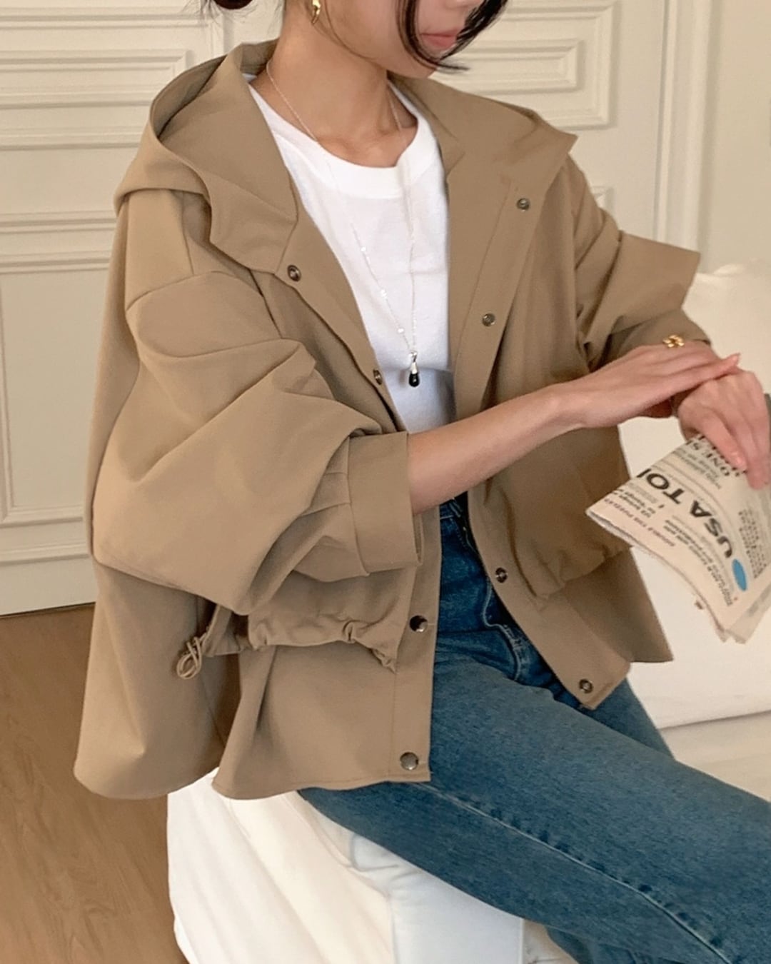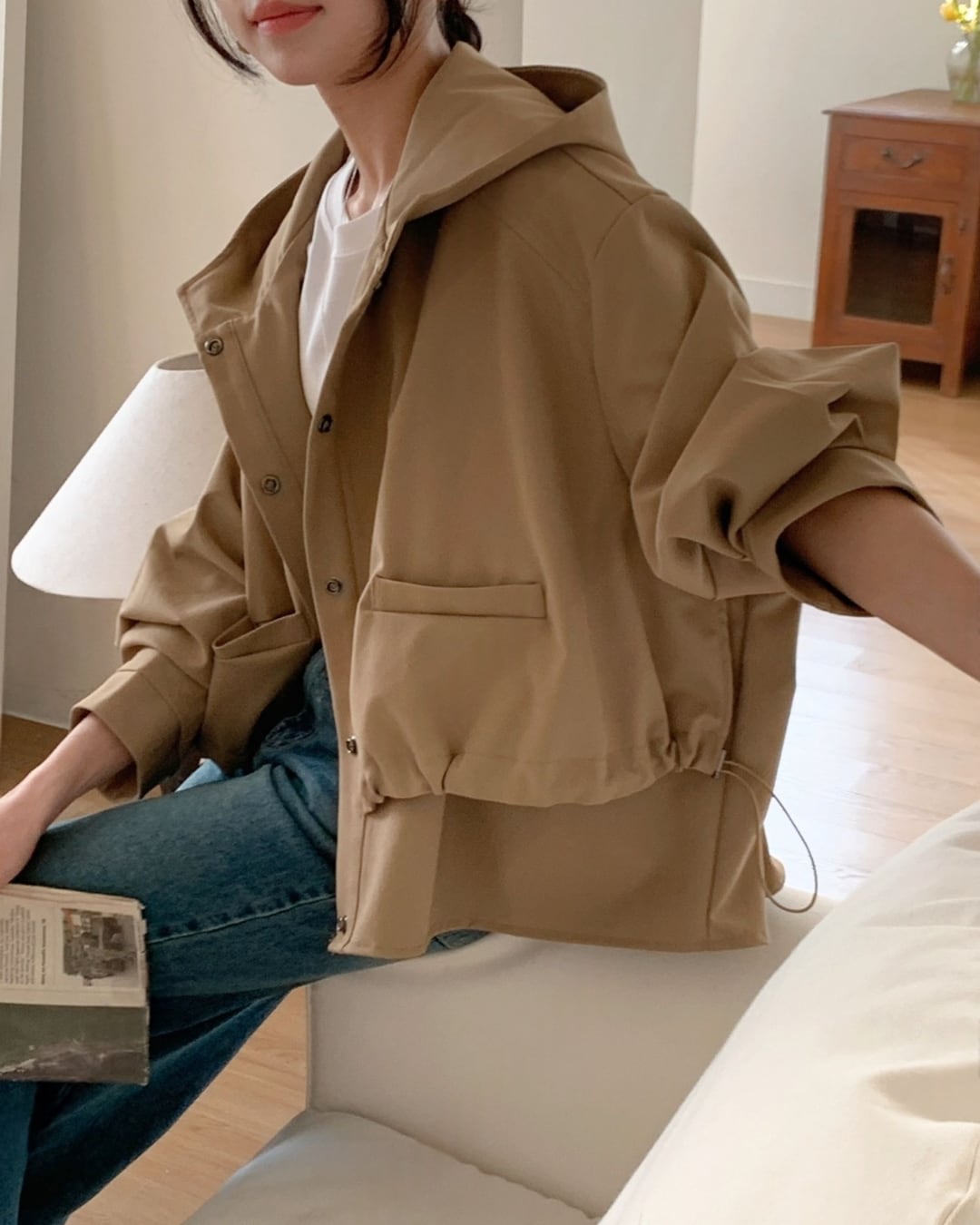 軽やかな着心地でデイリーに活躍するフード付きショートジャケット。ゆったりとしたシルエットで抜け感のある大人カジュアルスタイルに。フロントボタンとドローコードでシルエット調整も可能。パンツやデニムと相性の良い万能ライトアウターです。