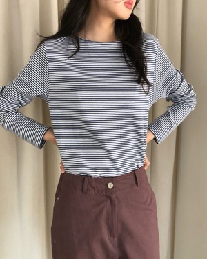 細ボーダーが大人カジュアルな印象の長袖カットソー。すっきりとしたシルエットで一枚でもインナーとしても活躍。柔らかく伸縮性のある素材で快適な着心地。デイリーコーデに取り入れやすい万能トップスです。