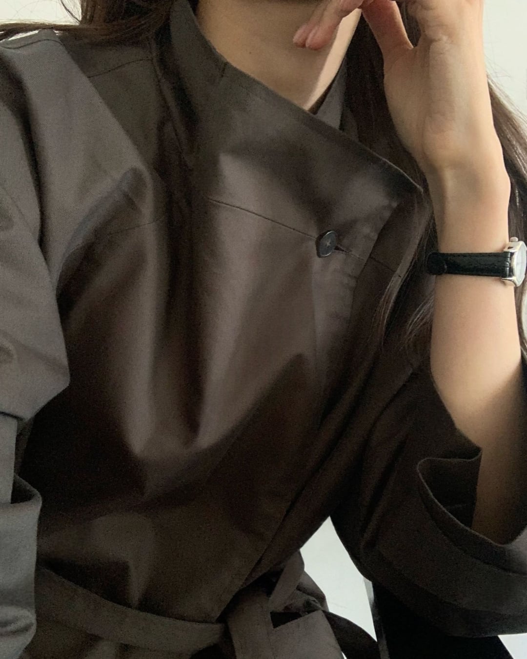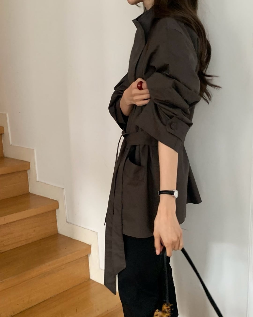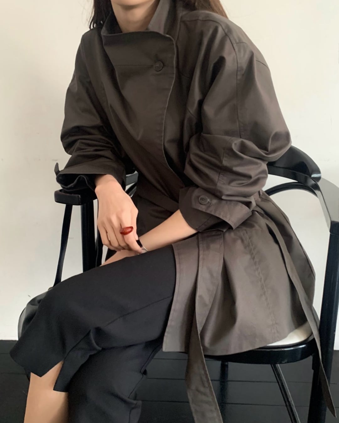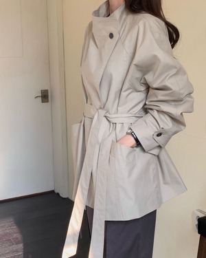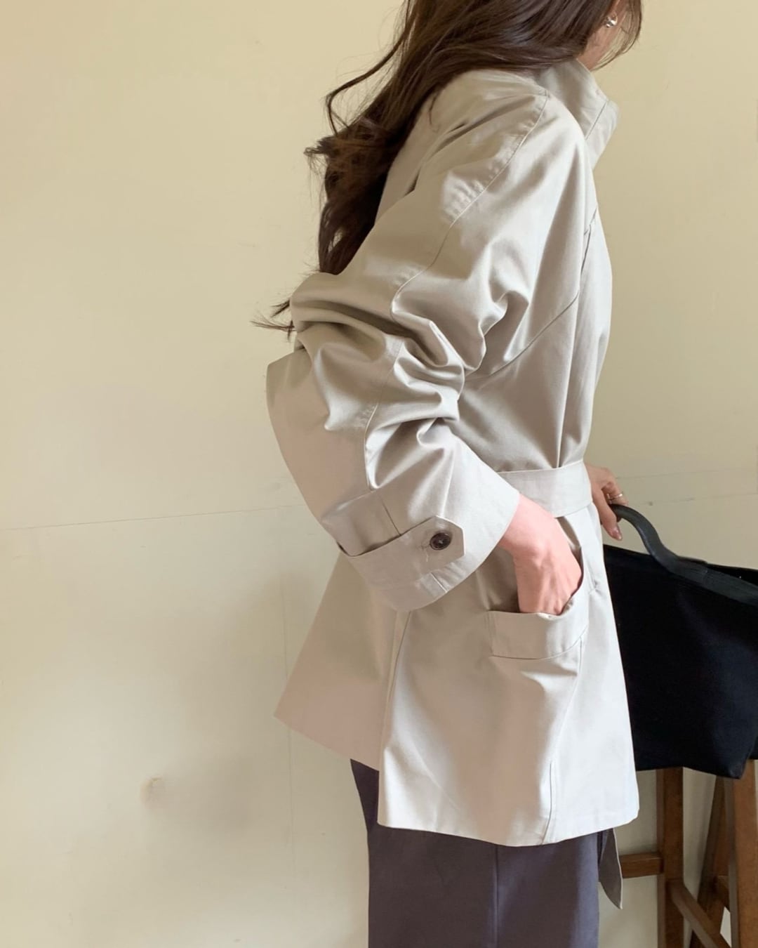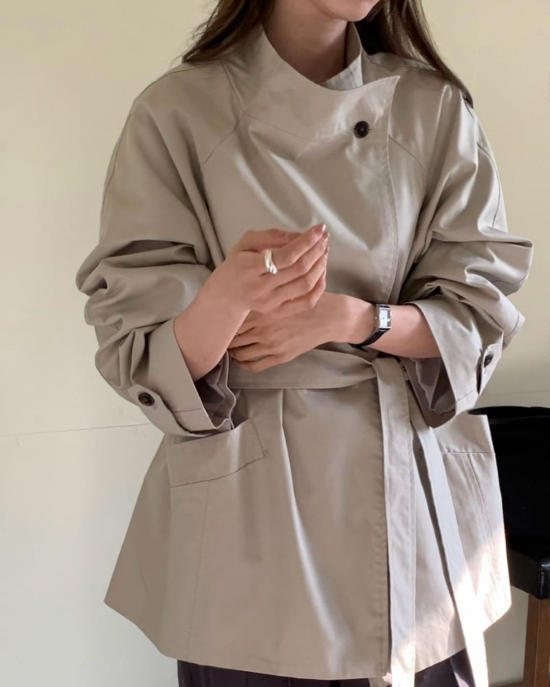 洗練されたスタンドカラーデザインが印象的なショートトレンチコート。ウエストベルトでシルエットを調整でき、メリハリのある女性らしいラインを演出します。程よくハリのある素材感で上品さをプラスし、シンプルながらも存在感のある一着。デイリーからきれいめコーデまで幅広く活躍します。