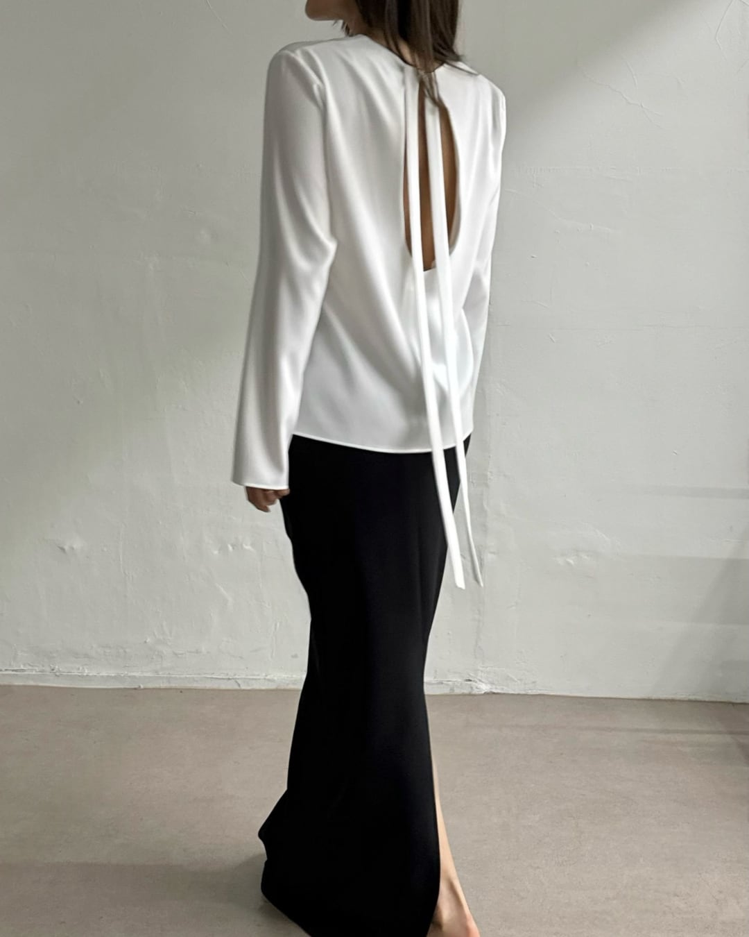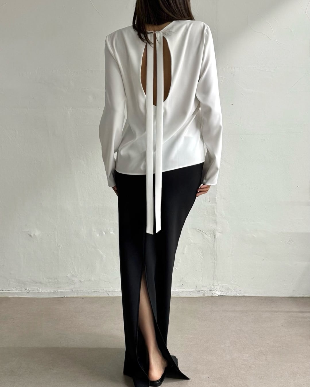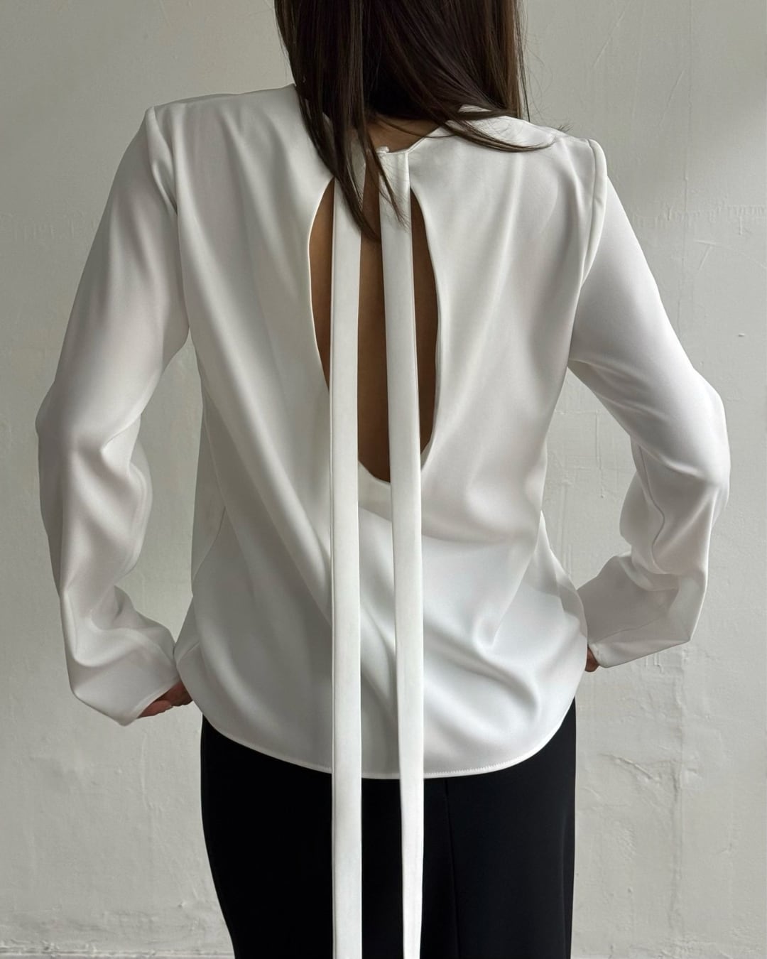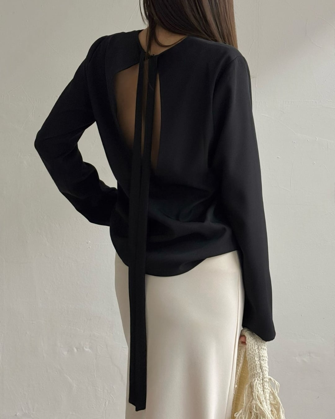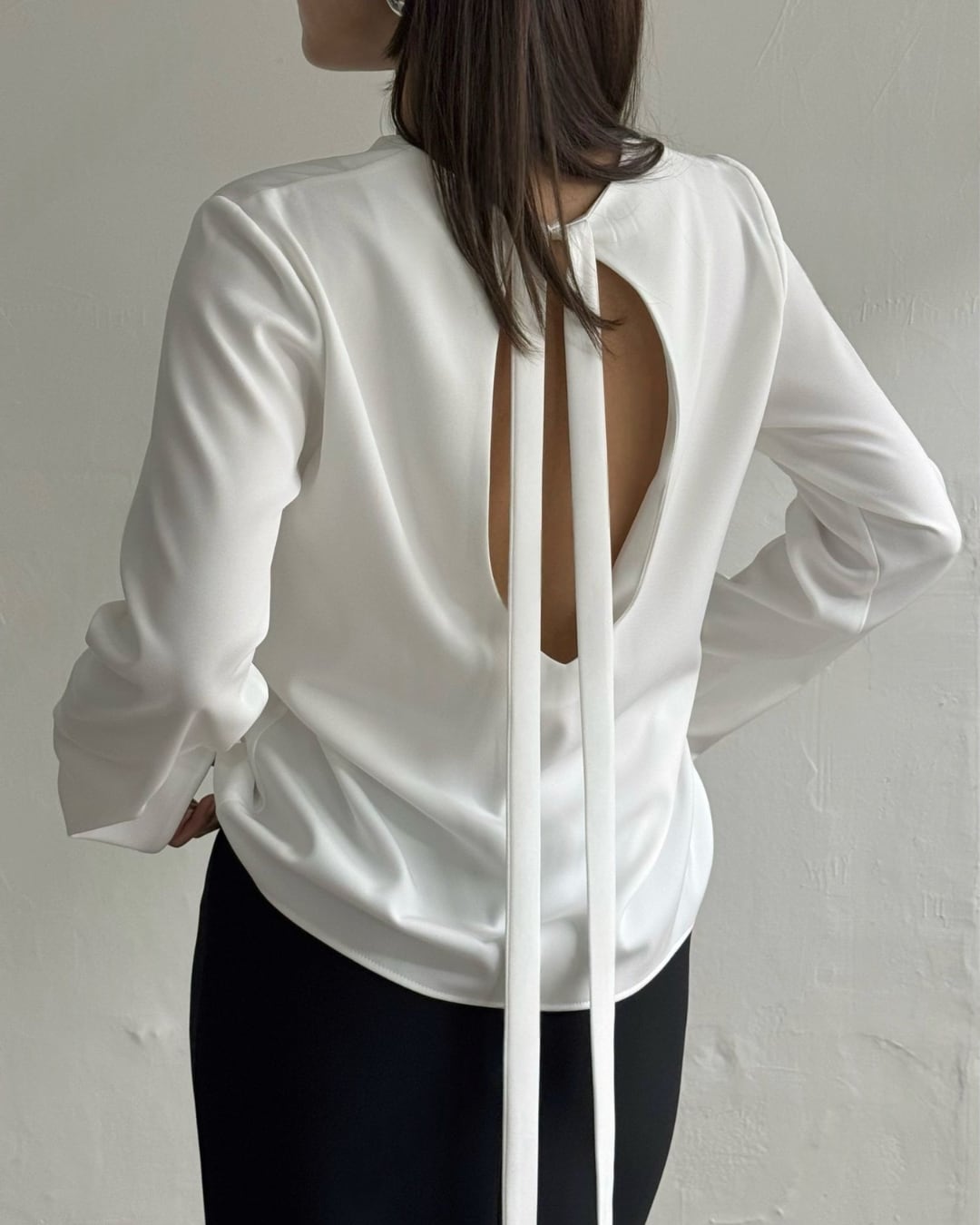 大胆なバックオープンデザインとロングリボンが印象的なブラウス。後ろ姿まで美しく演出し、シンプルながらも洗練された大人の雰囲気を引き立てます。さらりとした素材感で着心地も良く、スカートやパンツと合わせるだけで上品なスタイリングが完成。特別な日からデイリーまで幅広く活躍する一枚です。