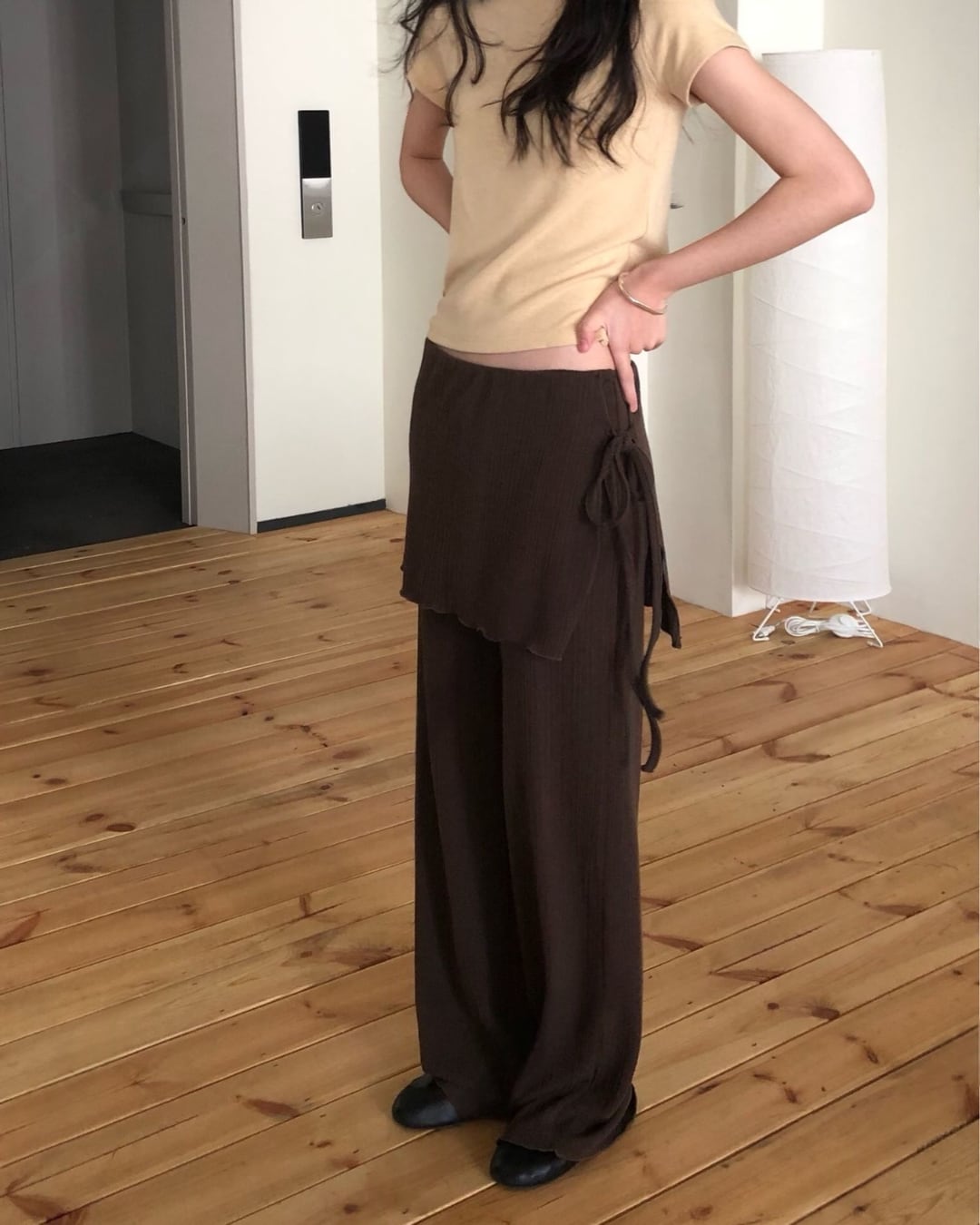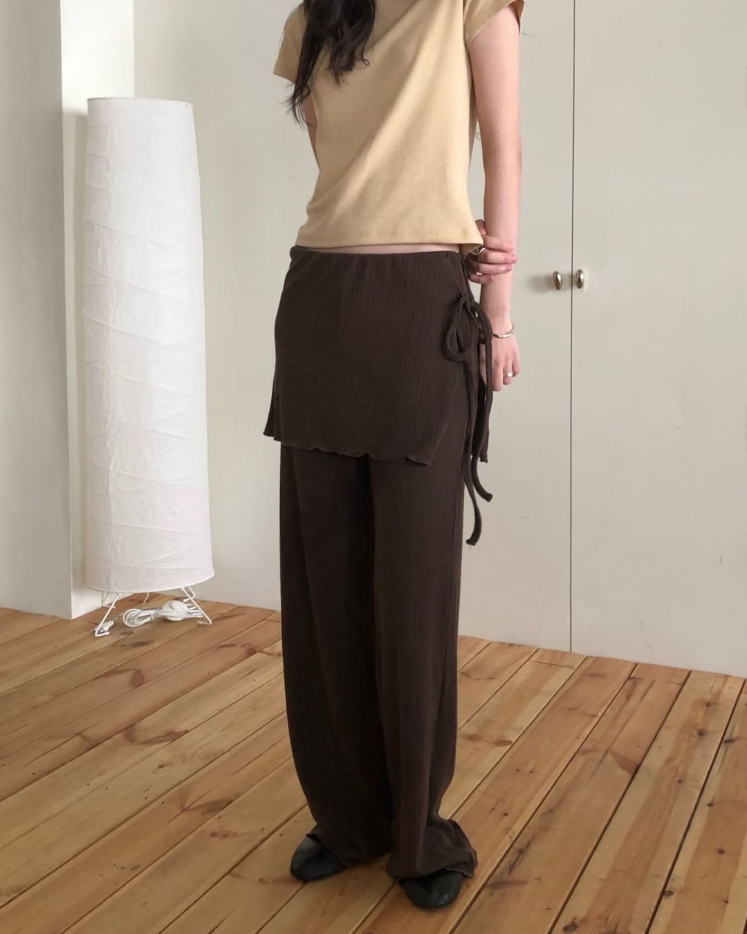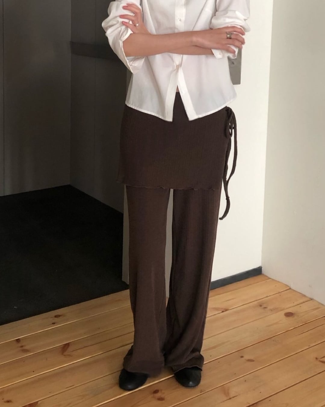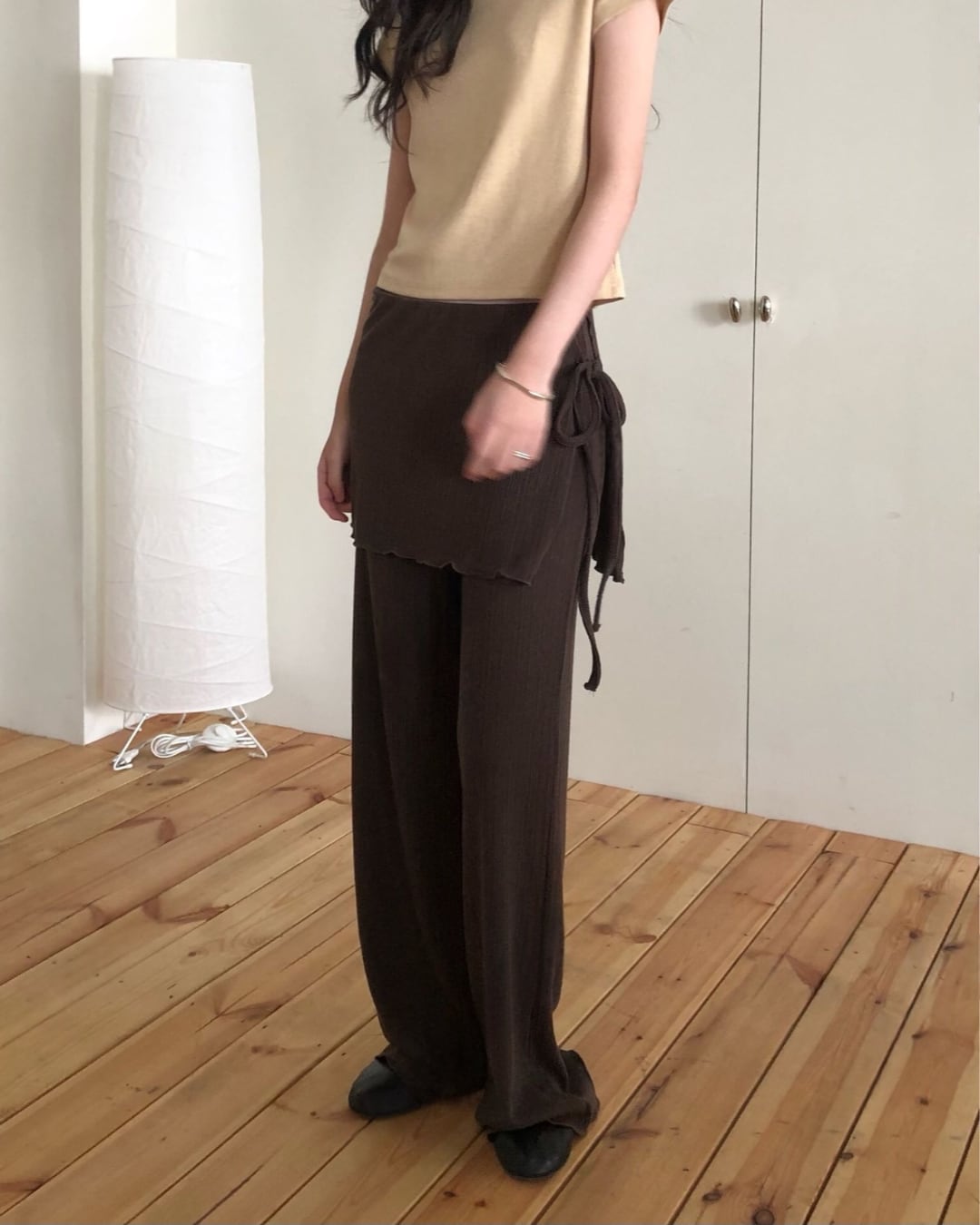 スカートを重ねたようなレイヤードデザインが魅力のワイドパンツ。縦リブ素材が縦ラインを強調し、スタイルアップ効果も抜群。程よく伸縮性のある生地でリラックスした履き心地ながら、こなれ感のある大人カジュアルスタイルを演出します。シンプルなトップスと合わせるだけでトレンド感のあるコーデが完成する一着です。