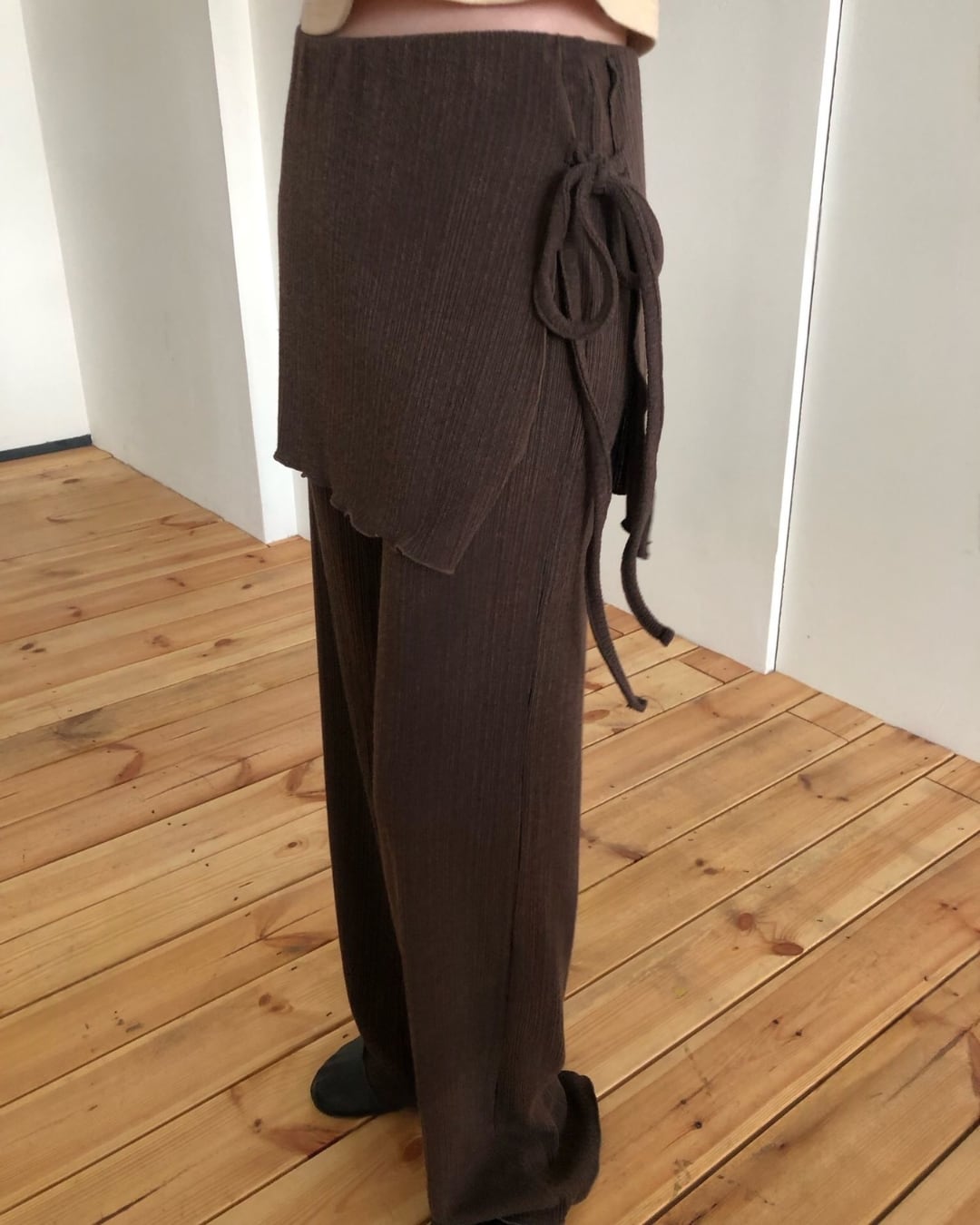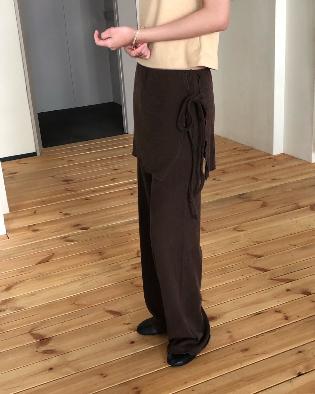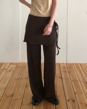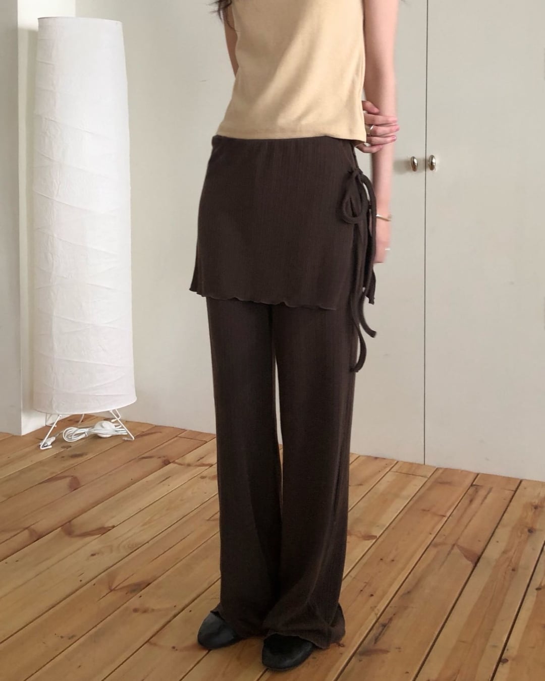 スカートを重ねたようなレイヤードデザインが魅力のワイドパンツ。縦リブ素材が縦ラインを強調し、スタイルアップ効果も抜群。程よく伸縮性のある生地でリラックスした履き心地ながら、こなれ感のある大人カジュアルスタイルを演出します。シンプルなトップスと合わせるだけでトレンド感のあるコーデが完成する一着です。